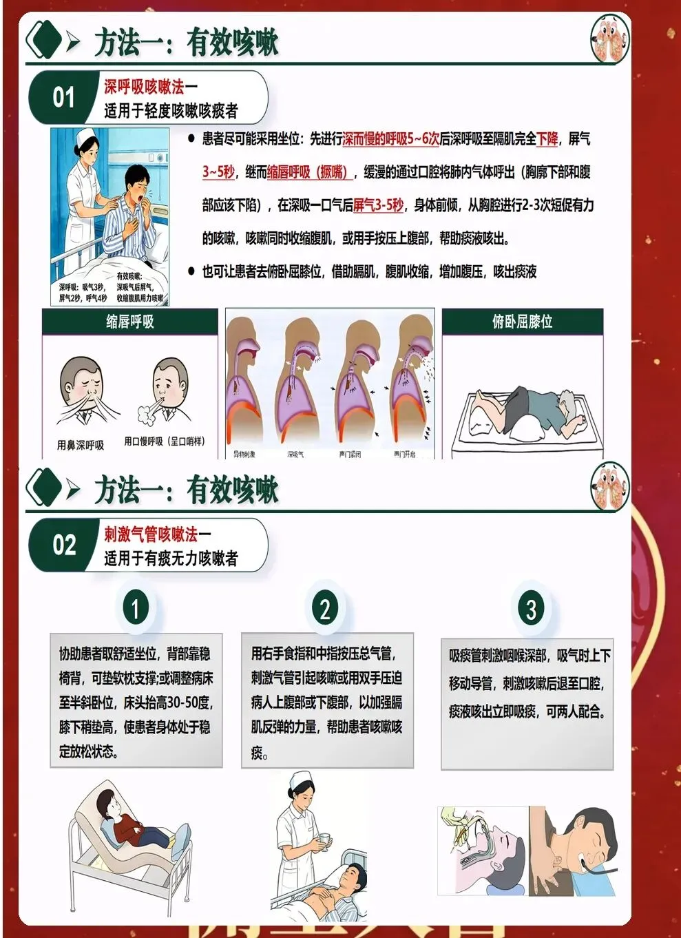 四、有效咳嗽的训练与指导 咳嗽是排痰的自然防御机制,但许多患者因疼痛、虚弱等原因无法有效咳嗽。需要指导患者掌握正确方法:深吸气后屏气3秒,然后用力从肺深处咳出。 对于术后患者,可采用固定胸壁法减轻疼痛。用手或枕头按压切口处,在咳嗽时提供支撑,鼓励患者大胆咳嗽,避免因怕痛而不敢咳嗽。 对于无法自主咳嗽的患者,可采用刺激咳嗽法。按压胸骨上窝或环甲膜,诱发咳嗽反射。人工气道患者可通过吸痰管刺激气道,促进痰液排出。