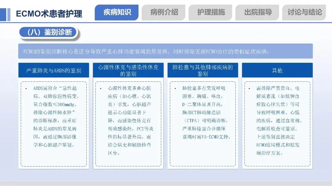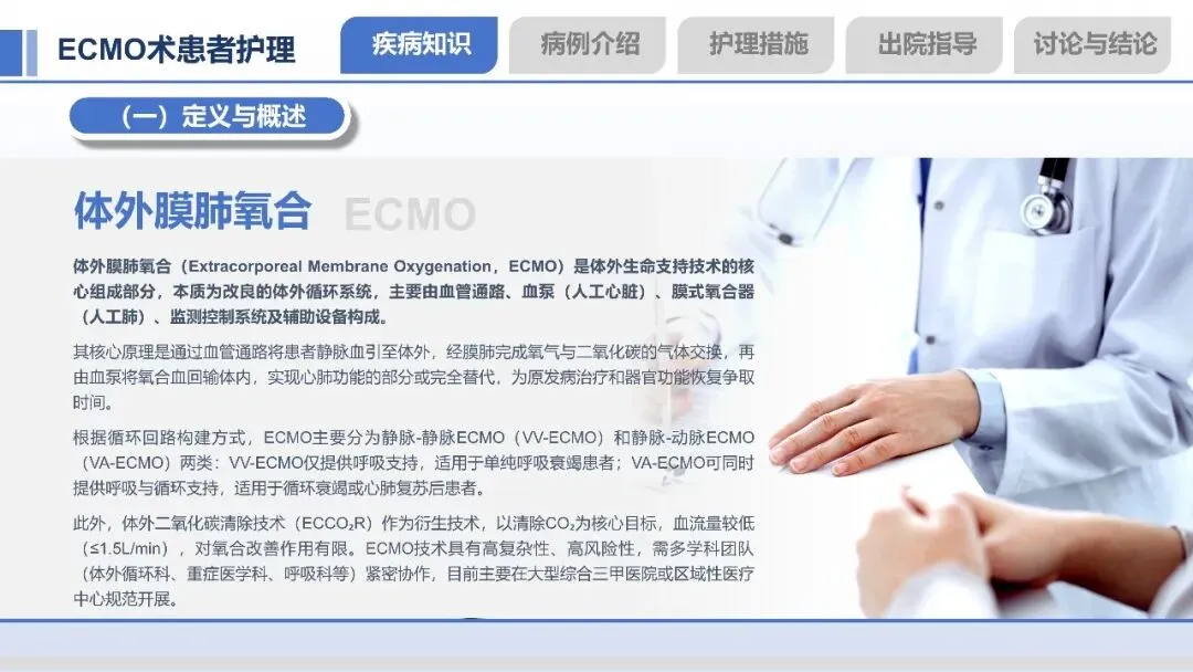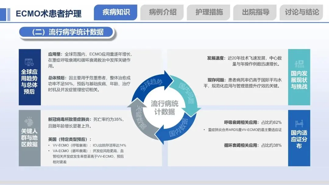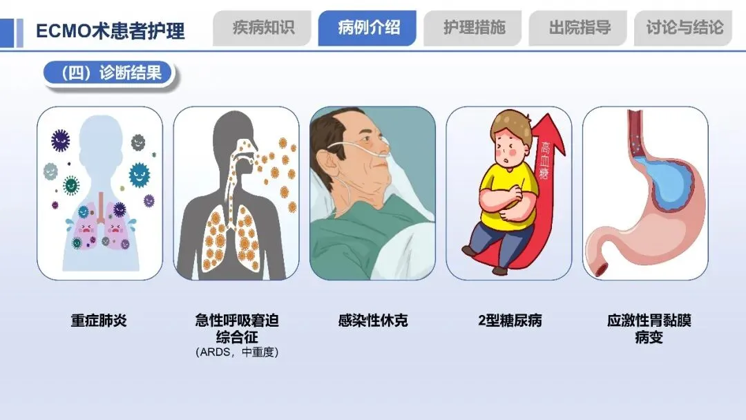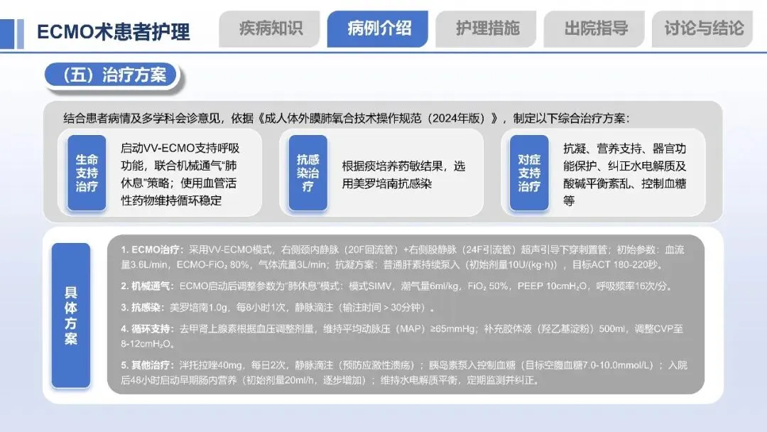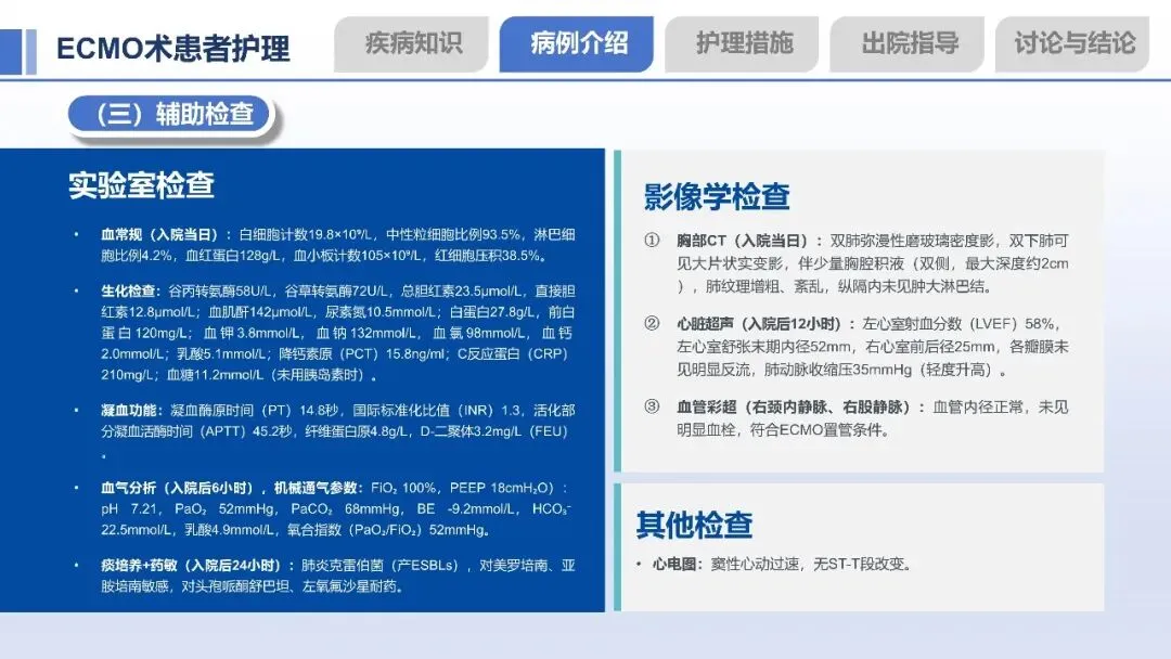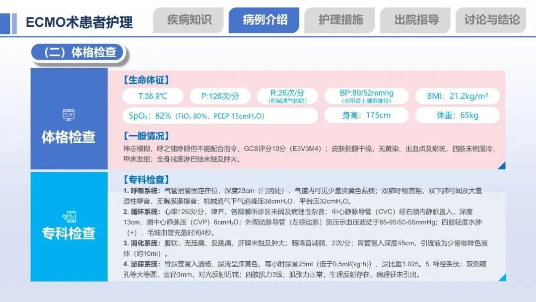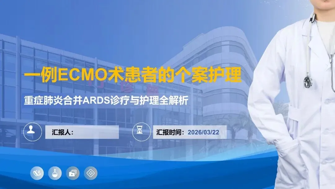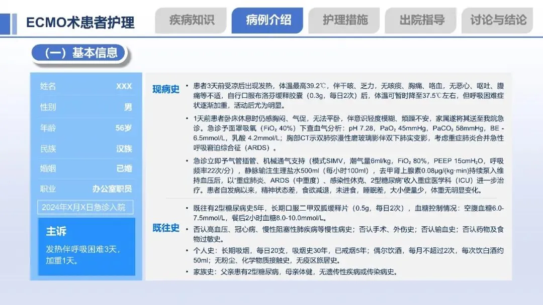 各位同仁大家好,今天分享一例 ECMO 支持下重症肺炎合并 ARDS 患者的个案护理。本例为 56 岁男性患者,病情危重,常规机械通气效果差,紧急启动 VV‑ECMO 支持,联合抗感染、循环维持、营养支持、血糖管控等综合治疗。