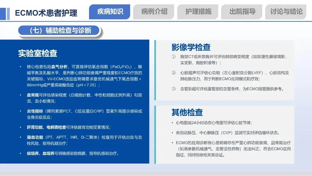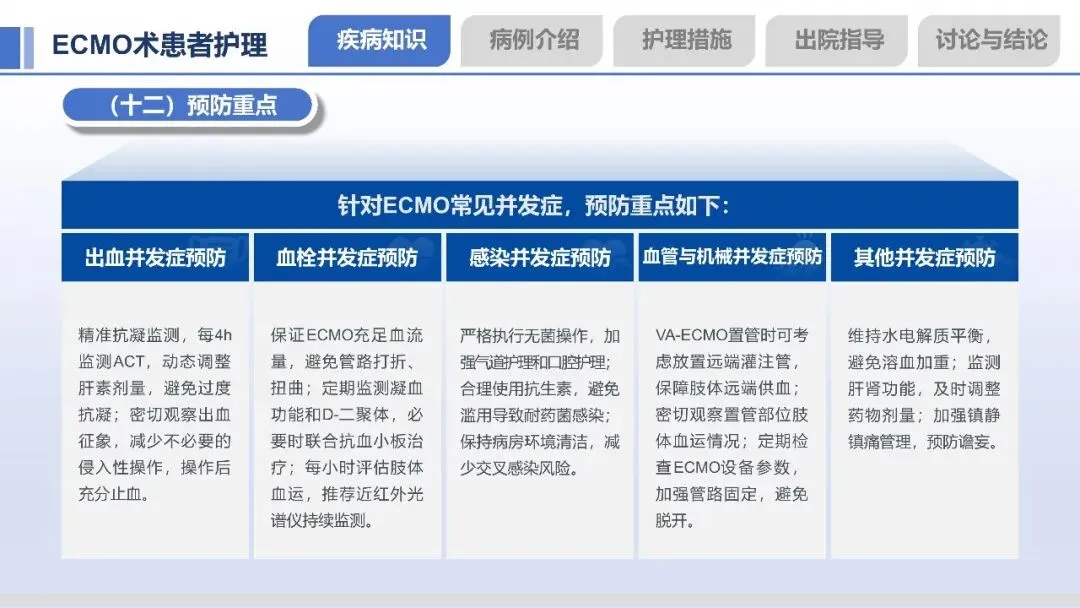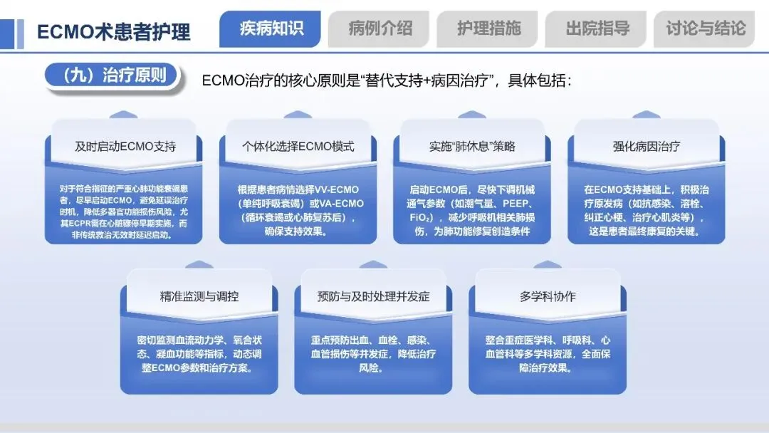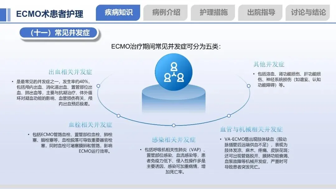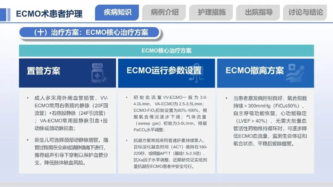护理团队围绕 ECMO 运行监测、抗凝管理、呼吸循环支持、出血血栓防控、感染控制、营养支持、心理干预及康复指导实施精细化护理。重点做好管路管理、ACT 精准监测、气道护理、肢体血运观察及并发症预防,确保设备安全稳定运行。