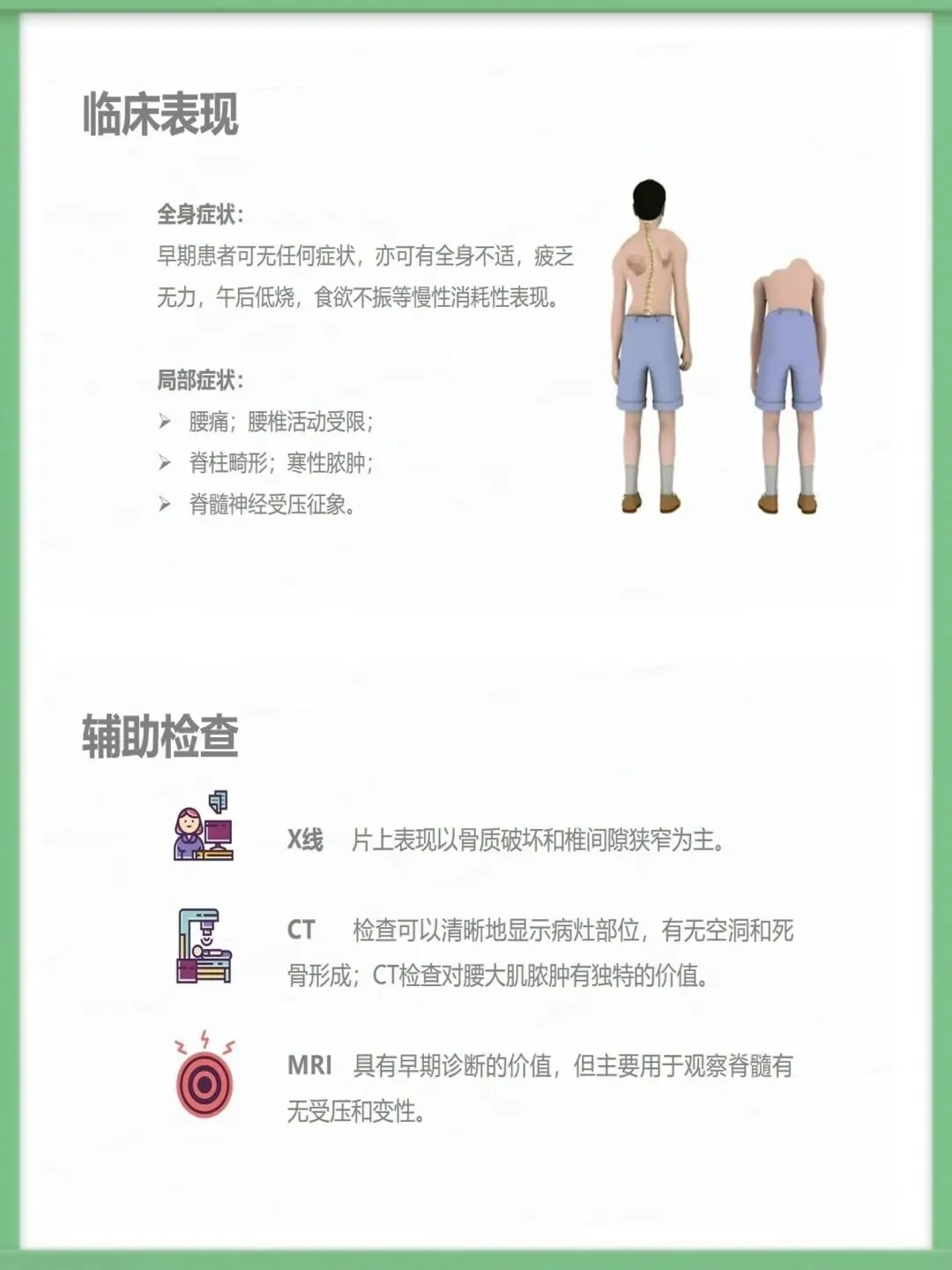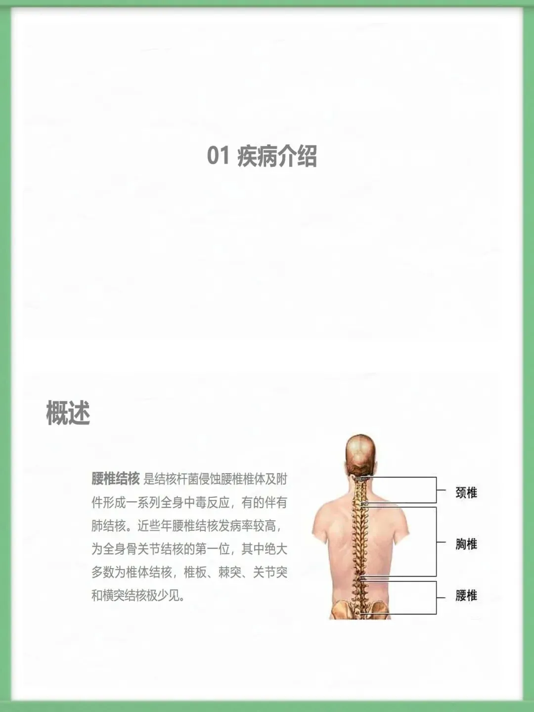 各位同仁,大家好。今天为大家讲解腰椎结核的围手术期护理相关内容。腰椎结核为全身骨关节结核首位,多为椎体结核,有午后低热等全身消耗症状及腰痛、脊柱畸形等局部症状,辅以影像学检查可明确诊断,治疗分非手术与手术两类。