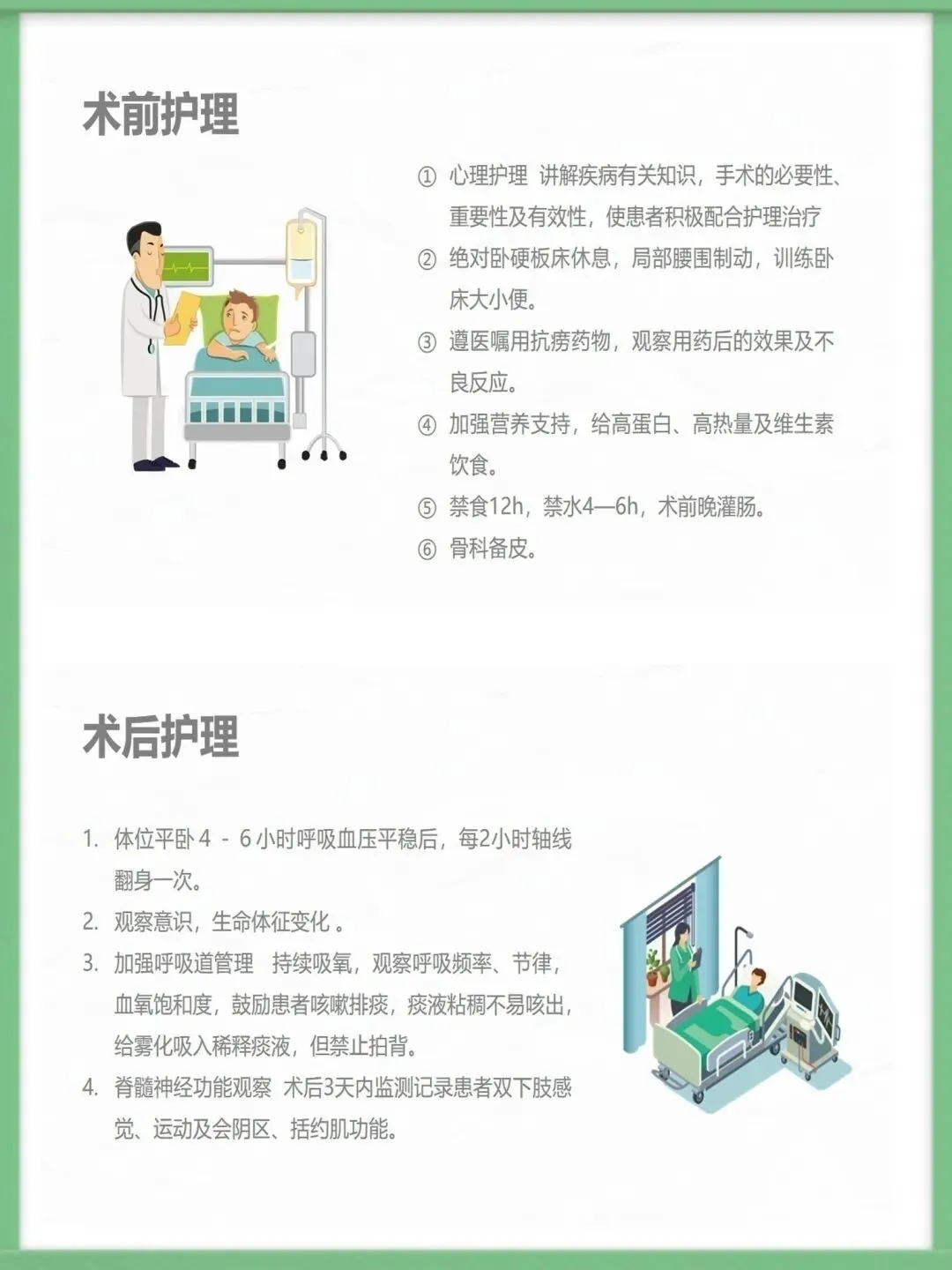 术后护理注重细节与监测,待生命体征平稳后轴线翻身,密切监测意识、生命体征及脊髓神经功能,做好引流管、呼吸道管理,循序渐进指导饮食与功能锻炼,同时预防各类术后并发症。