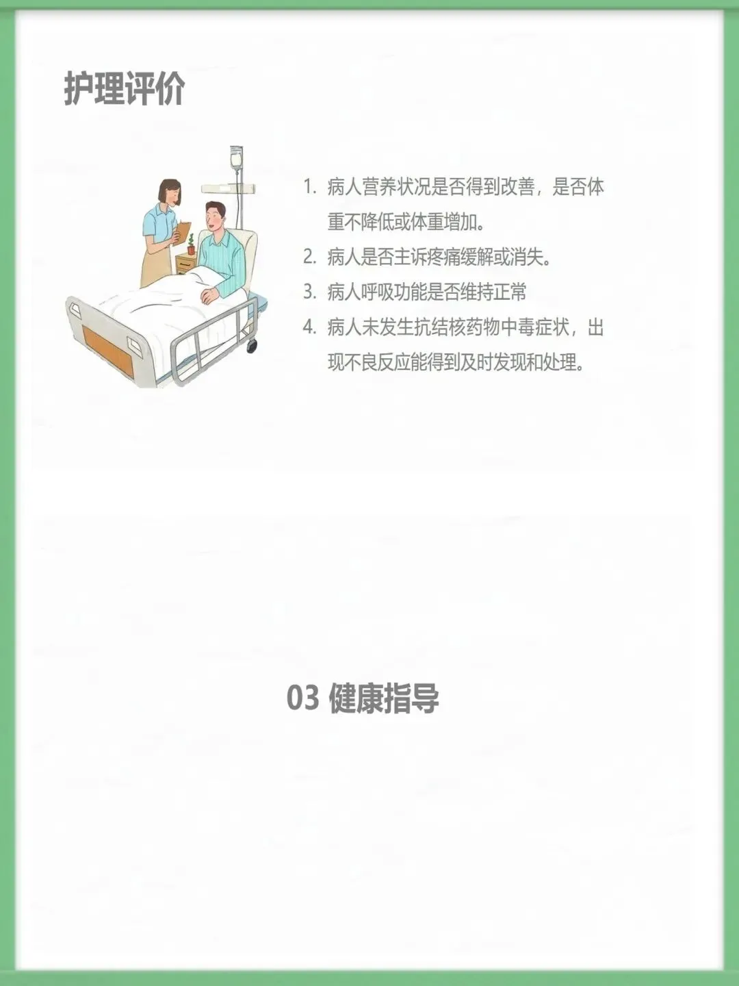 术前护理需多维度开展,做好心理疏导提升患者配合度,嘱患者卧硬板床并训练卧床排便,遵医嘱用抗痨药并观察反应,加强营养支持,同时完成禁食、备皮等术前常规准备工作。