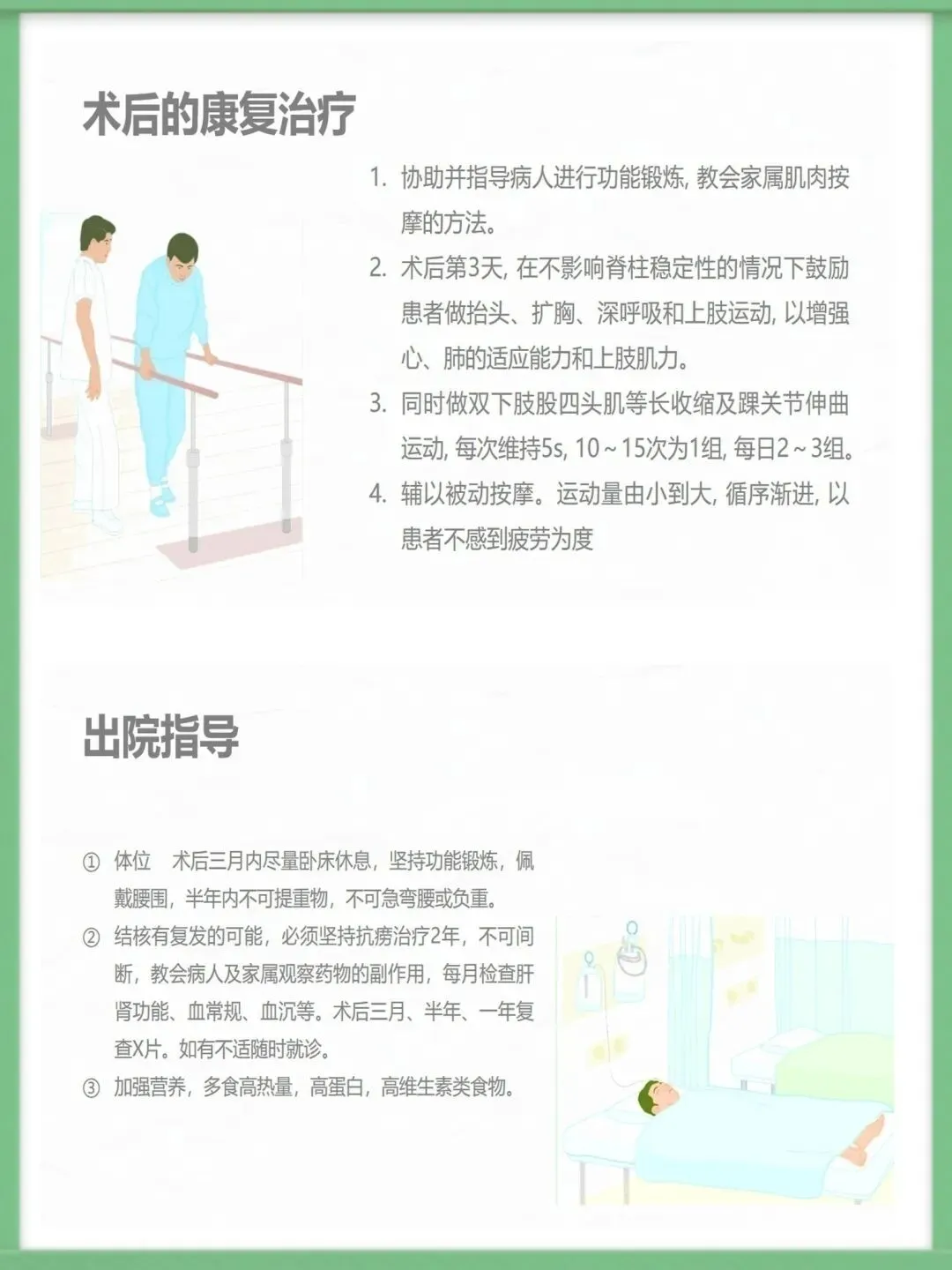 围手术期的健康指导至关重要,术后逐步指导患者开展功能锻炼,出院后嘱其遵医嘱卧床、佩戴腰围,坚持2年抗痨治疗,定期复查肝肾功能与影像学检查,加强营养并避免重体力劳动。