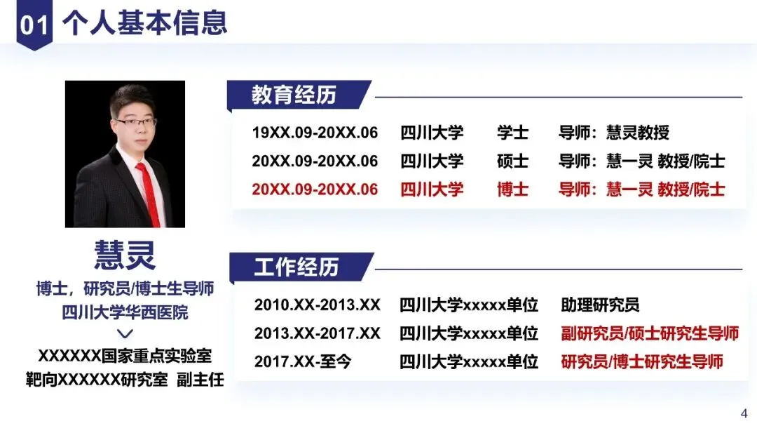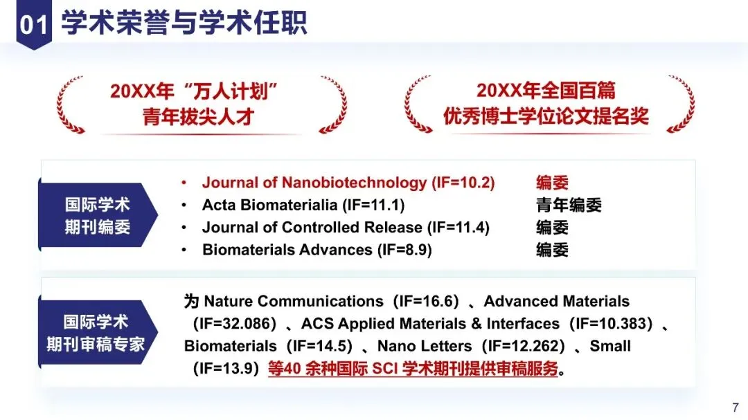 精选高含金量荣誉(如人才称号、省部级科技奖励),学术任职突出“行业影响力”(如核心期刊编委、XX会议主席)。