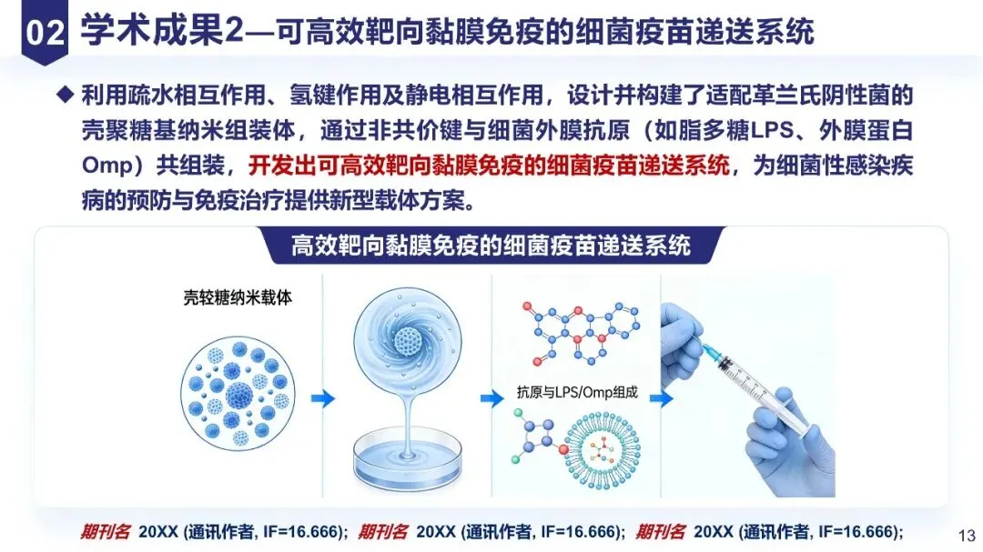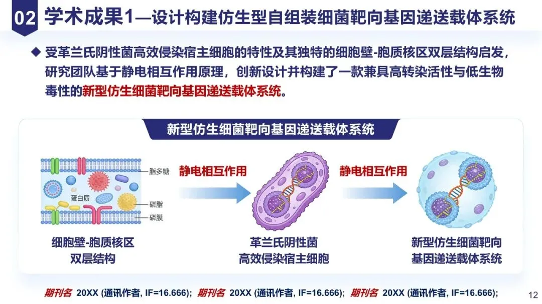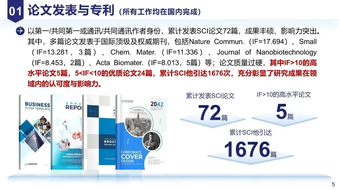 突出“创新性和价值”:分点呈现核心成果(如“首次提出XXX概念”“建立XXX技术方法”),结合数据说明突破(如“灵敏度提升100倍”),体现与同行的差异。