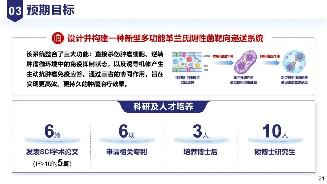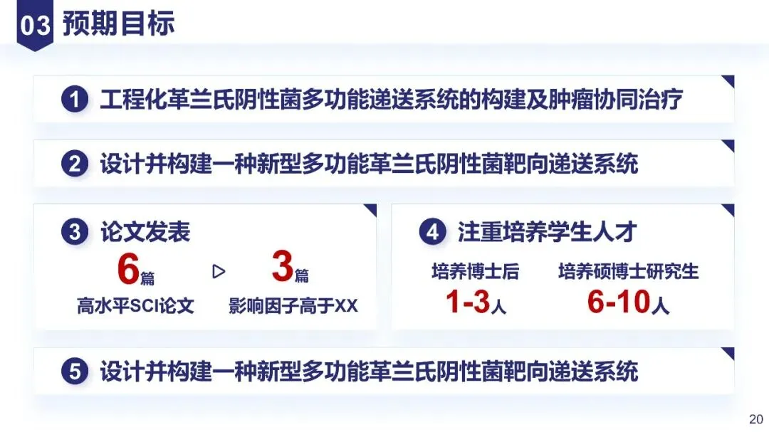 量化可考核,分层次呈现(如“1. 阐明XXX机制,发表顶刊论文3-4篇;2. 申请发明专利2项;3. 培养青年科研人员2-3名”),避免模糊表述。