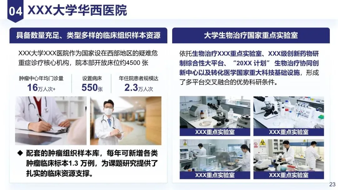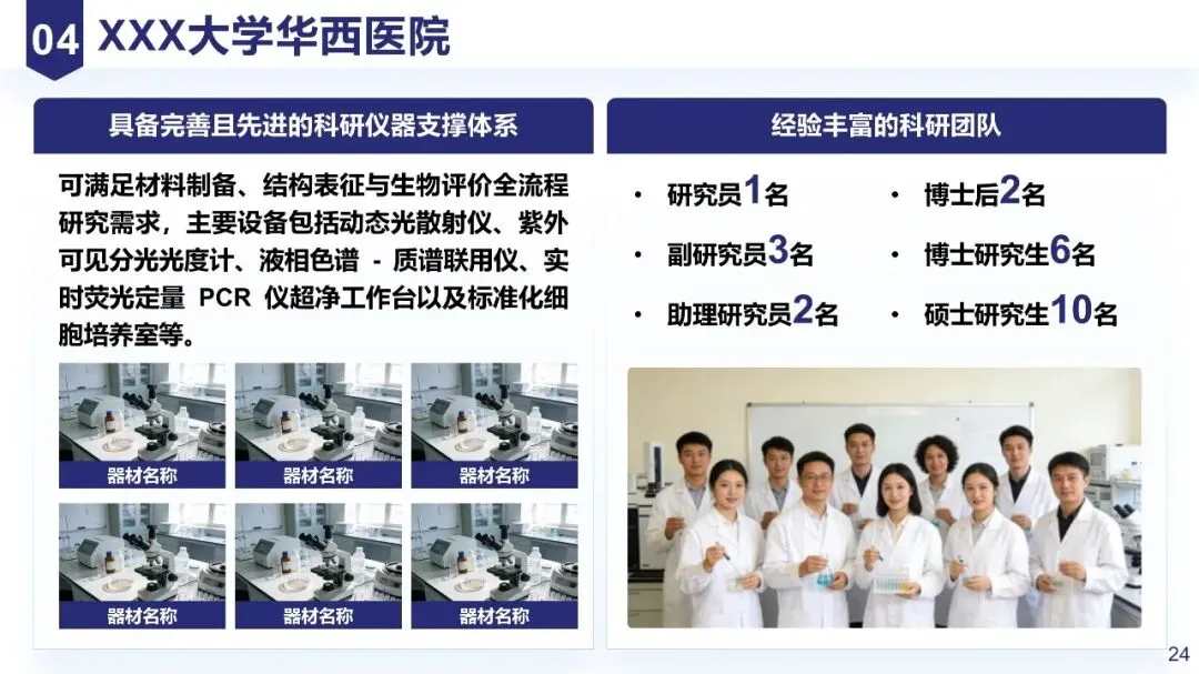 介绍依托的实验室平台(如“依托XX国家级重点实验室,具备XX实验条件,可满足细胞实验、分子实验等核心需求”),体现平台的支撑能力。