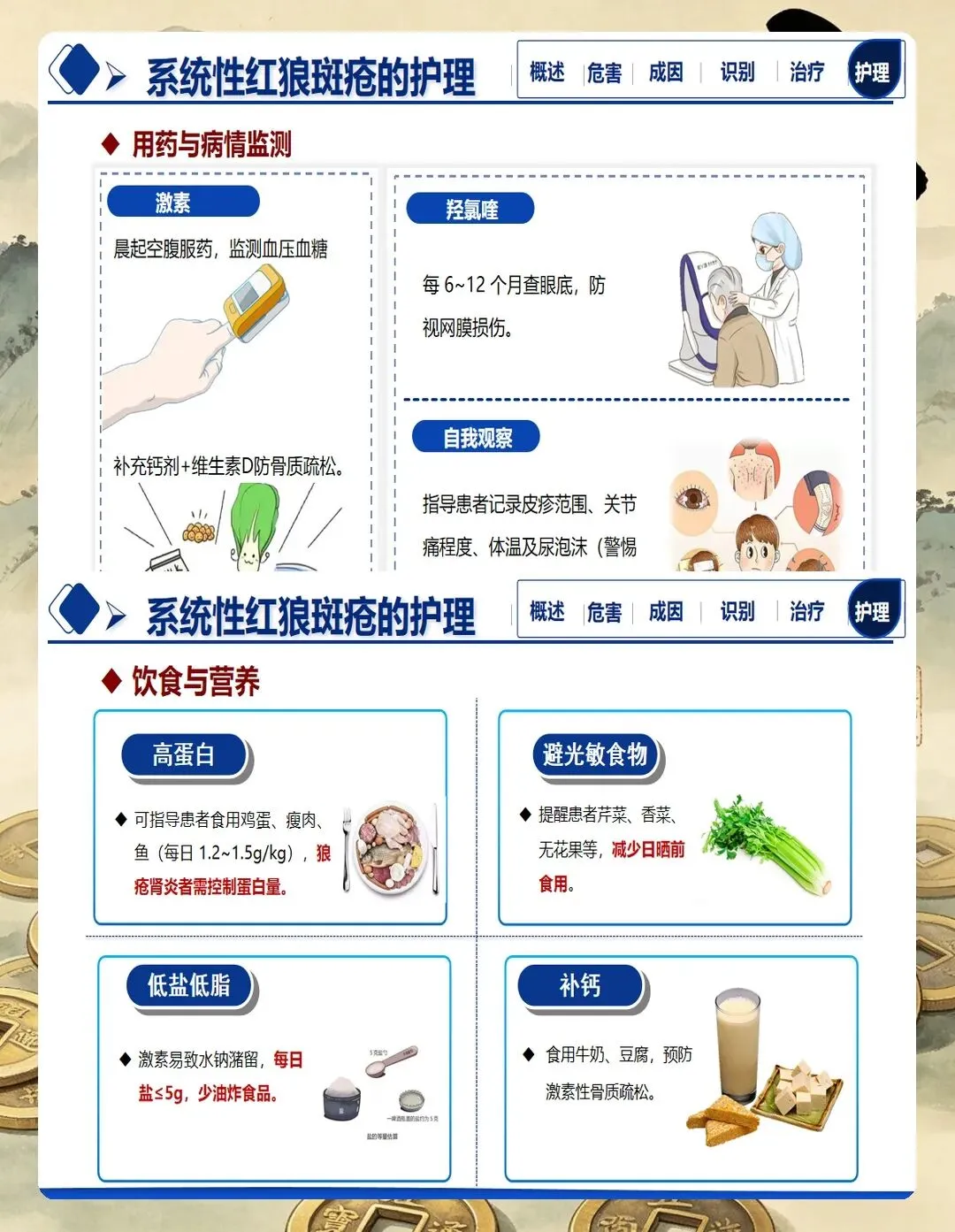 肾脏受累评估:观察尿液颜色、性状,记录24小时尿量。定期监测尿常规,关注尿蛋白、红细胞、管型等指标。监测血压变化,警惕狼疮性肾炎所致高血压。评估有无水肿,记录水肿部位及程度。