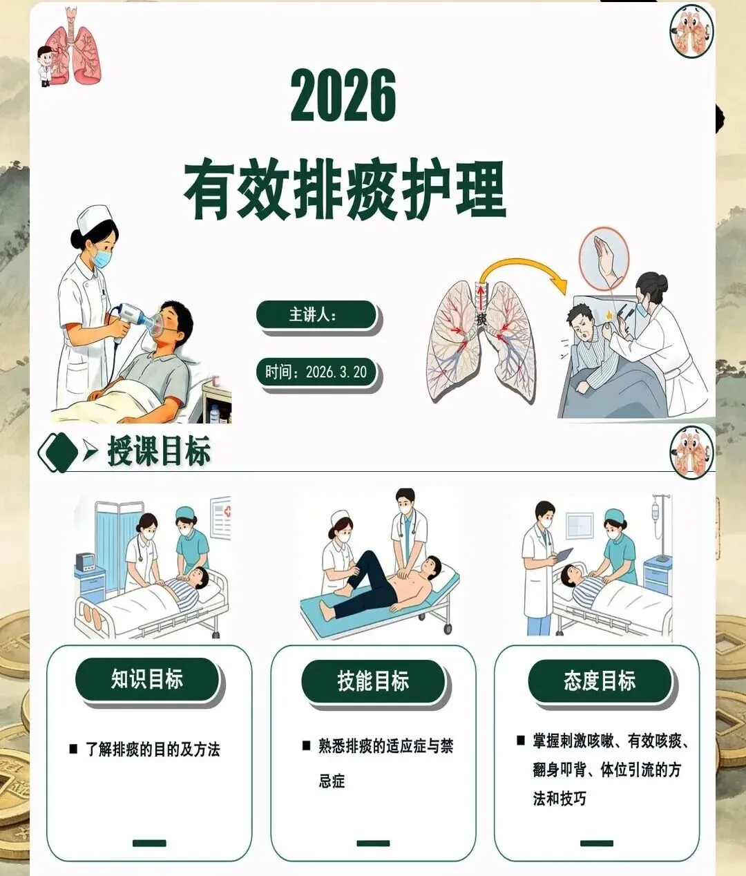 排痰是呼吸道管理的重要环节,痰液滞留可导致气道阻塞、通气功能障碍、肺部感染迁延不愈,严重者可引发肺不张、呼吸衰竭。有效排痰护理旨在通过系统的评估、科学的干预、规范的技术,促进呼吸道分泌物排出,改善通气功能,预防和控制肺部感染。