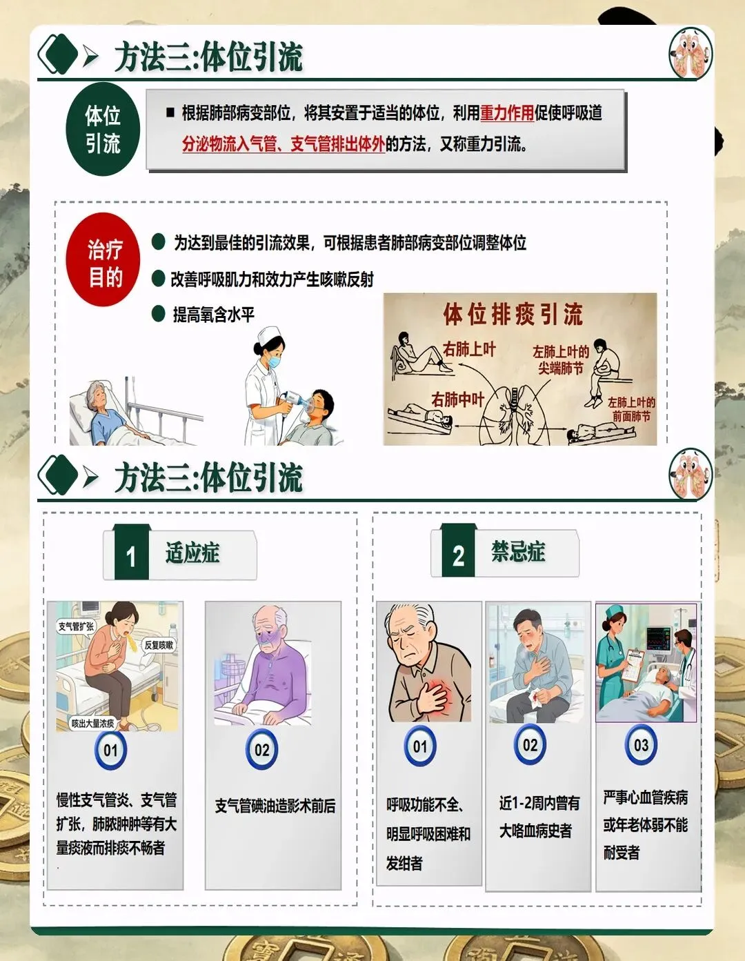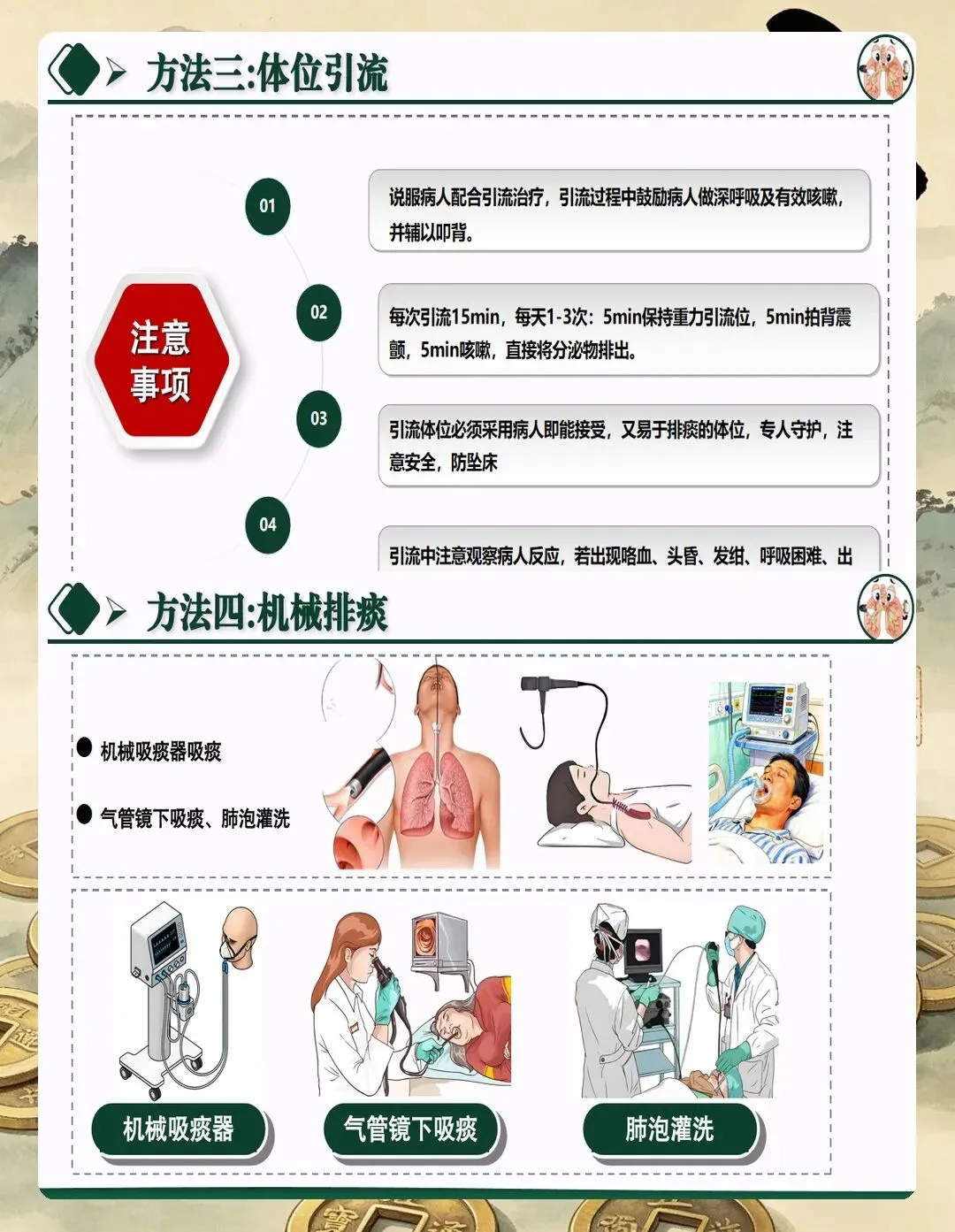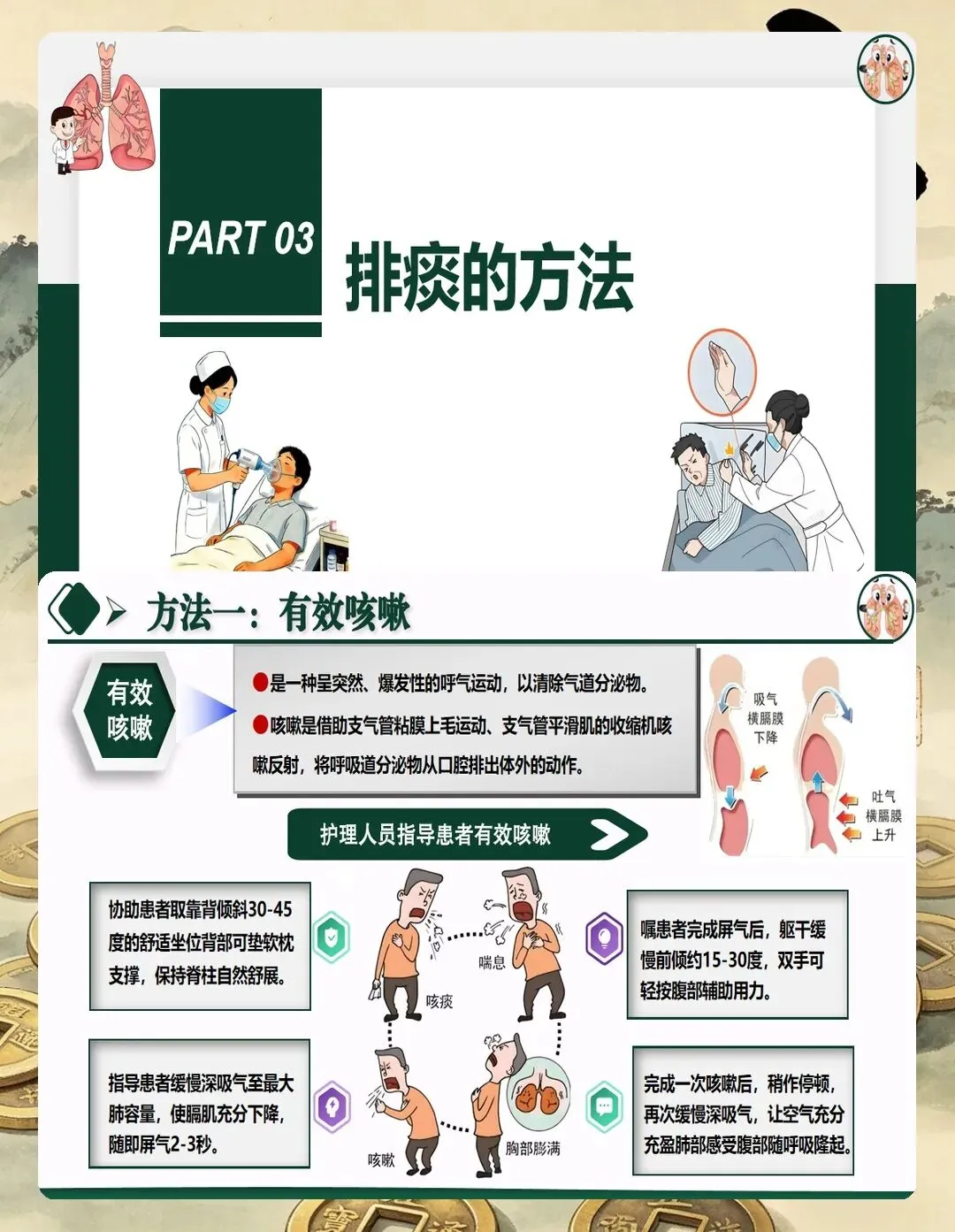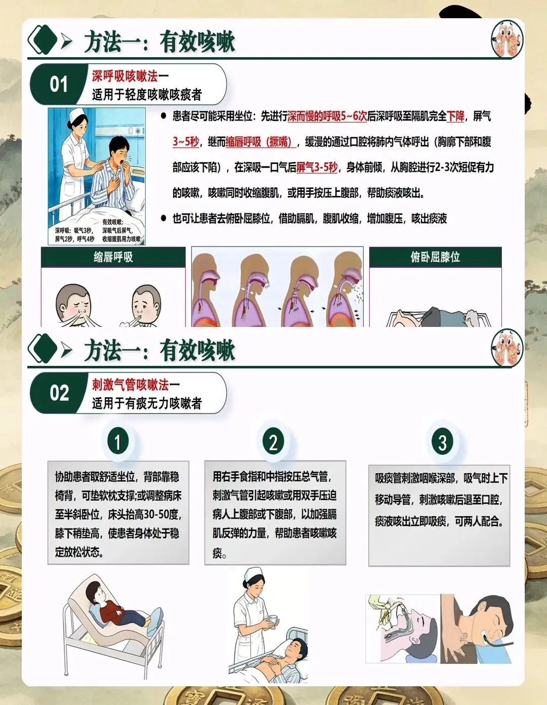 有效咳嗽是排痰的核心手段,需指导患者掌握正确的咳嗽方法。