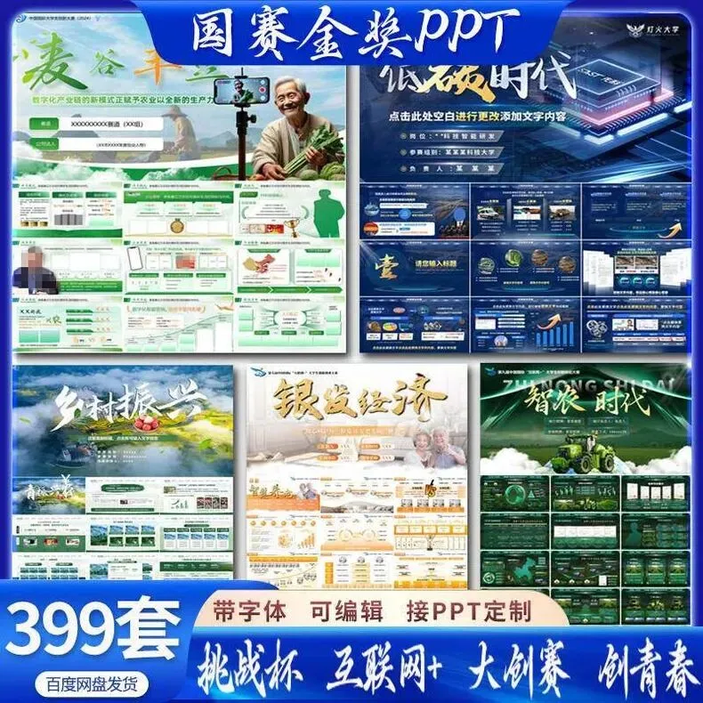 为参加创新创业大赛的小伙伴们整理了399套金奖PPT模板,全部带字体可编辑,涵盖挑战杯、互联网+等各类比赛。全网整理分享,无任何额外费用,快来免费获取吧!