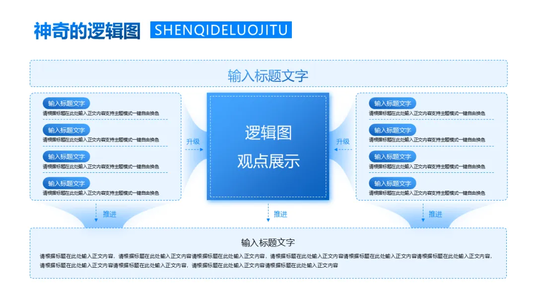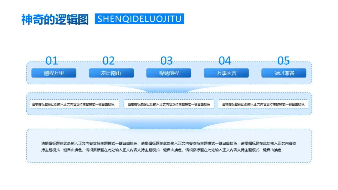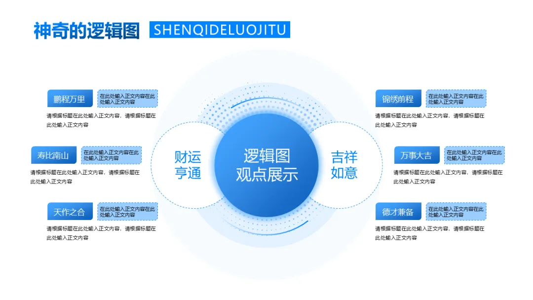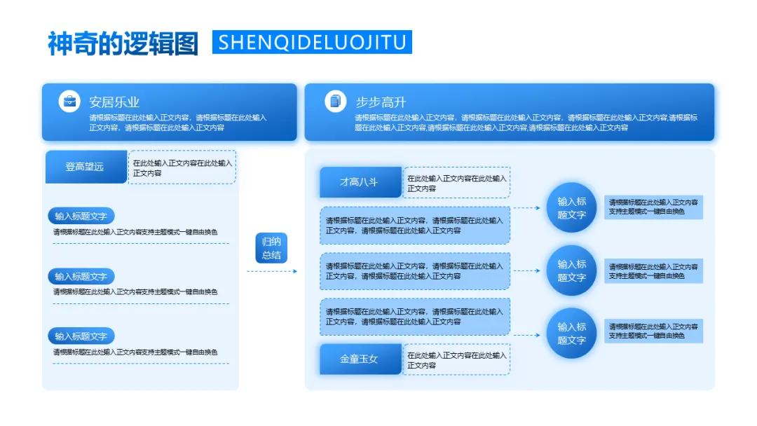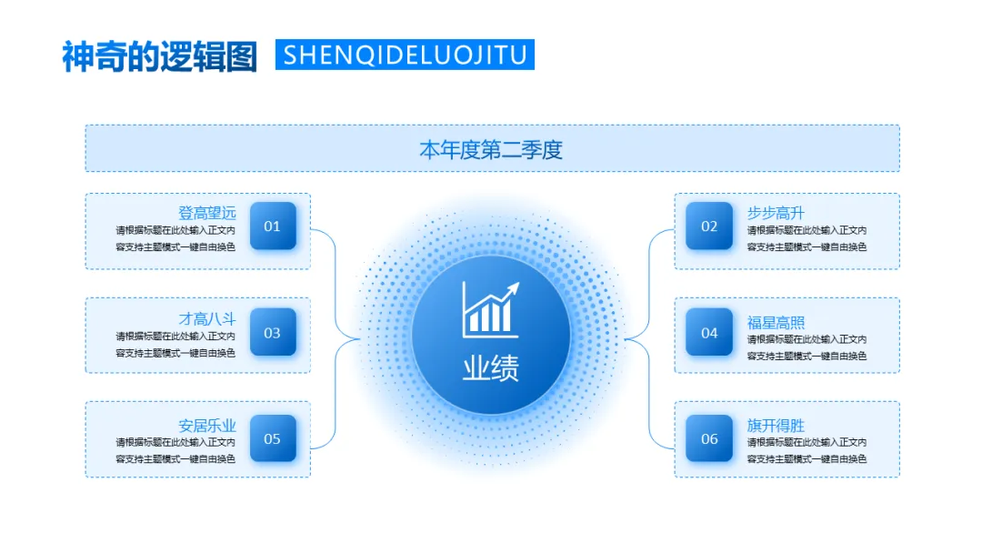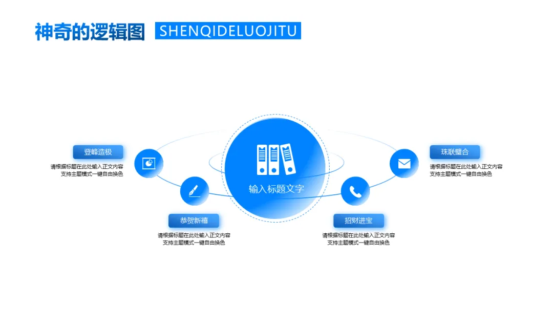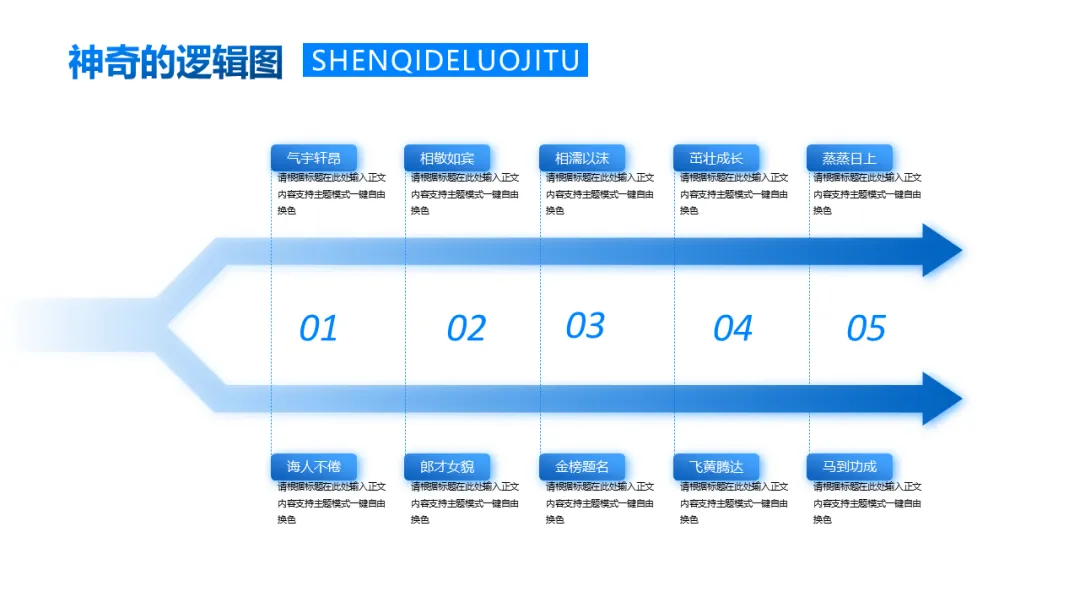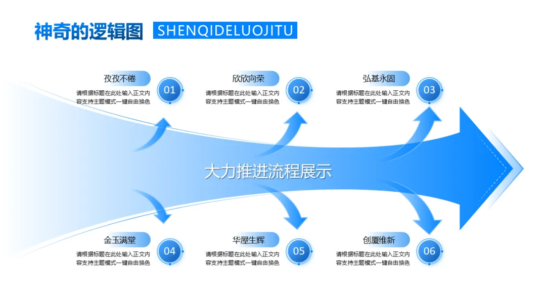 本材料首先是一套强大的 “逻辑可视化工具箱” 。其中大量页面以“神奇的逻辑图”为统一标题,并配以“登高望远”、“旗开得胜”、“鹏程万里”等吉祥话作为板块标题。这些页面本质上是高度模块化的图形模板,预留了“输入标题文字”、“请根据标题在此处输入正文内容”等占位符。它们展示了如何运用时间轴、递进关系、循环流程、中心辐射、对比矩阵等多种图形逻辑来组织信息,适用于构建企业发展历程、工作推进流程、PDCA循环、组织架构、关键里程碑等陈述性内容。其突出特点是支持“一键自由换色”和素材任意编辑,强调了其在商业演示中的实用性与灵活性。