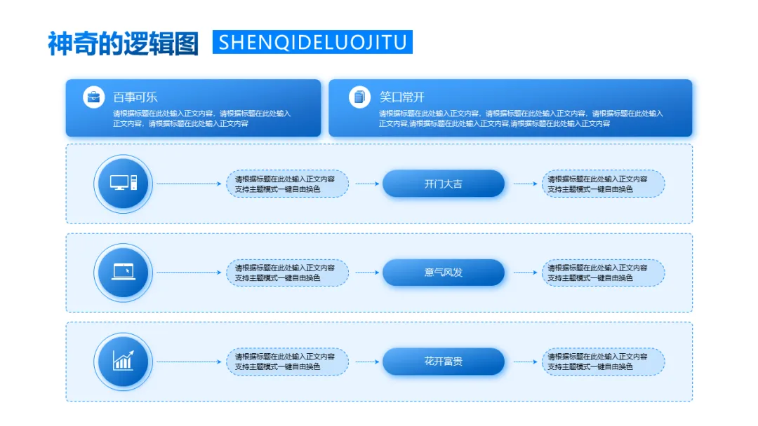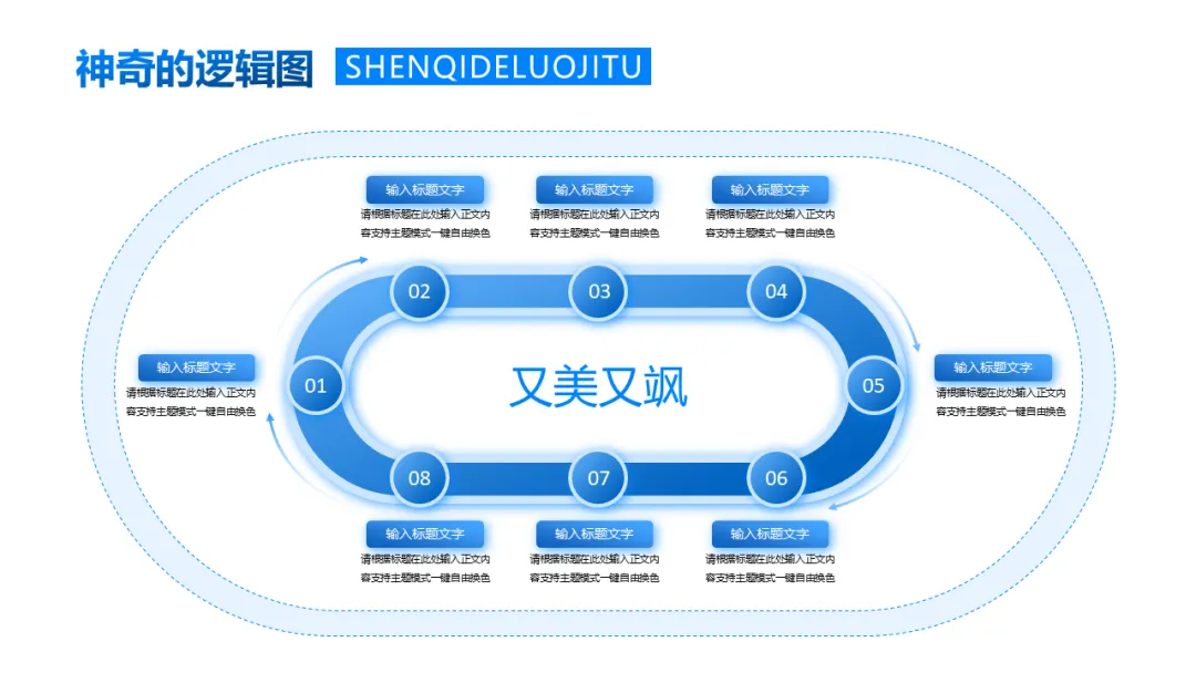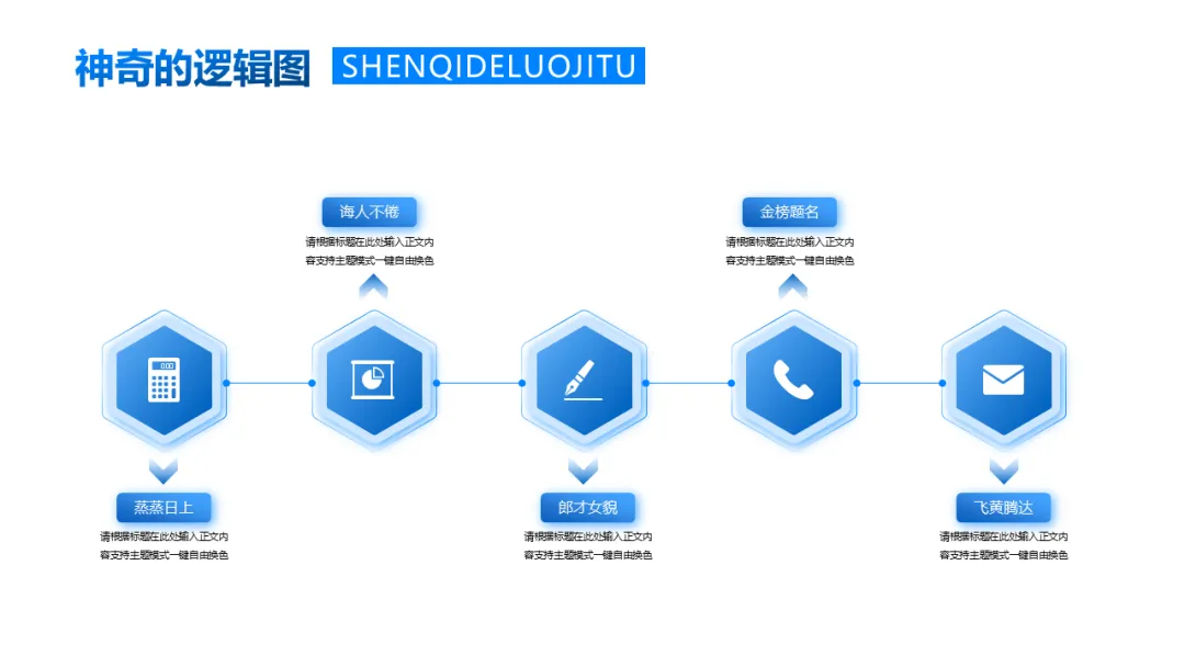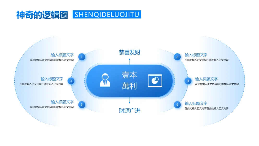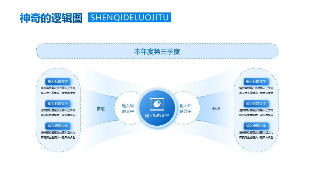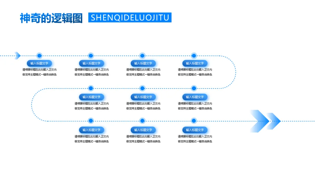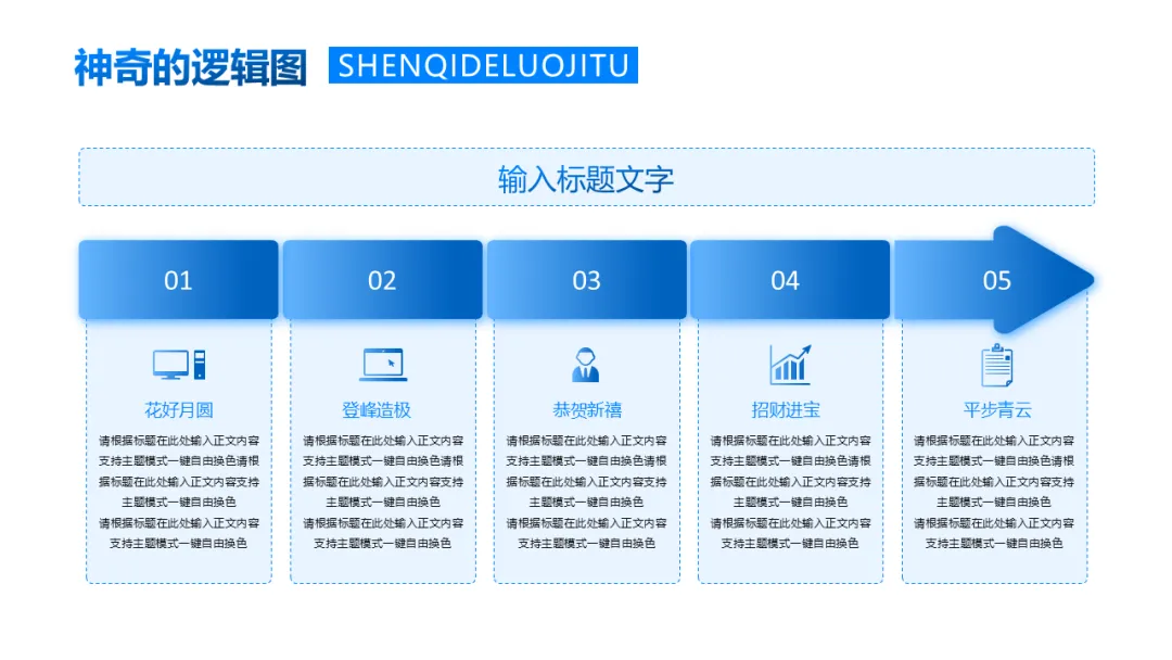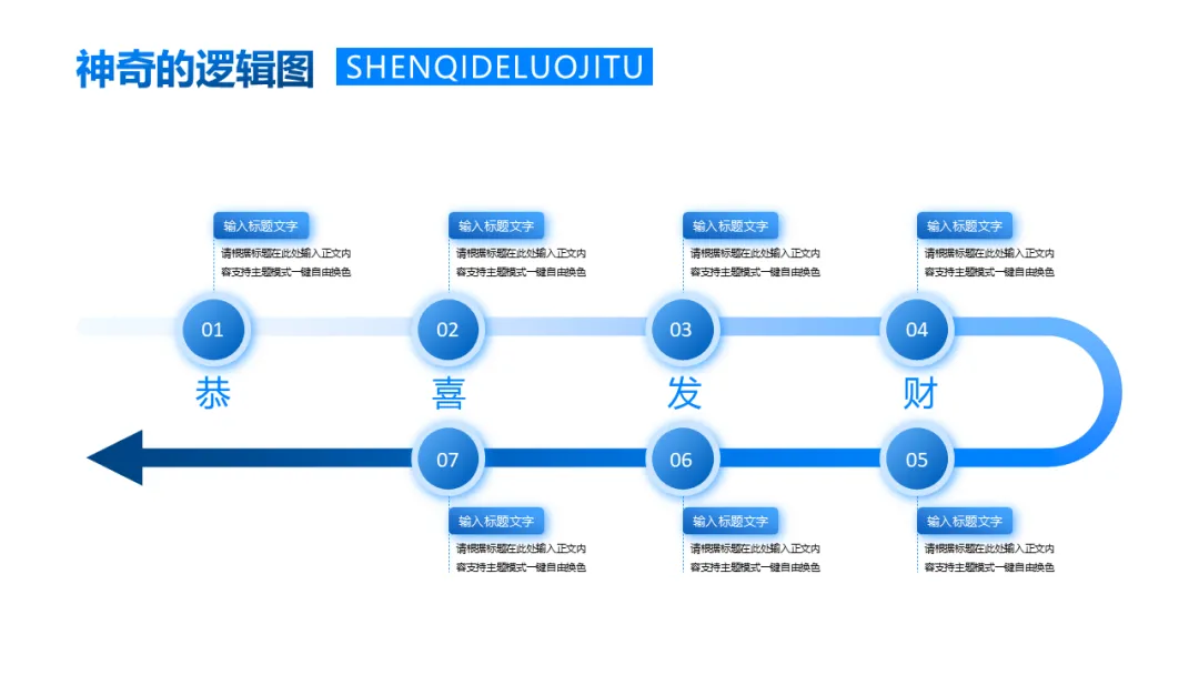 本材料首先是一套强大的 “逻辑可视化工具箱” 。其中大量页面以“神奇的逻辑图”为统一标题,并配以“登高望远”、“旗开得胜”、“鹏程万里”等吉祥话作为板块标题。这些页面本质上是高度模块化的图形模板,预留了“输入标题文字”、“请根据标题在此处输入正文内容”等占位符。它们展示了如何运用时间轴、递进关系、循环流程、中心辐射、对比矩阵等多种图形逻辑来组织信息,适用于构建企业发展历程、工作推进流程、PDCA循环、组织架构、关键里程碑等陈述性内容。其突出特点是支持“一键自由换色”和素材任意编辑,强调了其在商业演示中的实用性与灵活性。
