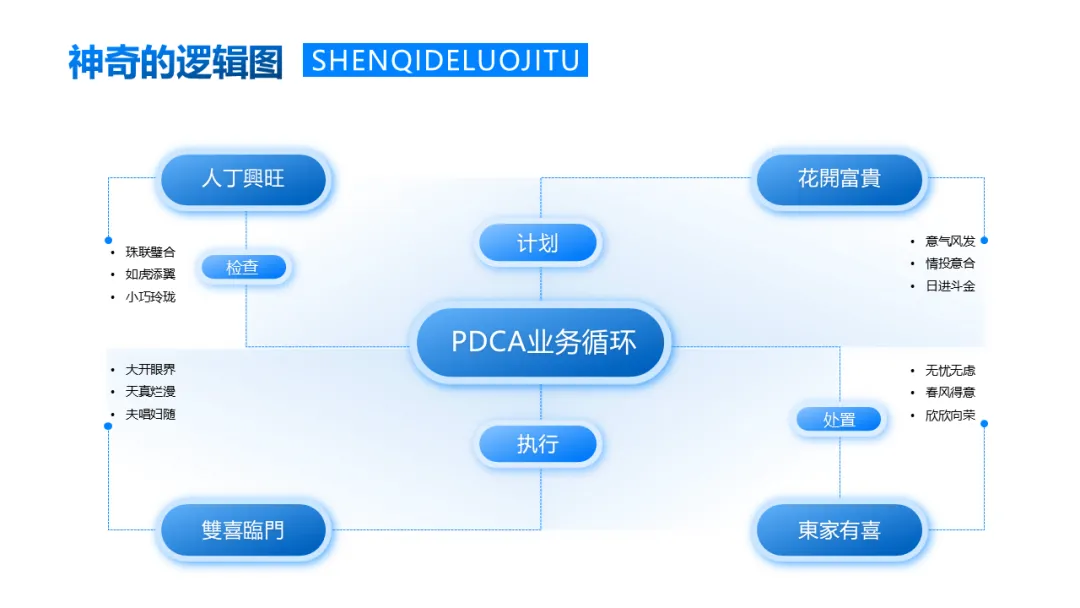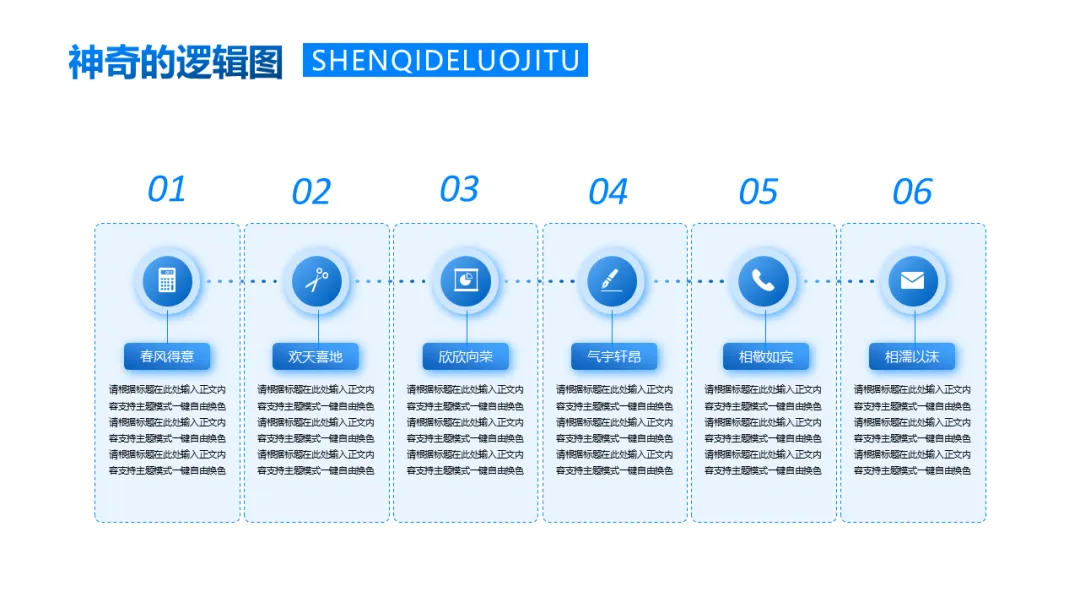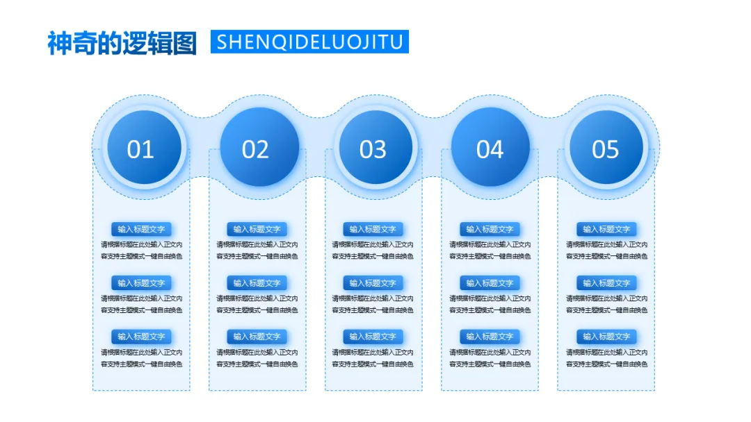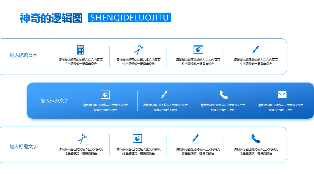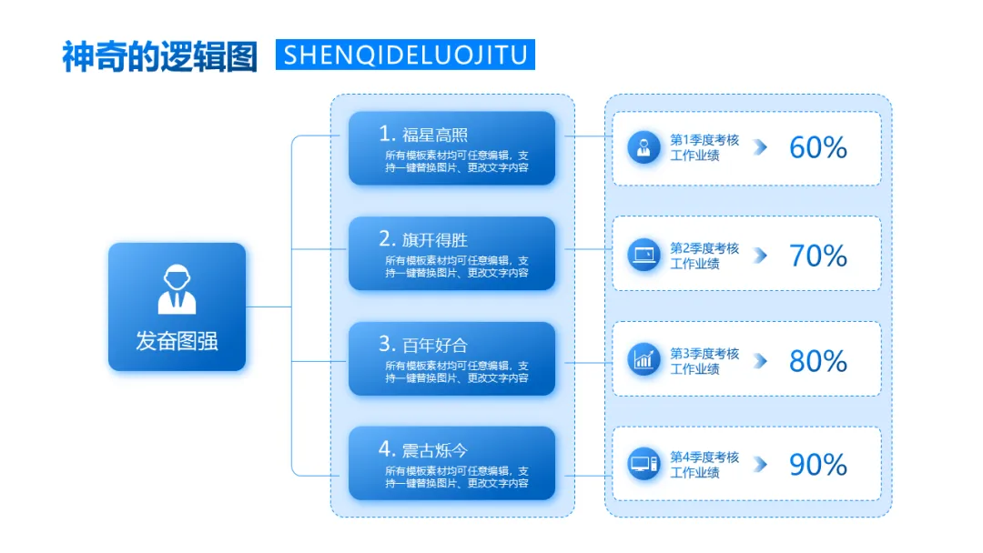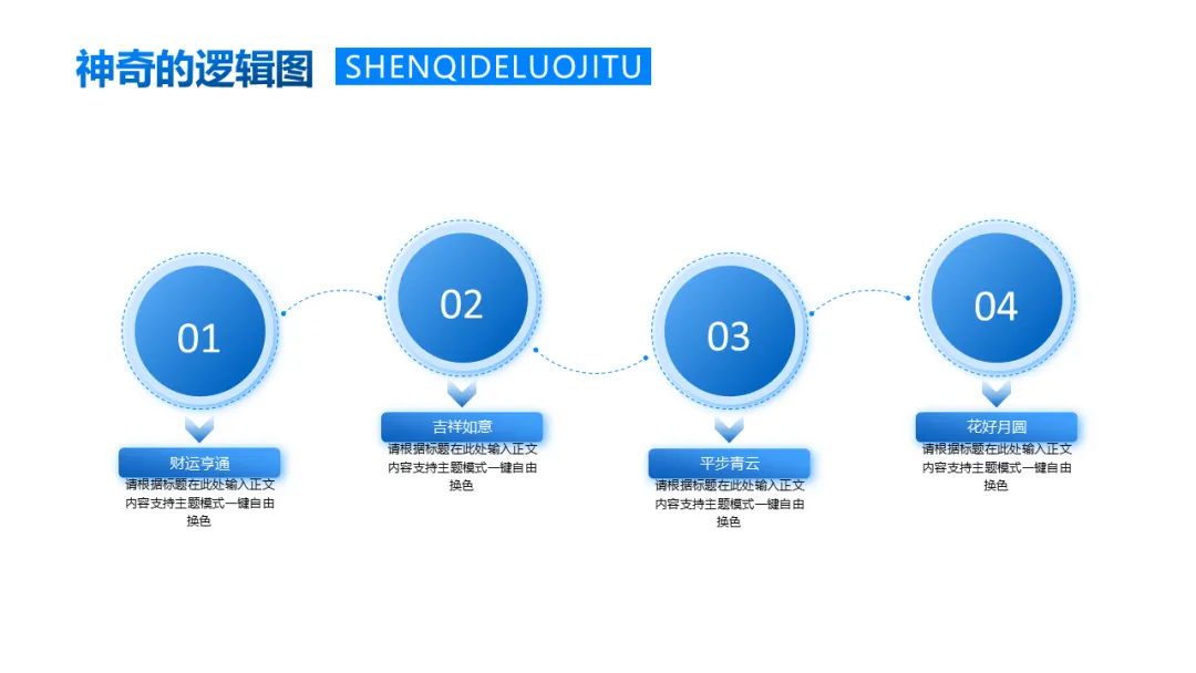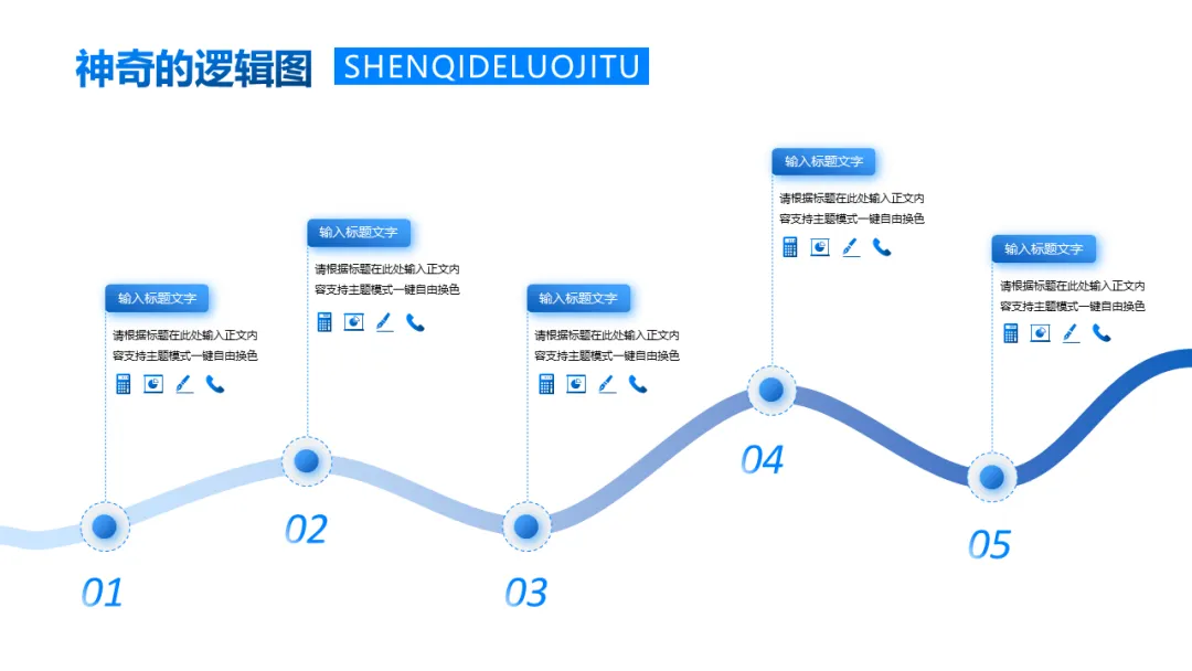 本材料首先是一套强大的 “逻辑可视化工具箱” 。其中大量页面以“神奇的逻辑图”为统一标题,并配以“登高望远”、“旗开得胜”、“鹏程万里”等吉祥话作为板块标题。这些页面本质上是高度模块化的图形模板,预留了“输入标题文字”、“请根据标题在此处输入正文内容”等占位符。它们展示了如何运用时间轴、递进关系、循环流程、中心辐射、对比矩阵等多种图形逻辑来组织信息,适用于构建企业发展历程、工作推进流程、PDCA循环、组织架构、关键里程碑等陈述性内容。其突出特点是支持“一键自由换色”和素材任意编辑,强调了其在商业演示中的实用性与灵活性。