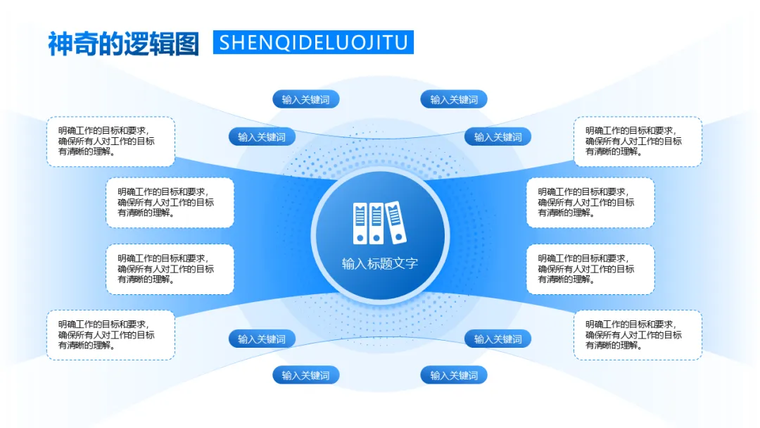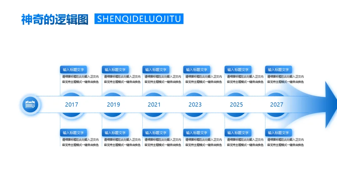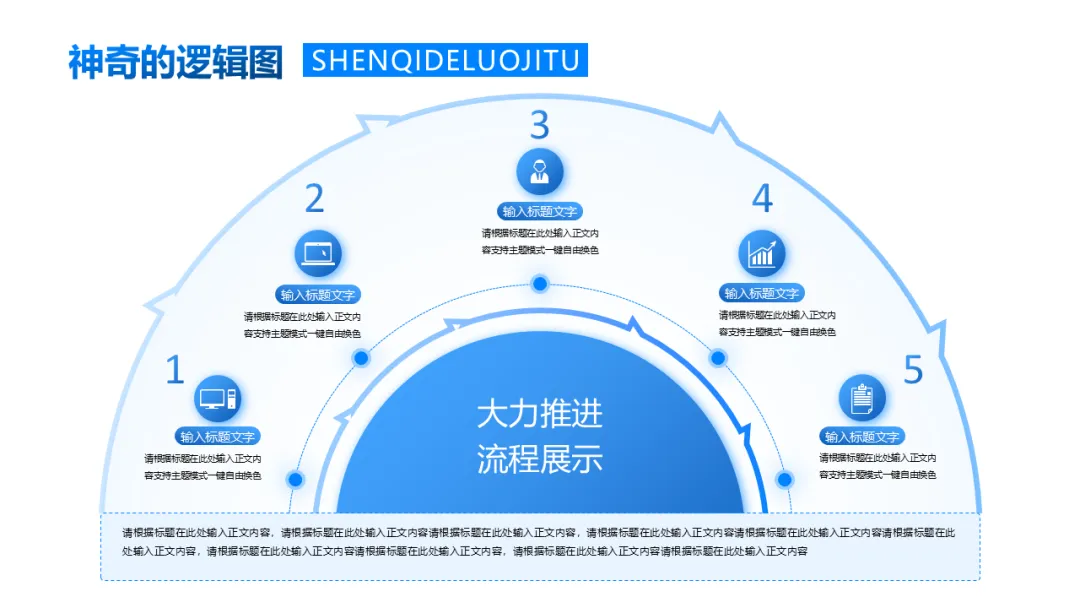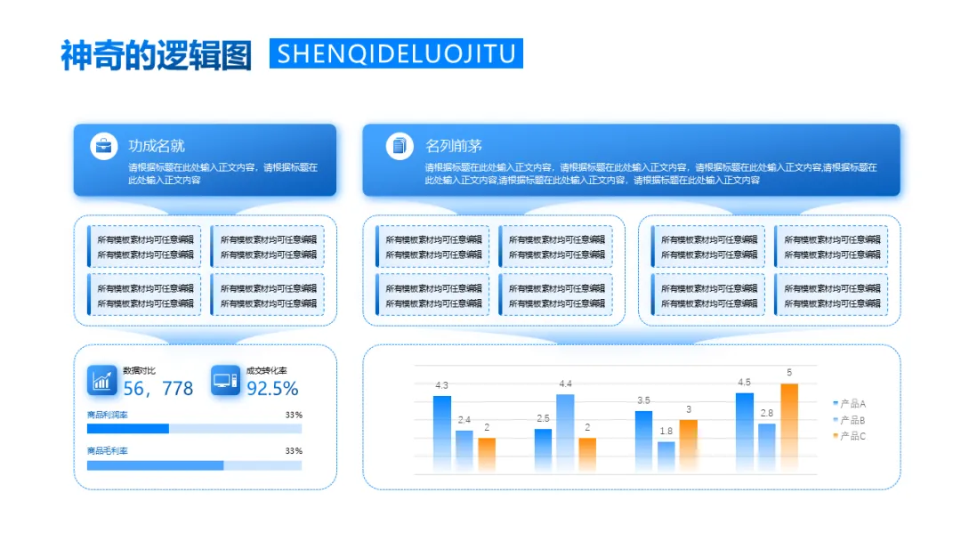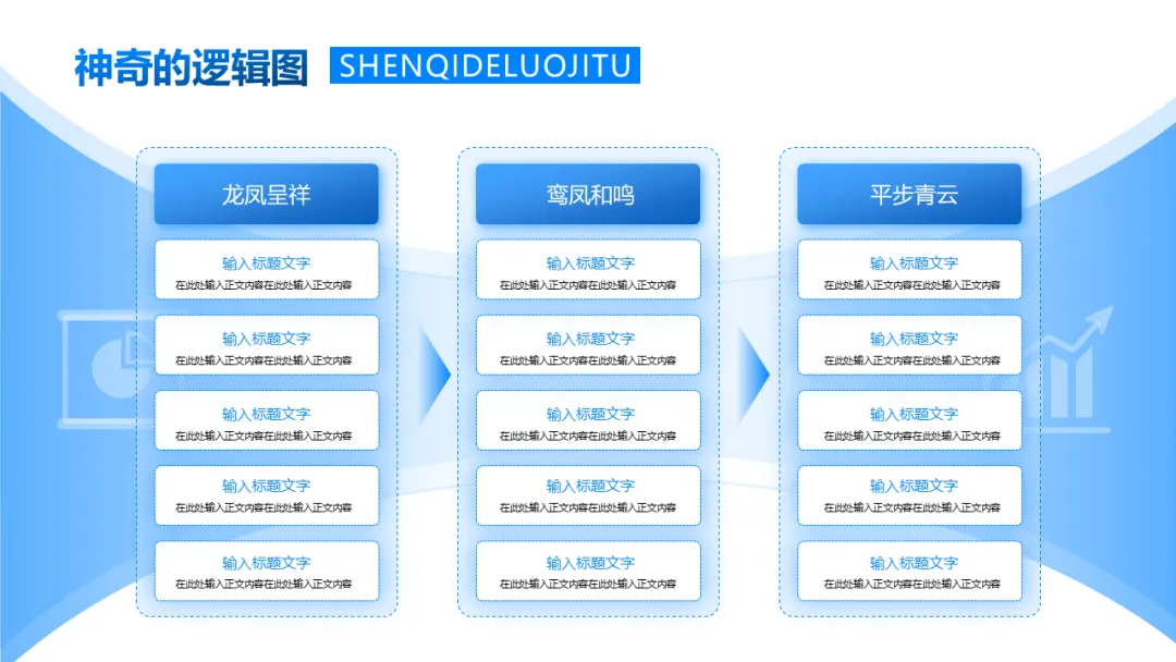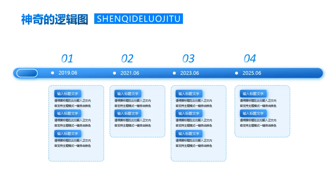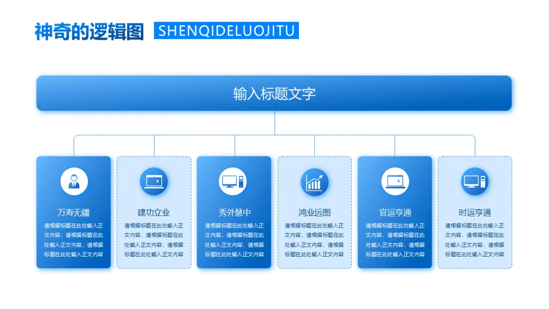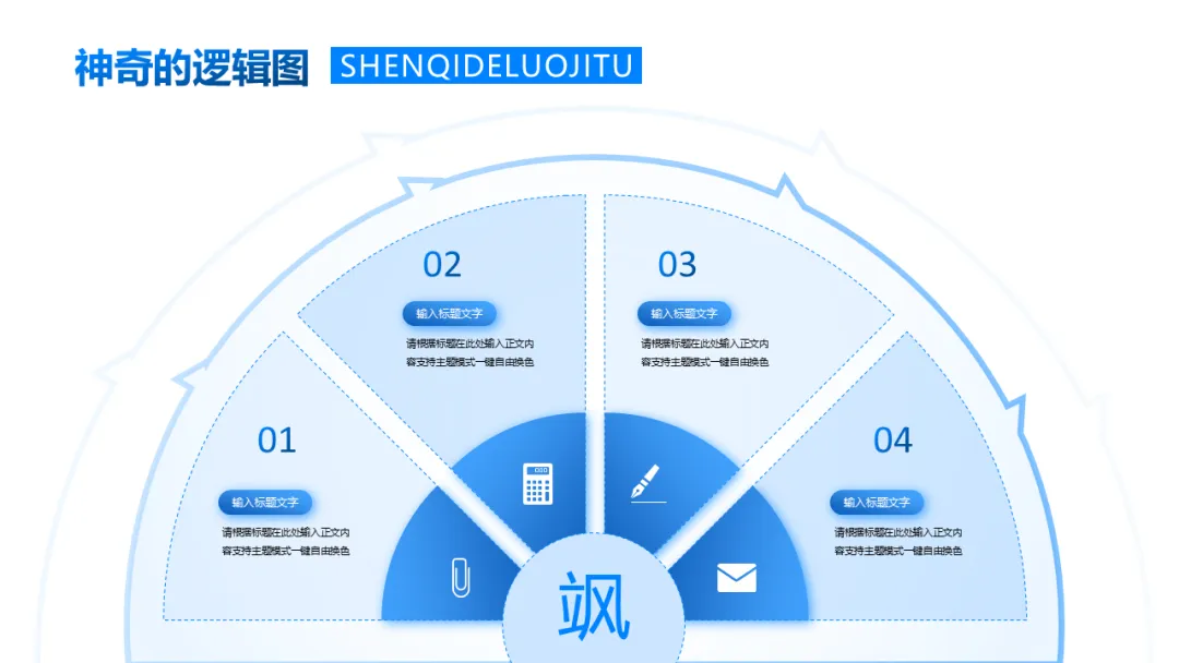 本材料首先是一套强大的 “逻辑可视化工具箱” 。其中大量页面以“神奇的逻辑图”为统一标题,并配以“登高望远”、“旗开得胜”、“鹏程万里”等吉祥话作为板块标题。这些页面本质上是高度模块化的图形模板,预留了“输入标题文字”、“请根据标题在此处输入正文内容”等占位符。它们展示了如何运用时间轴、递进关系、循环流程、中心辐射、对比矩阵等多种图形逻辑来组织信息,适用于构建企业发展历程、工作推进流程、PDCA循环、组织架构、关键里程碑等陈述性内容。其突出特点是支持“一键自由换色”和素材任意编辑,强调了其在商业演示中的实用性与灵活性。