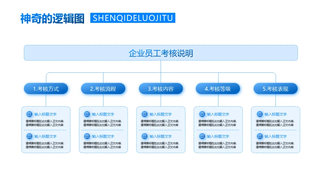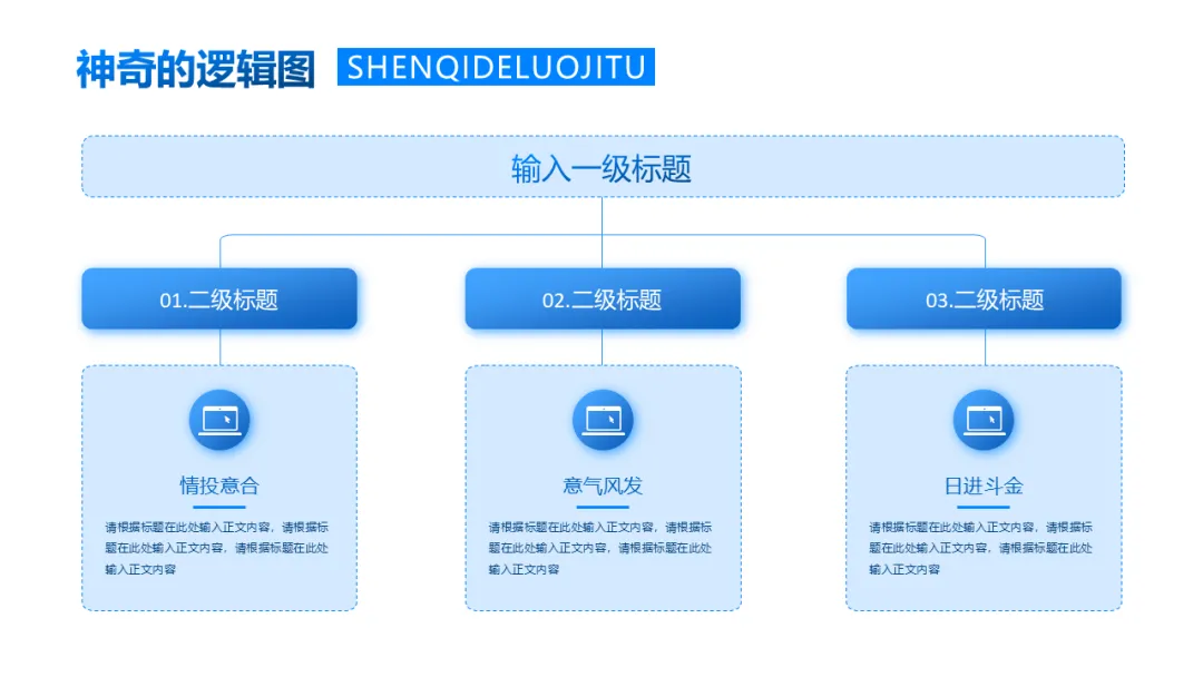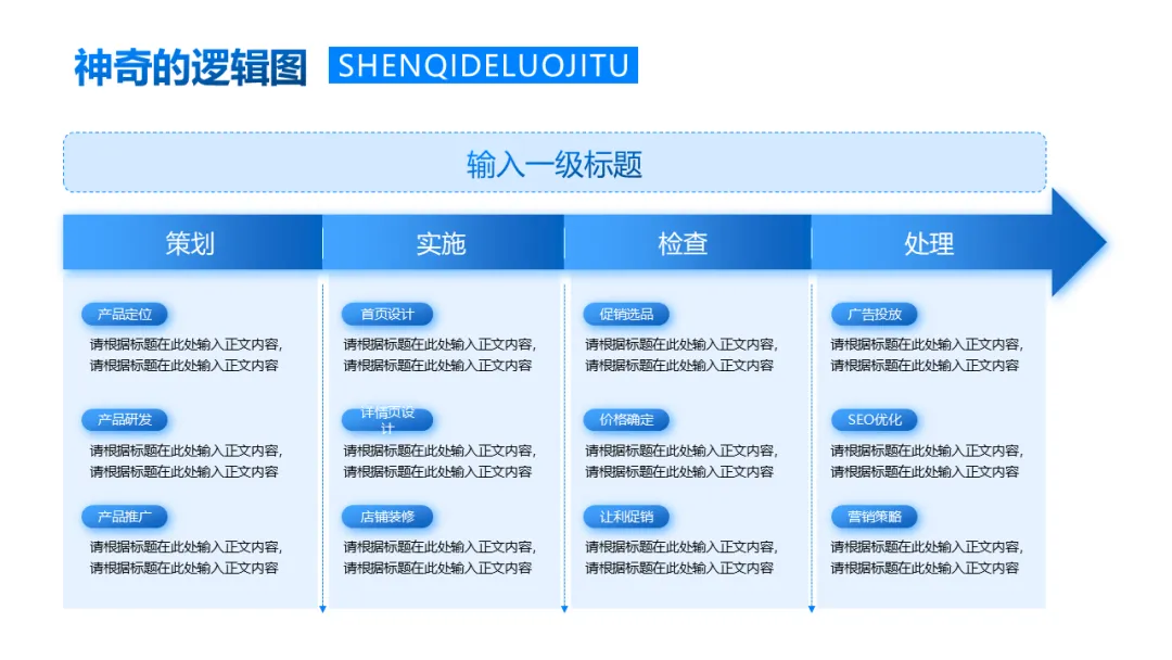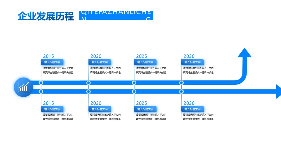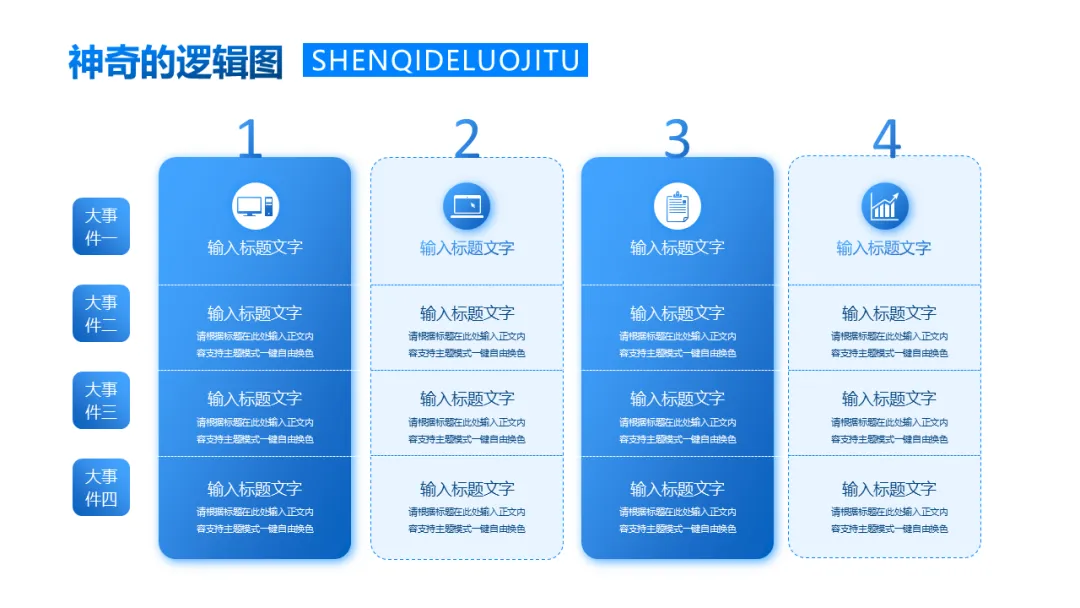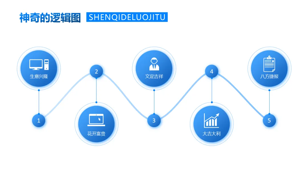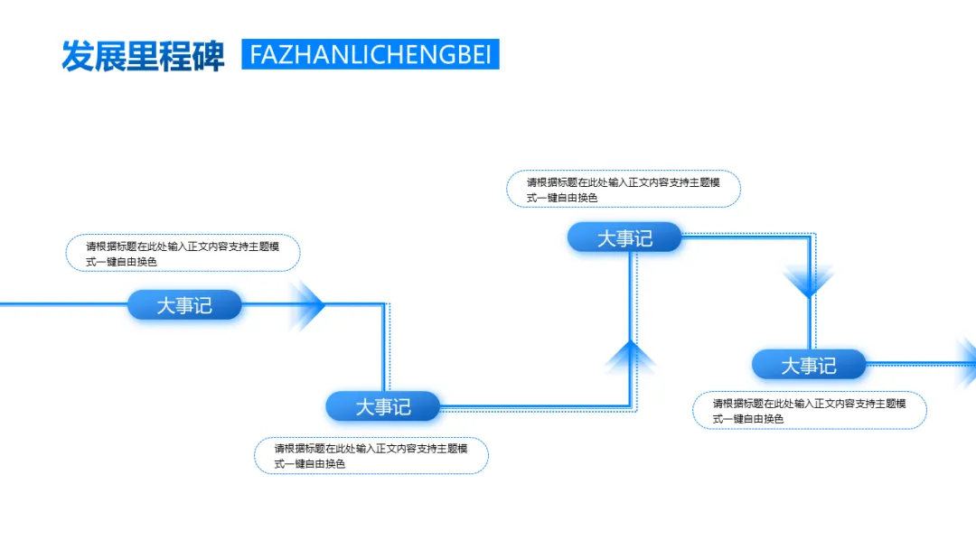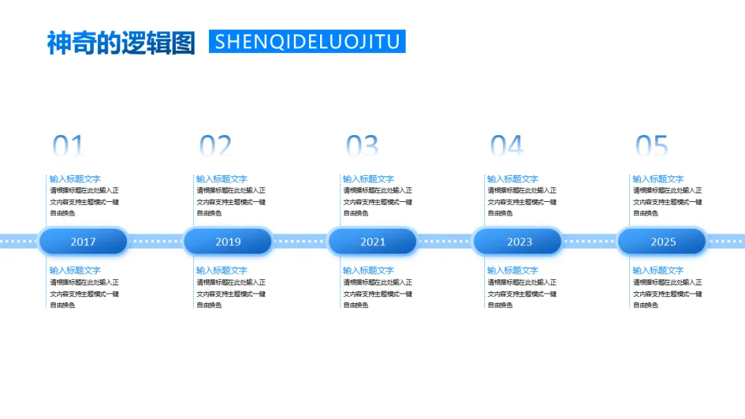 本材料首先是一套强大的 “逻辑可视化工具箱” 。其中大量页面以“神奇的逻辑图”为统一标题,并配以“登高望远”、“旗开得胜”、“鹏程万里”等吉祥话作为板块标题。这些页面本质上是高度模块化的图形模板,预留了“输入标题文字”、“请根据标题在此处输入正文内容”等占位符。它们展示了如何运用时间轴、递进关系、循环流程、中心辐射、对比矩阵等多种图形逻辑来组织信息,适用于构建企业发展历程、工作推进流程、PDCA循环、组织架构、关键里程碑等陈述性内容。其突出特点是支持“一键自由换色”和素材任意编辑,强调了其在商业演示中的实用性与灵活性。