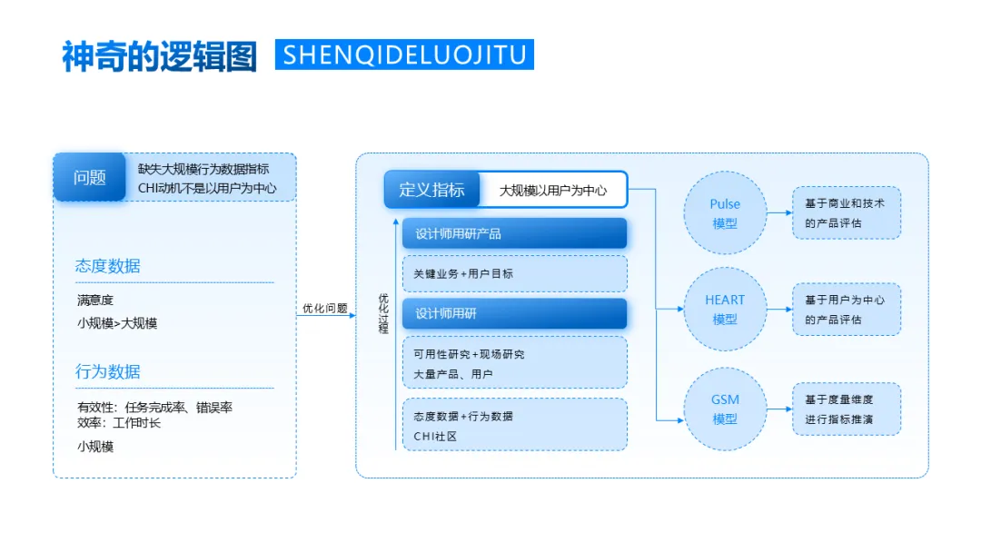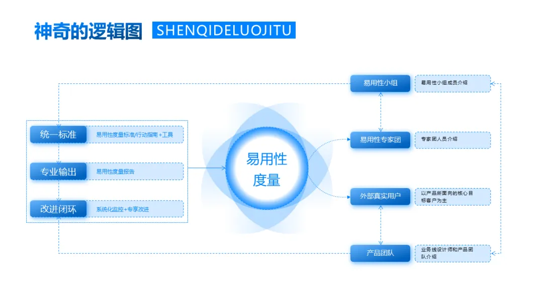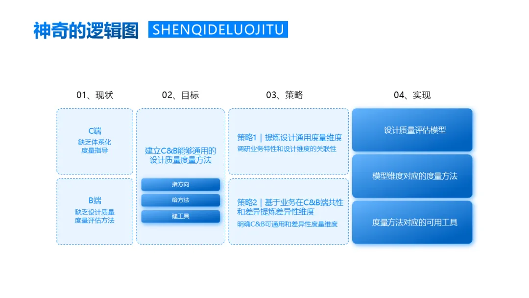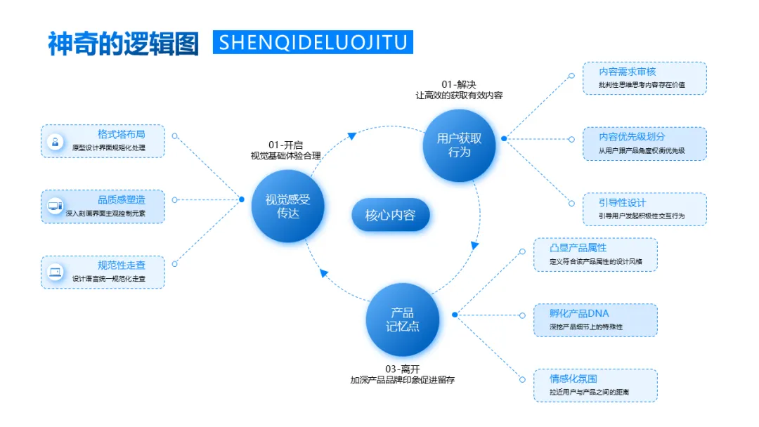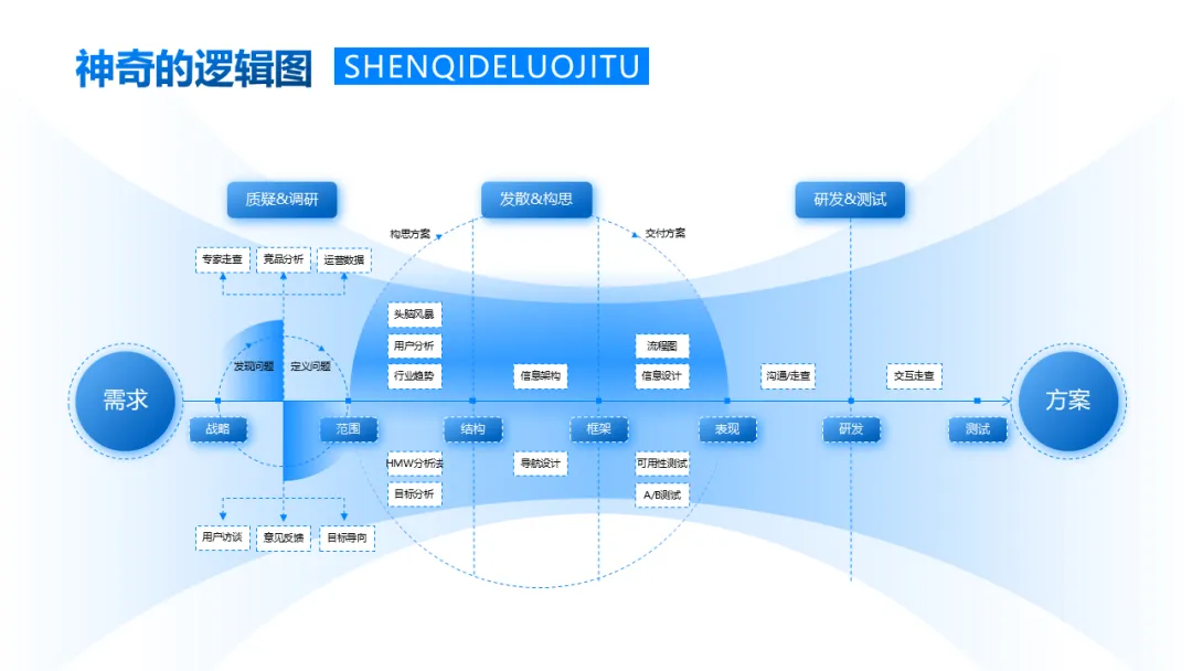用户体验(UX)与产品设计闭环方案:多张逻辑图系统阐述了现代产品设计的方法论。一个典型的方案遵循 “发现-定义-创想-原型-测试” 的设计思维双钻模型,并将其与业务战略、用户研究、竞品分析、设计验证等环节紧密结合。方案强调设计应始于对业务目标、用户人群和痛点的深度洞察,并通过A/B测试、数据跟踪进行验证迭代。另一份方案聚焦于设计质量度量,提出了从“现状分析”到“目标设定”,再到通过提炼通用与差异性维度来“建标准”,最终“搭工具”、“定机制”的实施路径,旨在建立可落地的设计质量评估与改进闭环。此外,关于如何通过优化首页信息架构、视觉层级和品牌统一性来提升转化效率的方案,也体现了以数据(如眼动追踪指标)和用户心智模型为指导的设计优化思路。