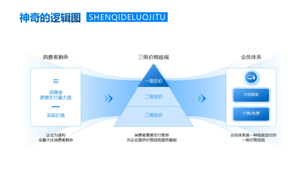 会员体系与增长引擎方案:文档深入剖析了会员经济的核心逻辑。一份图表明确指出,会员体系的本质是一种“三级价格歧视”工具,旨在最大化获取不同支付意愿用户的“消费者剩余”。方案设计上,强调需要构建涵盖成长体系、付费体系、权益反哺的完整框架。另一份逻辑图则具体展示了如何针对“懵懂新用户”、“摇摆用户”、“待刺激用户”和“待唤醒流失用户”等不同状态的会员,采取差异化的运营策略(如限时低价体验、放大权益价值、付费后试用等),形成精细化的用户生命周期管理体系。同时,方案也关注会员的感知价值,提出了通过“卡面升级”、“品牌色优化”、“惊喜彩蛋”等手段提升会员的尊享感与身份认同。
