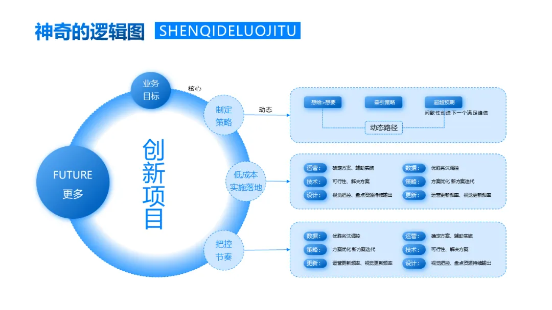 然而,文档更精华的部分在于那些已经填充了具体业务内容的逻辑图,它们直观呈现了不同领域的关键解决方案设计思路。这些方案普遍体现了以用户/客户为中心、数据驱动、闭环管理、生态化构建的现代业务设计理念。