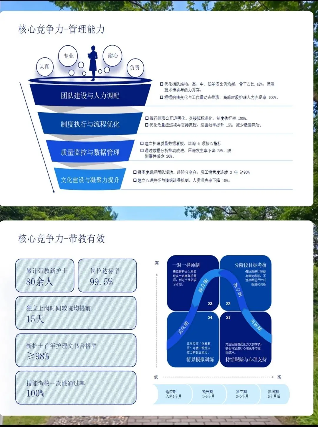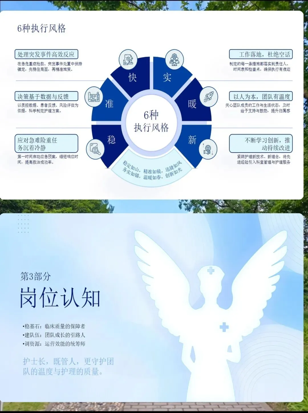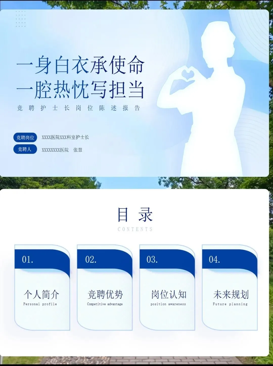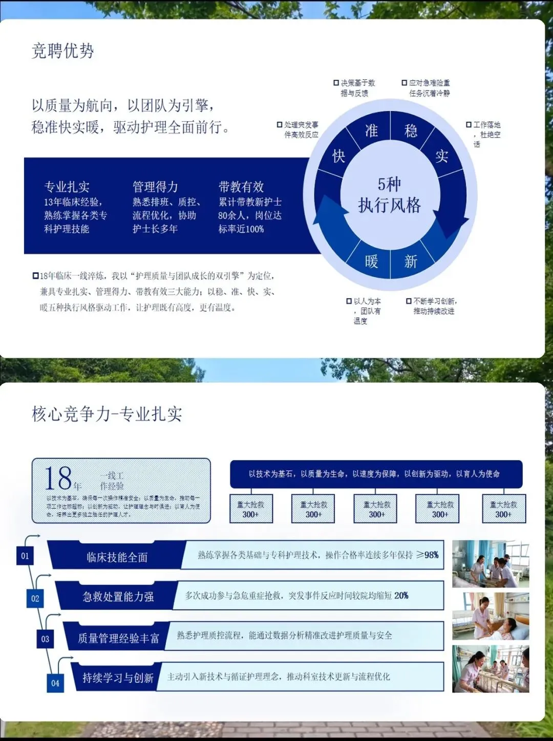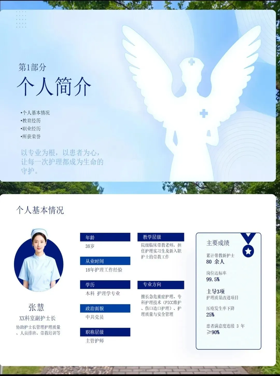 从白衣天使到护理领航人:一位护士长的成长之路 以初心为灯,以专业为桨,带领团队驶向更高质量的护理彼岸 各位评委老师、同事朋友们: 大家好!