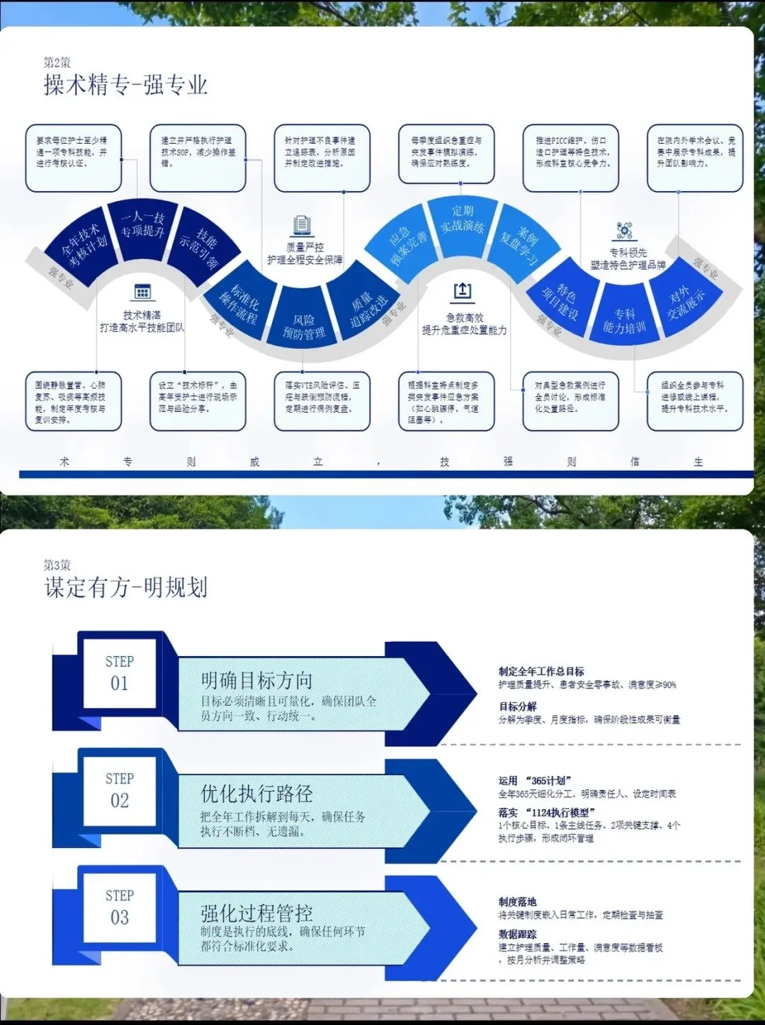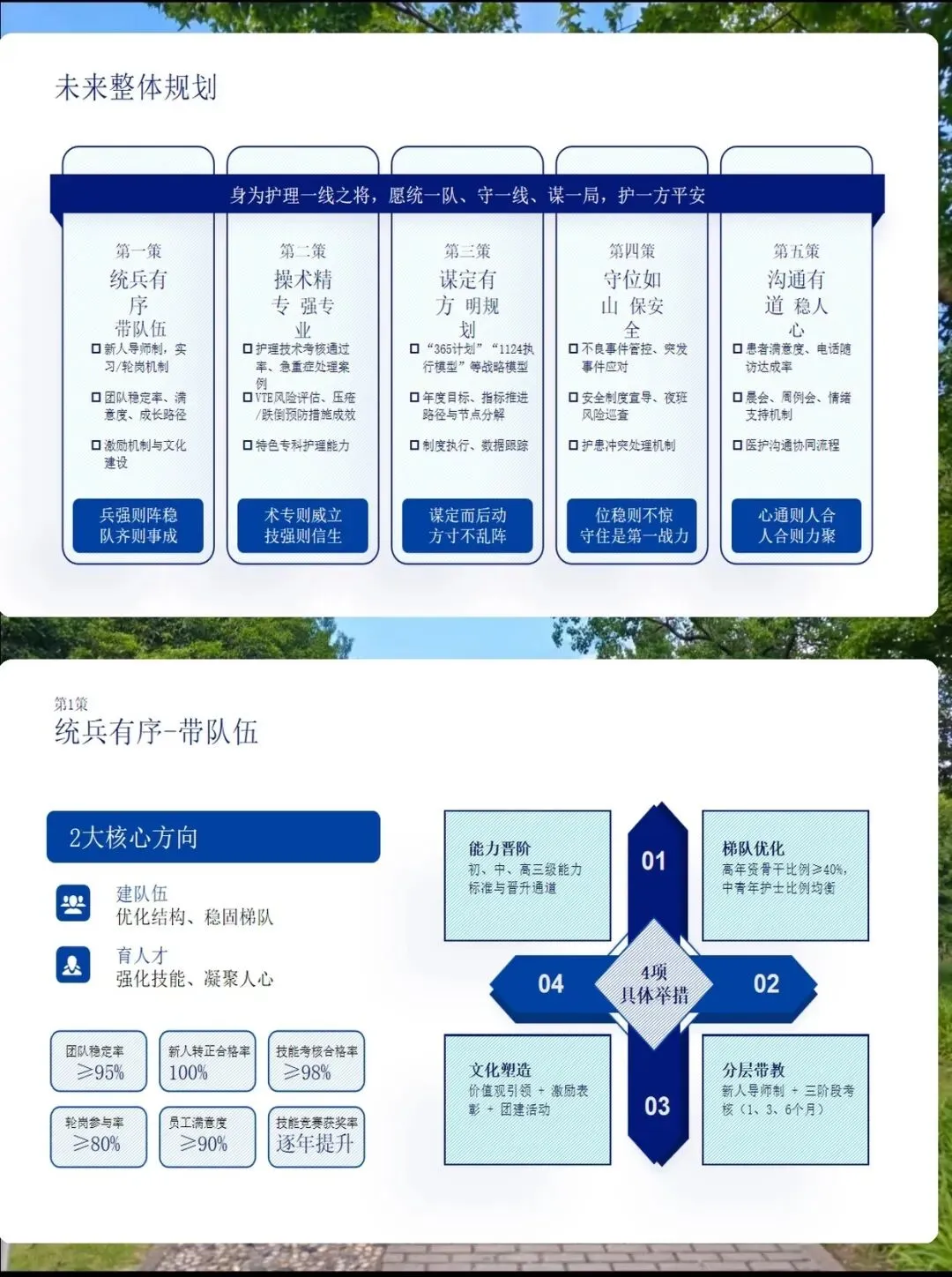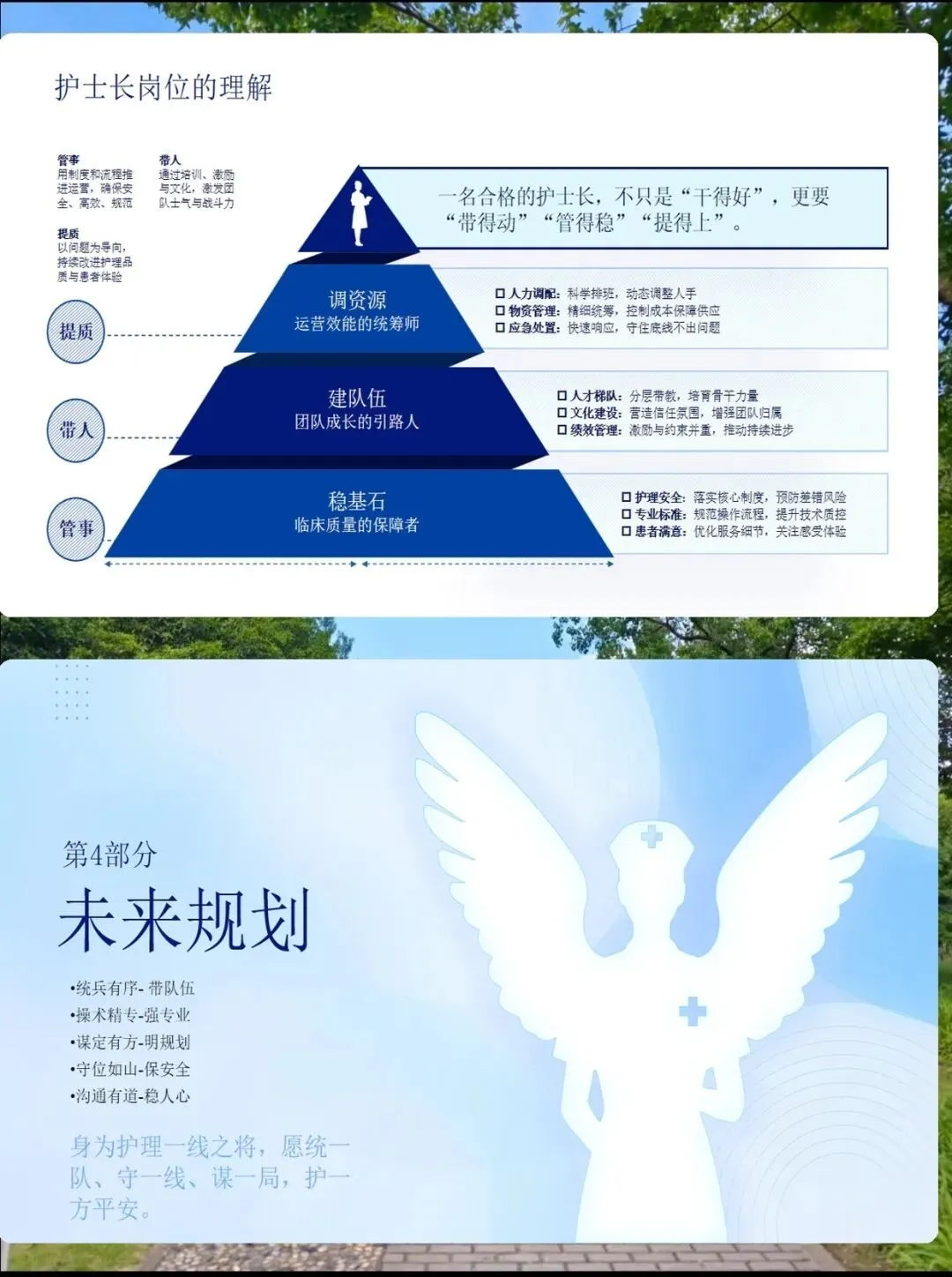 护士长,听起来是一个管理岗位,但我更愿意把它理解为"服务者的服务者"。我们不仅要当好临床质量的守护者,更要做团队成长的引路人。未来,我计划通过"带队伍、强专业、保安全、稳人心"五大策略,让护理工作既有高度,更有温度。 护理工作没有终点,只有起点。