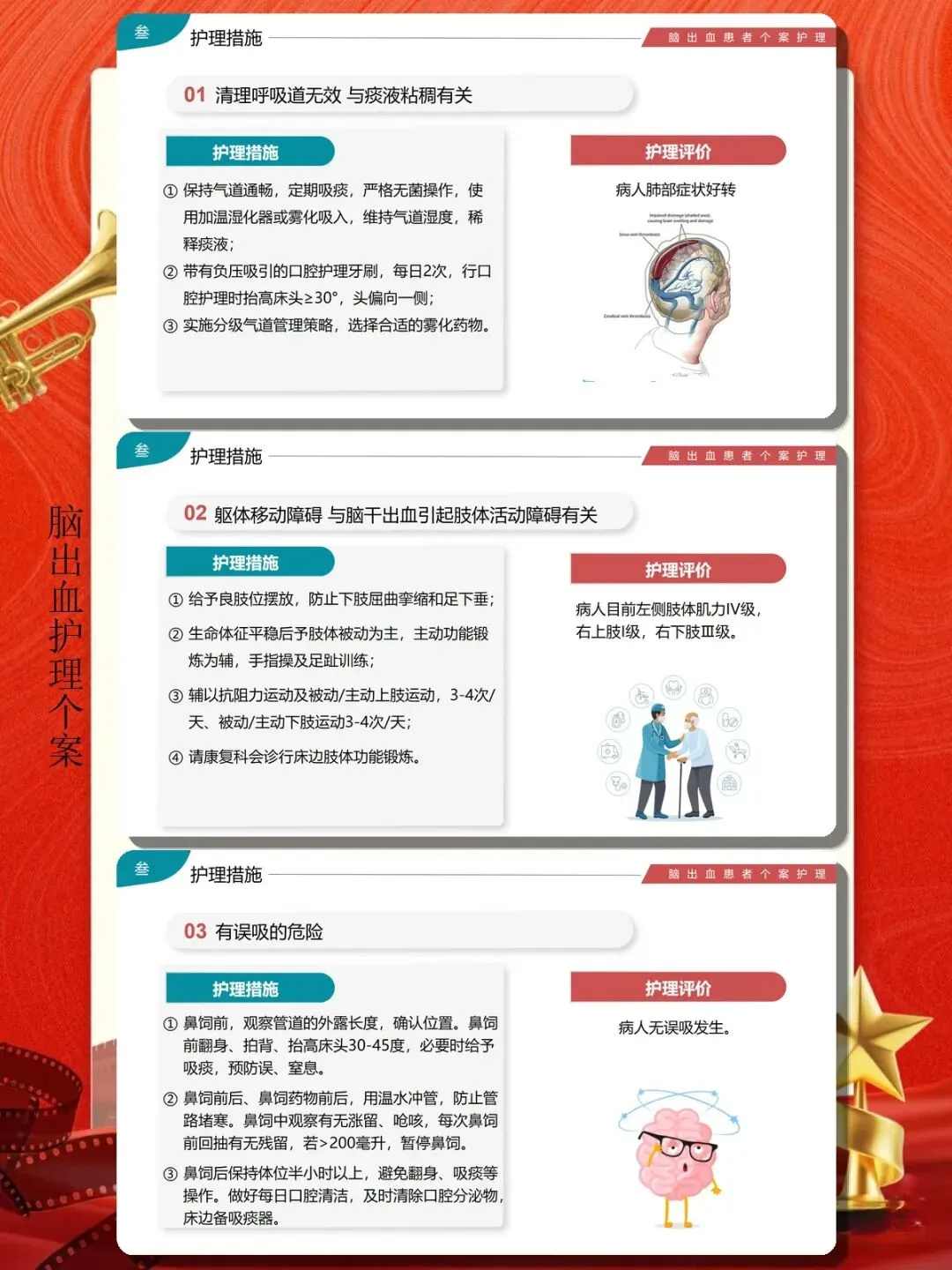 脑出血患者卧床时间长、机体功能下降,极易发生多种并发症。预防并发症是护理工作的重中之重,需要精细化、系统化的护理干预。