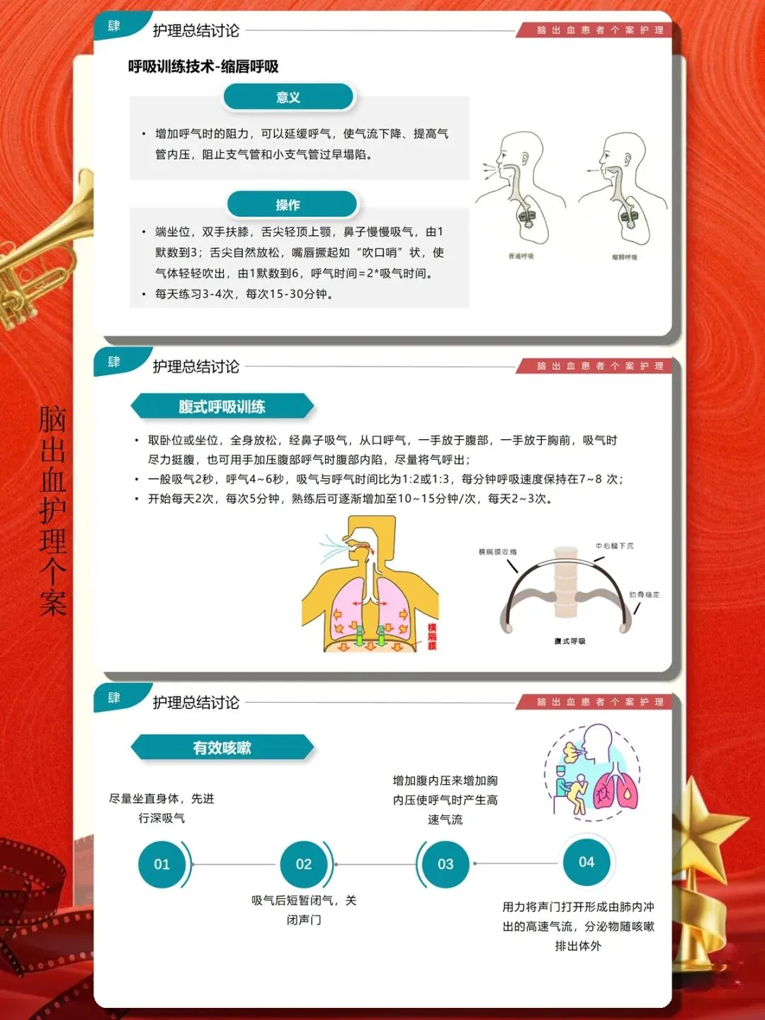 肺部感染是脑出血患者最常见的并发症之一。预防措施包括:保持病室空气清新,定期开窗通风;加强口腔护理,每日口腔清洁2-3次,保持口腔清洁湿润;定时翻身拍背,促进痰液排出,每2小时翻身一次,拍背时由下向上、由外向内叩击背部;对痰液黏稠不易咳出者,可给予雾化吸入稀释痰液;严格无菌操作,吸痰时动作轻柔,避免损伤气道黏膜。