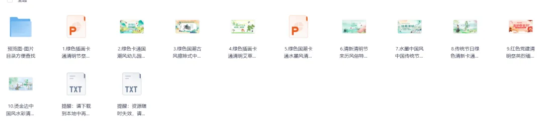 清明将至,还在为活动策划、课堂教案、企业宣传的素材发愁?别急!我们为你打包了11套超全清明主题资源,涵盖PPT模板、插画、文案,风格多样,直接套用!- 1. 多风格覆盖:绿色卡通(幼儿园适用)、国潮古风(企业/文化宣传)、水墨中国风(传统节日科普)、红色党建(英烈缅怀)……满足不同场景需求!