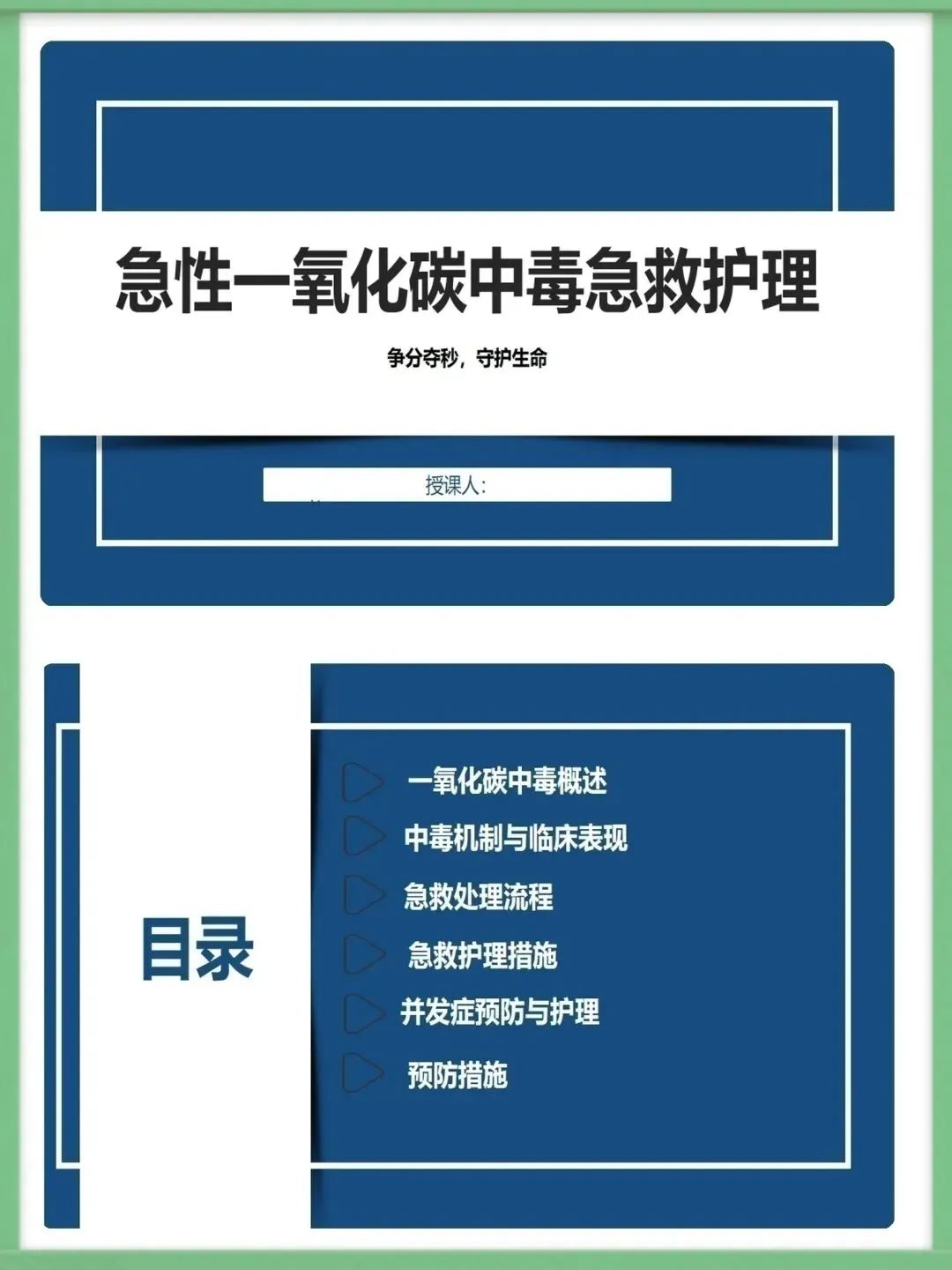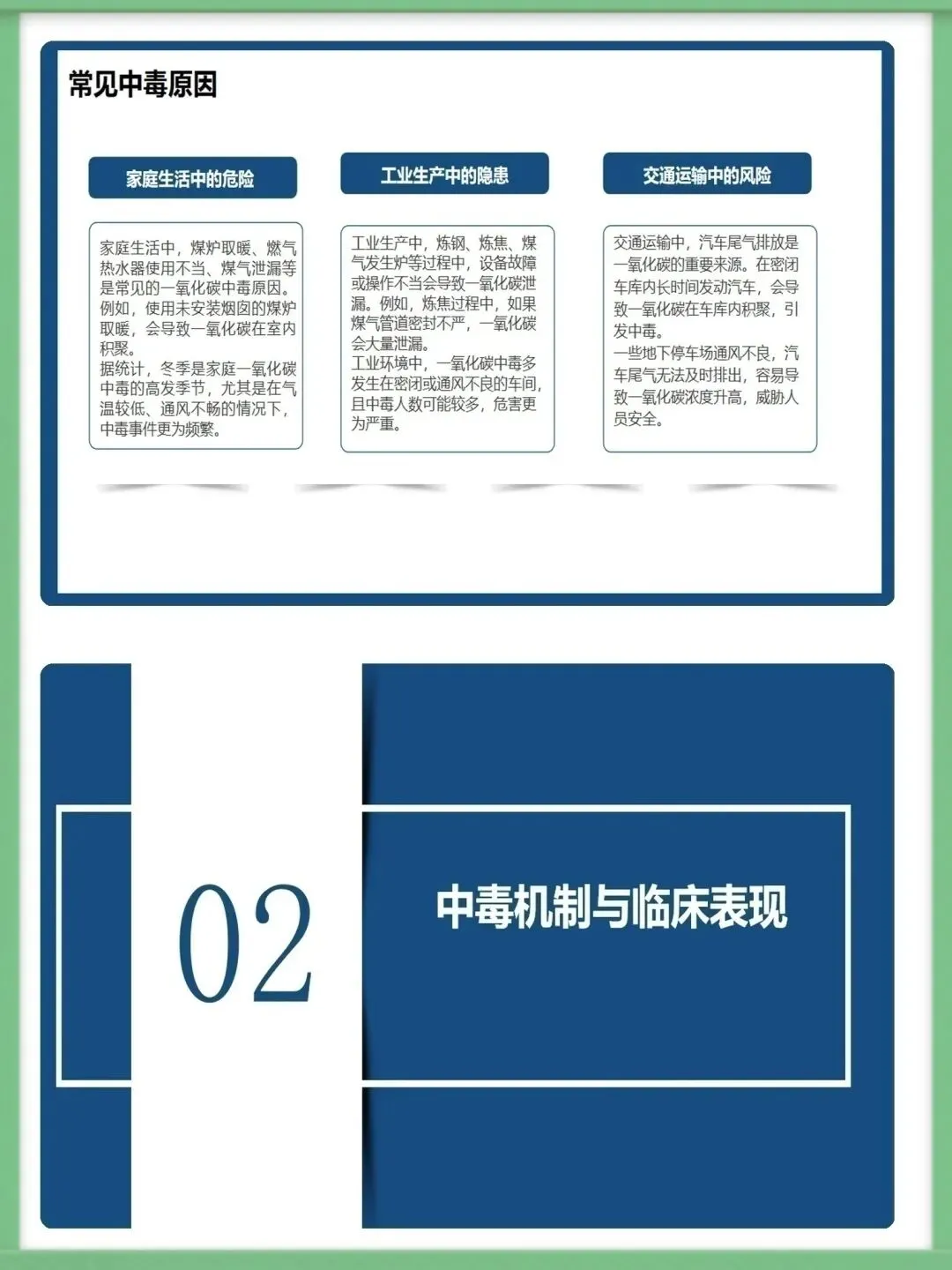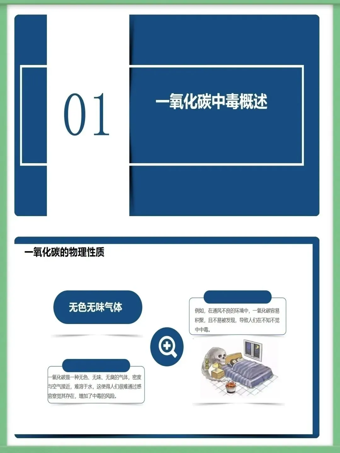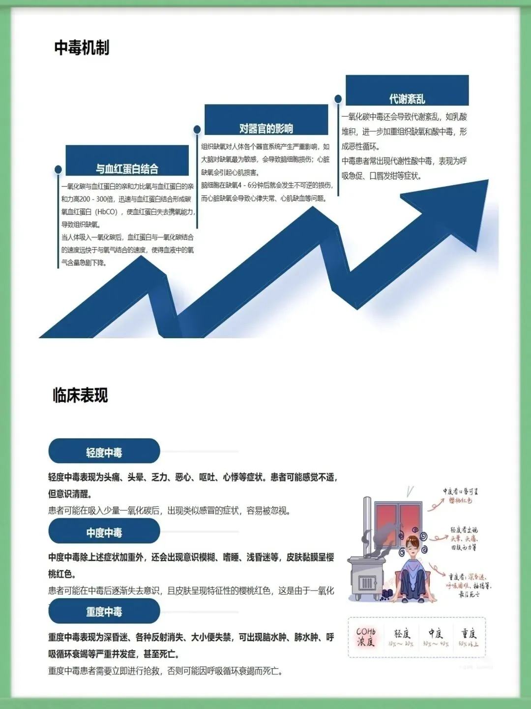 各位同仁,大家好。今天为大家讲解急性一氧化碳中毒的急救护理知识。一氧化碳为无色无味、密度近空气、难溶于水的有毒气体,工业泄漏、交通尾气、家庭取暖不当是常见中毒诱因,冬季为家庭中毒高发期,需提高警惕。一氧化碳与血红蛋白亲和力远高于氧气,结合形成碳氧血红蛋白致组织缺氧,脑细胞缺氧4-6分钟即不可逆损伤,还会引发代谢紊乱,加重组织缺氧与酸中毒,形成病理恶性循环。中毒按程度分轻中重度,轻度有头痛、乏力等症状,中度意识模糊且皮肤黏膜呈樱桃红色,重度深昏迷并伴脑水肿、呼吸循环衰竭等严重并发症,碳氧血红蛋白浓度对应不同中毒程度。急救需先确保环境安全,迅速将患者转移至空气新鲜处,保持呼吸道通畅,清除分泌物并及时辅助呼吸,同时给予8-10L/min高流量吸氧,高压氧治疗为最有效手段,需持续监测氧合情况。急救护理需严密监测生命体征与意识状态,做好皮肤、口腔、饮食基础护理,同时给予患者及家属心理支持与疾病知识宣教,早期识别并处理各类并发症,改善患者预后。中毒并发症以脑水肿、迟发性脑病为主,需遵医嘱使用脱水剂、抬高患者头部,向家属宣教迟发性脑病知识,开展康复训练并定期随访,同时从家庭、工业、公众层面做好预防,从源头降低中毒风险。以上为急性一氧化碳中毒急救护理的核心内容,希望大家熟练掌握,在临床中争分夺秒守护患者生命。感谢聆听!