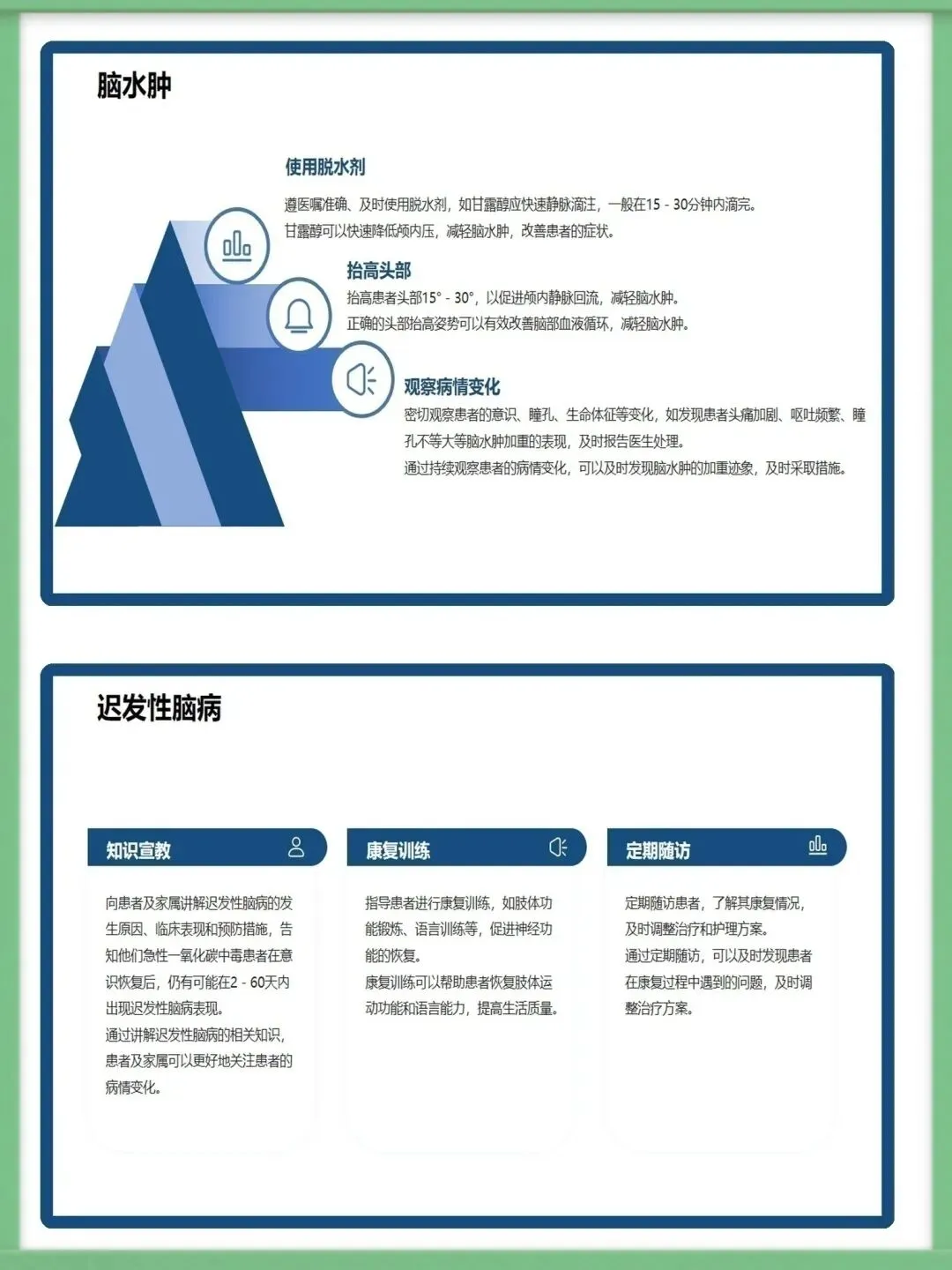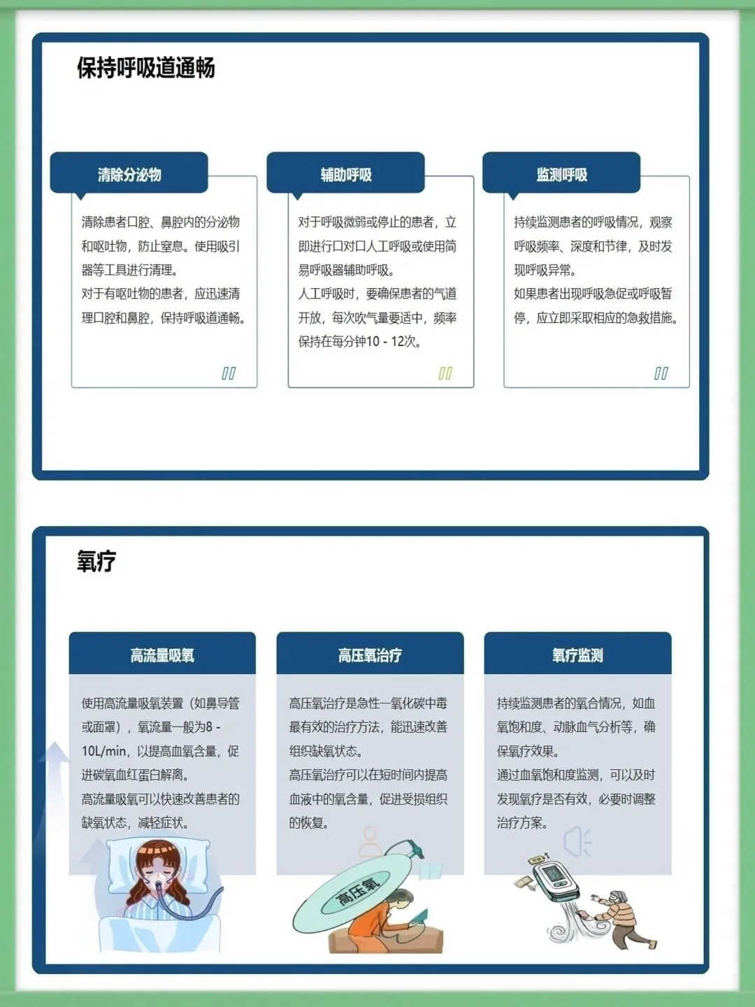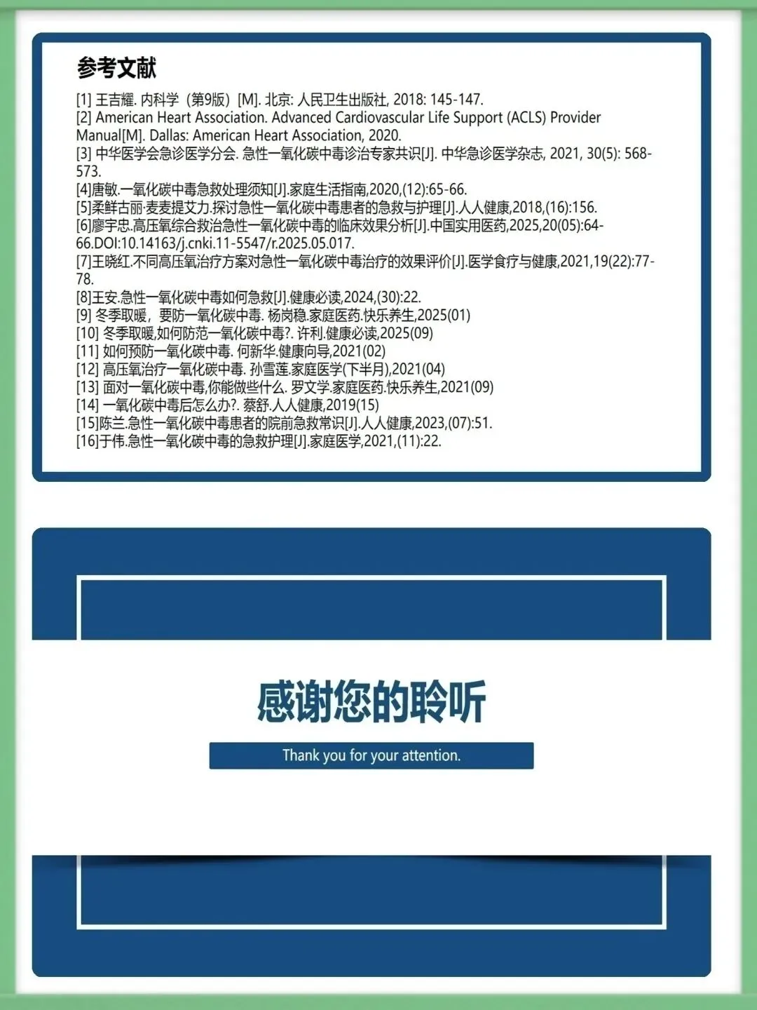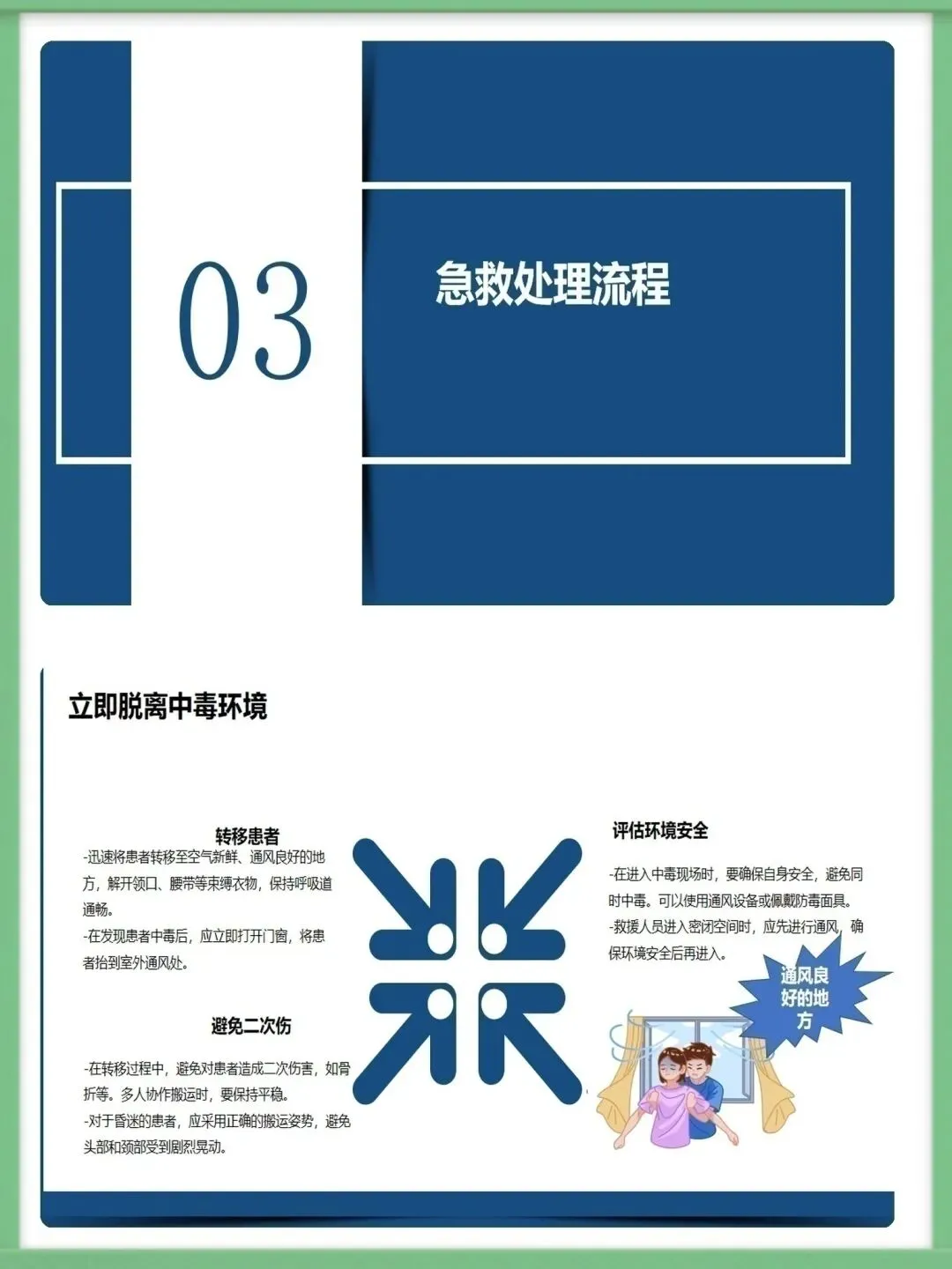 各位同仁,大家好。今天为大家讲解急性一氧化碳中毒的急救护理知识。一氧化碳为无色无味、密度近空气、难溶于水的有毒气体,工业泄漏、交通尾气、家庭取暖不当是常见中毒诱因,冬季为家庭中毒高发期,需提高警惕。一氧化碳与血红蛋白亲和力远高于氧气,结合形成碳氧血红蛋白致组织缺氧,脑细胞缺氧4-6分钟即不可逆损伤,还会引发代谢紊乱,加重组织缺氧与酸中毒,形成病理恶性循环。中毒按程度分轻中重度,轻度有头痛、乏力等症状,中度意识模糊且皮肤黏膜呈樱桃红色,重度深昏迷并伴脑水肿、呼吸循环衰竭等严重并发症,碳氧血红蛋白浓度对应不同中毒程度。急救需先确保环境安全,迅速将患者转移至空气新鲜处,保持呼吸道通畅,清除分泌物并及时辅助呼吸,同时给予8-10L/min高流量吸氧,高压氧治疗为最有效手段,需持续监测氧合情况。急救护理需严密监测生命体征与意识状态,做好皮肤、口腔、饮食基础护理,同时给予患者及家属心理支持与疾病知识宣教,早期识别并处理各类并发症,改善患者预后。中毒并发症以脑水肿、迟发性脑病为主,需遵医嘱使用脱水剂、抬高患者头部,向家属宣教迟发性脑病知识,开展康复训练并定期随访,同时从家庭、工业、公众层面做好预防,从源头降低中毒风险。以上为急性一氧化碳中毒急救护理的核心内容,希望大家熟练掌握,在临床中争分夺秒守护患者生命。感谢聆听!