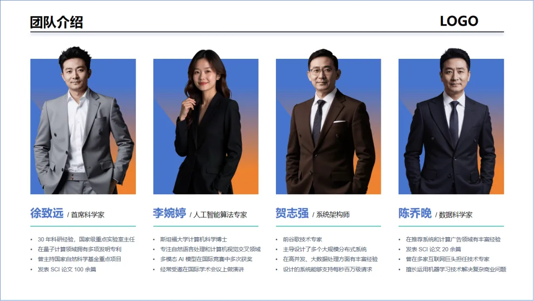 如果是你的话,你会怎么用#PPT 设计下边的人物介绍?因为工作需要,我经常做#PPT 材料,但在制作的过程中发现自己的制作能力和水平还有欠缺,所以,我就利用业余时间自学PPT制作。每次分享的PPT制作教程,都是我在网上学习到的技巧、思路应用到实际工作中的成品。只有几张人物图片,几段文案,需要你做出重点信息突出、图片排版简洁、美观的#PPT人物介绍页,你会怎么做?今天我就分享一种借用形状+抠图+文字排版的PPT制作方法,用到的都是基础技巧,零基础也能上手操作!使用WPS自带的#抠图功能 分别把每个人物的背景给去除掉。插入一个直角三角形、一个矩形,矩形调整渐变色。(渐变色可以根据你的需要进行调整)。三角形与矩形重叠,全选并进行组合。将人物图片复制到形状上方,人物图片要比形状略大些,这样是为了形状形成立体感。将文字信息复制到PPT页面中,添加图标,调整字体、颜色、大小和位置。图标可以从#WPS 的【插入】中搜索使用,也可以从网上搜索使用。也可以给PPT页面添加上背景色,使整个页面色彩更丰富些。是不是很简单?零基础的你也可以跟着做出这种形状+抠图+文字排版的PPT页面!