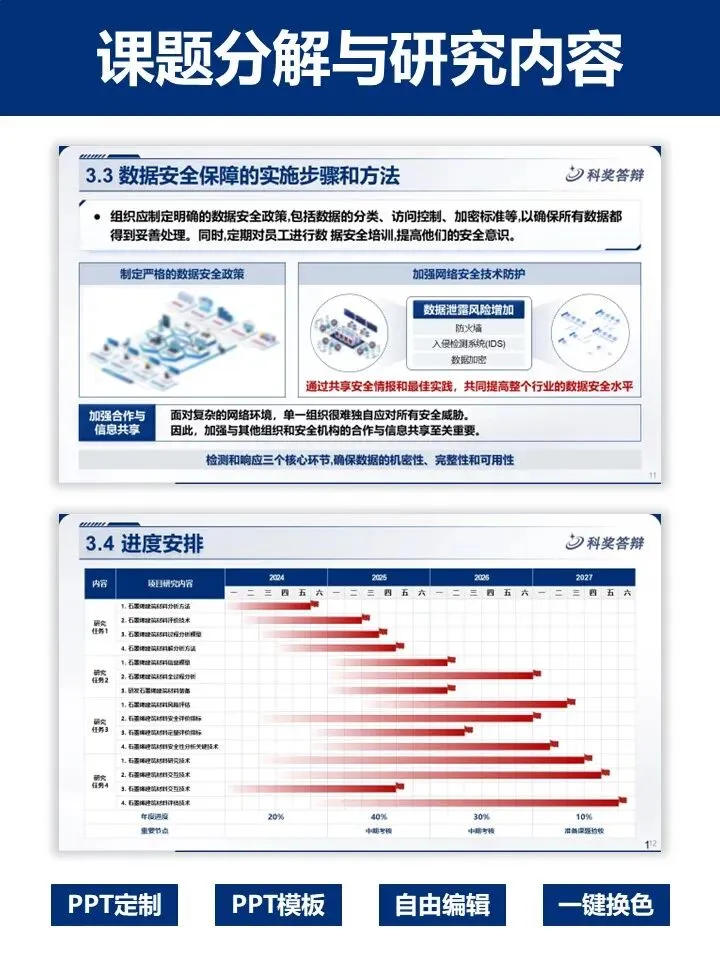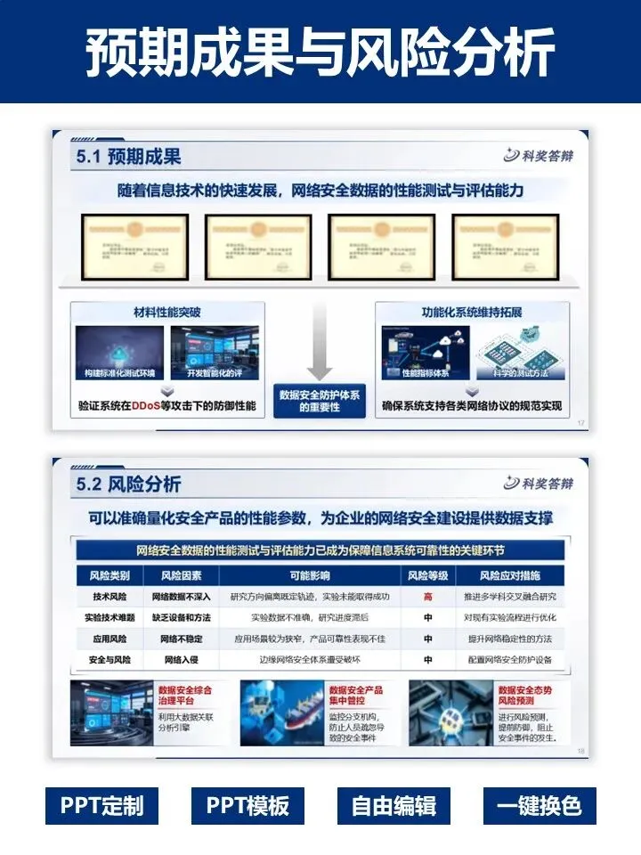 模板全覆盖项目背景、课题分解、实施方法、研发团队、预期成果等核心板块,图文排版清晰直观,技术路线、甘特图、风险分析等页面重点突出,大气专业。支持自由编辑、一键换色,可灵活适配网络安全等多学科重大专项。