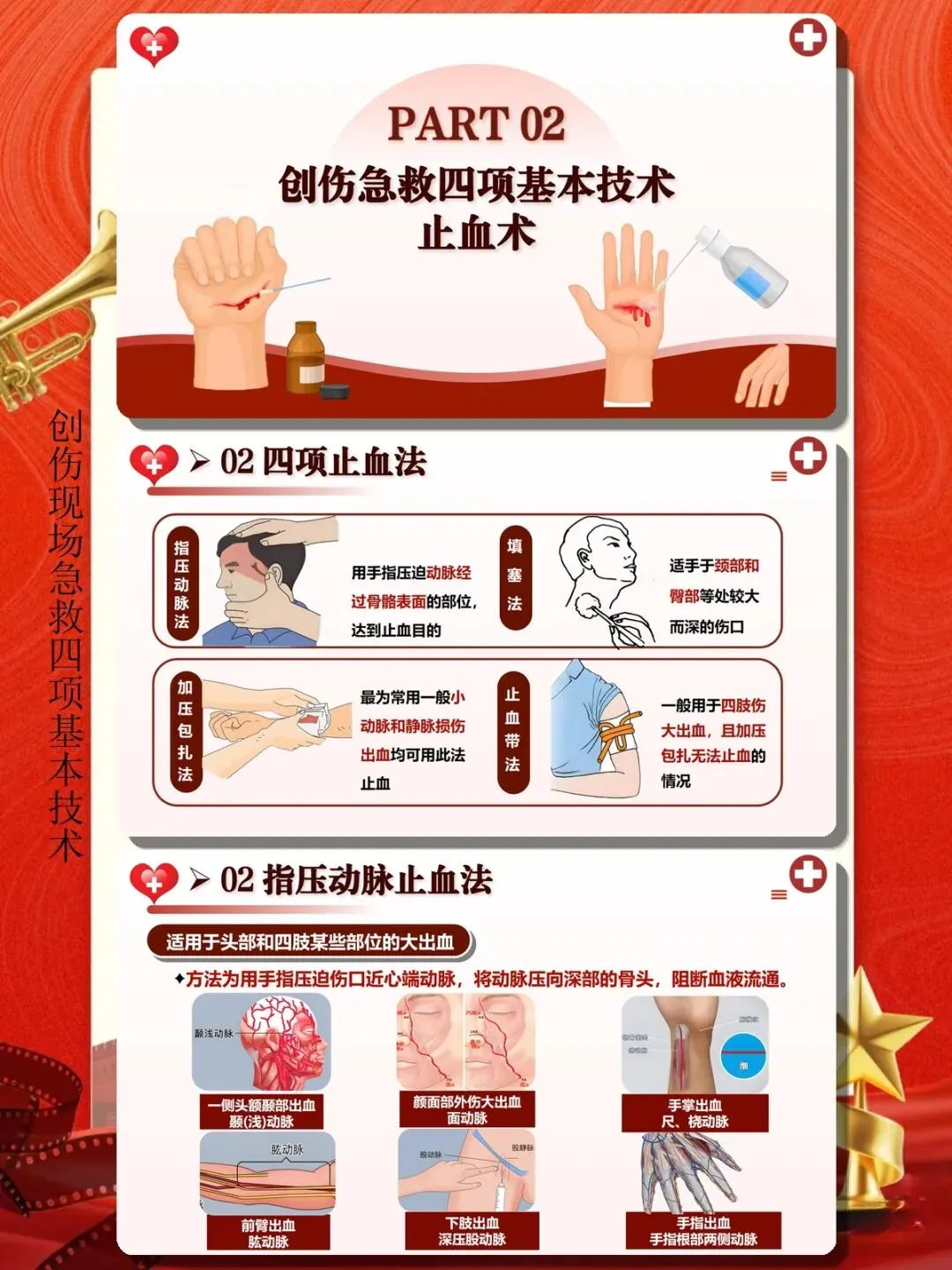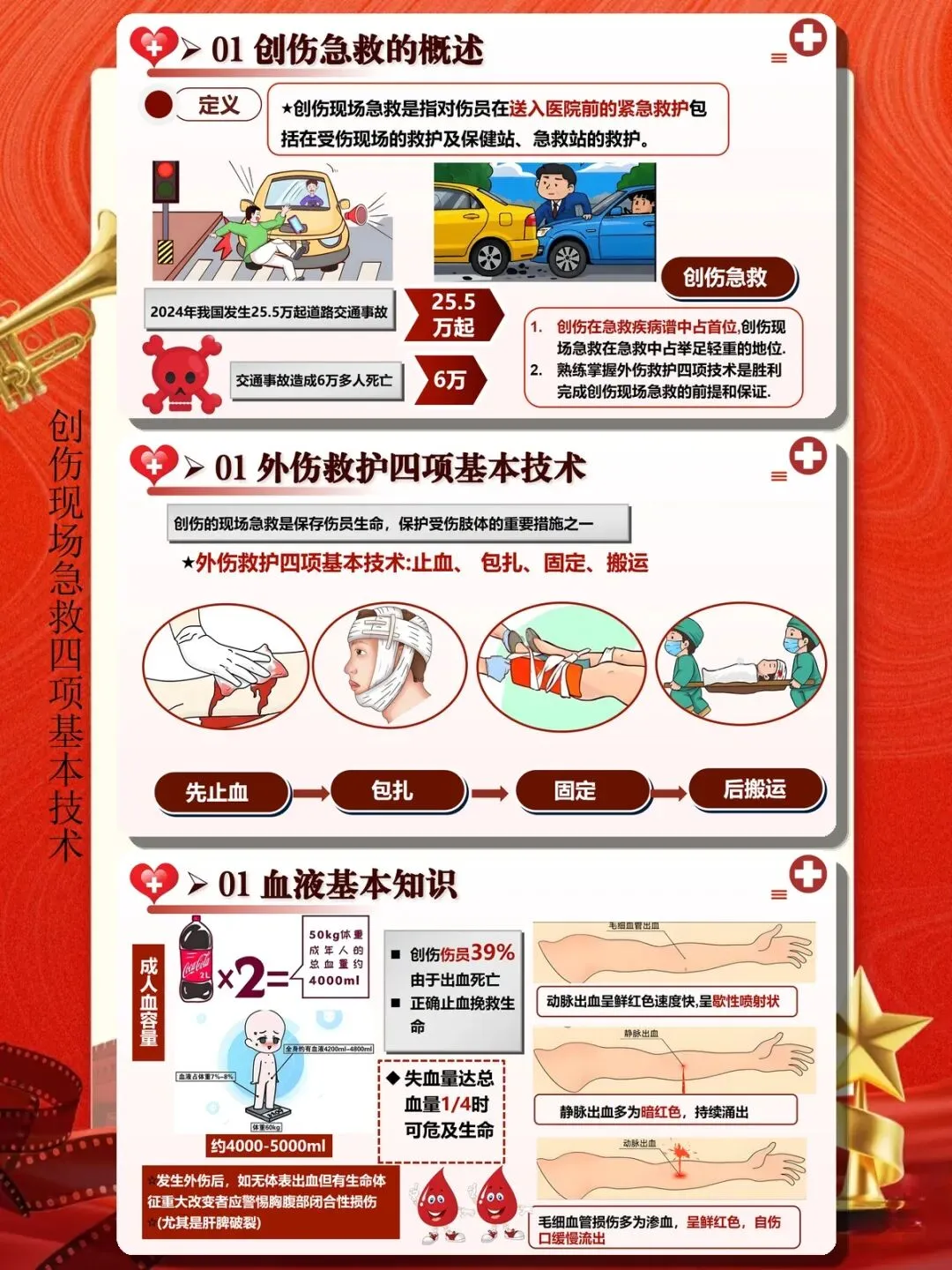 创伤是全球范围内致残致死的主要原因之一,严重创伤后的黄金救治时间极为有限,现场急救的及时性和规范性直接决定患者的生存概率和预后质量。止血、包扎、固定、搬运作为创伤现场急救的四项基本技术,是每一位医护人员必须熟练掌握的核心技能。一、止血技术:控制出血是挽救生命的第一步