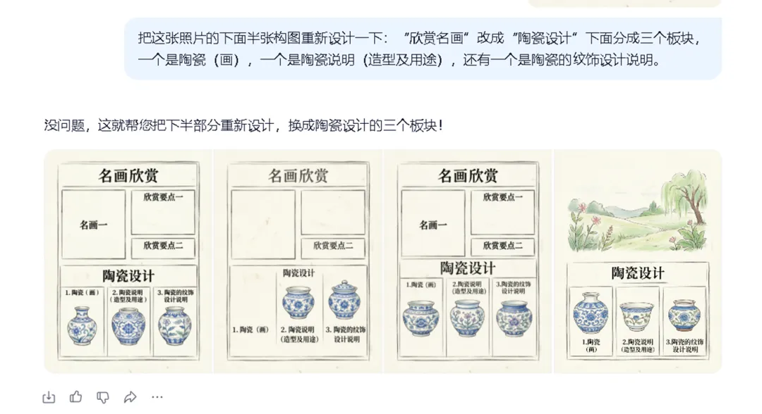 当我让千问画那个手抄报框架结构图时,它居然第一时间就理解了我的意图,给出了一个清晰的框架。当然,它也不是完美的。生成图里的文字和图画位置有些错位,我让它修改,来回拉扯了好几遍,有的地方改过来了,有的还是有点“倔强”。