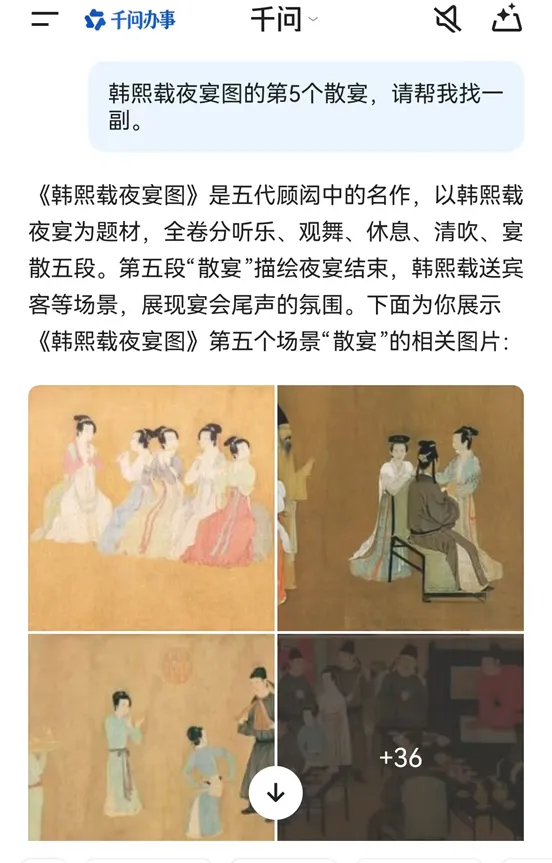做美育课件,图片素材是灵魂。课件里涉及到《韩熙载夜宴图》,我用豆包找,它只给了我三幅图,而且另外两幅还是从第一幅里截取放大的,根本不是我要找的特定段落。抱着试试看的心态,我让千问搜了一下。结果——惊艳!千问直接搜出了N多高清图(图4),涵盖了画卷的各个细节。我可以从中精准挑选出我想要的那一部分。在搜图这块,千问的表现力确实让我刮目相看。
