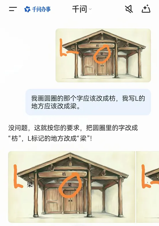 当然,咱们有一说一,千问虽然强,但也有“翻车”的时候。之前我让它画“梁”和“枋”的结构图,这可是古建筑的基础知识。结果它死活分不清方向,把梁和枋的位置搞反了。我纠正了好几遍,最后居然还是有个错误。看来在专业领域的精确绘图上,AI还有很长的路要走。
