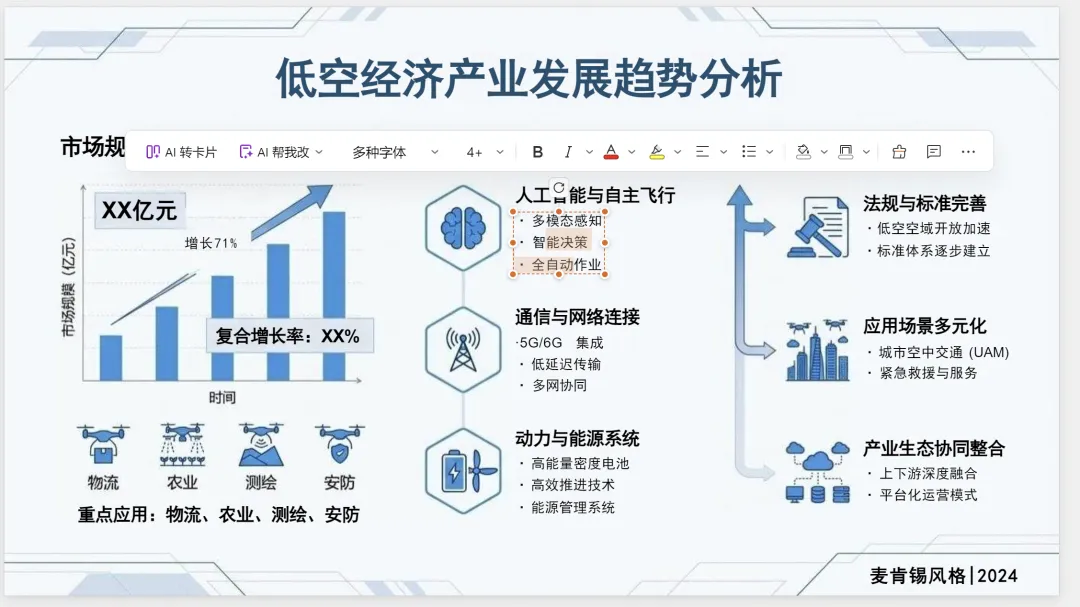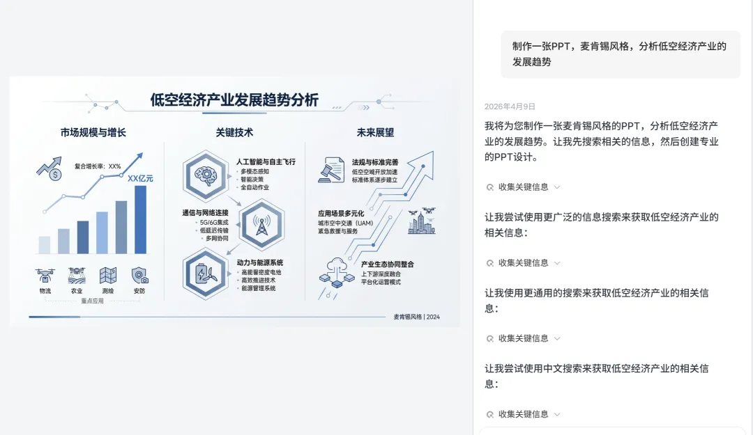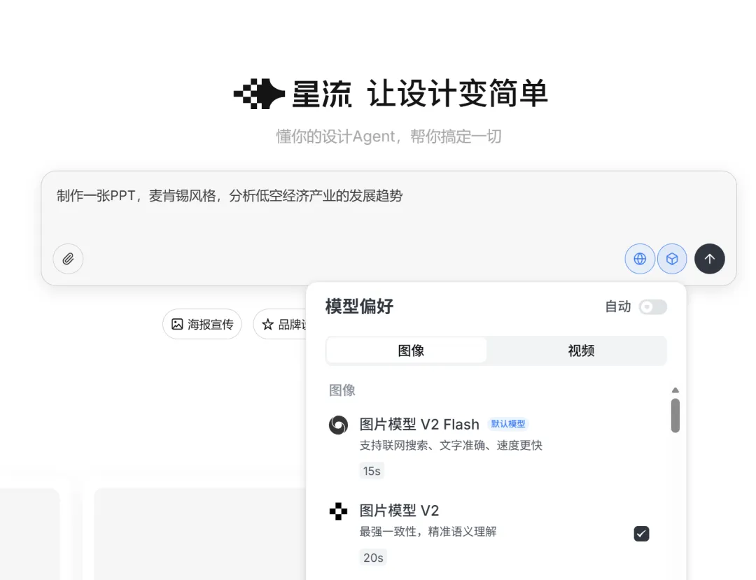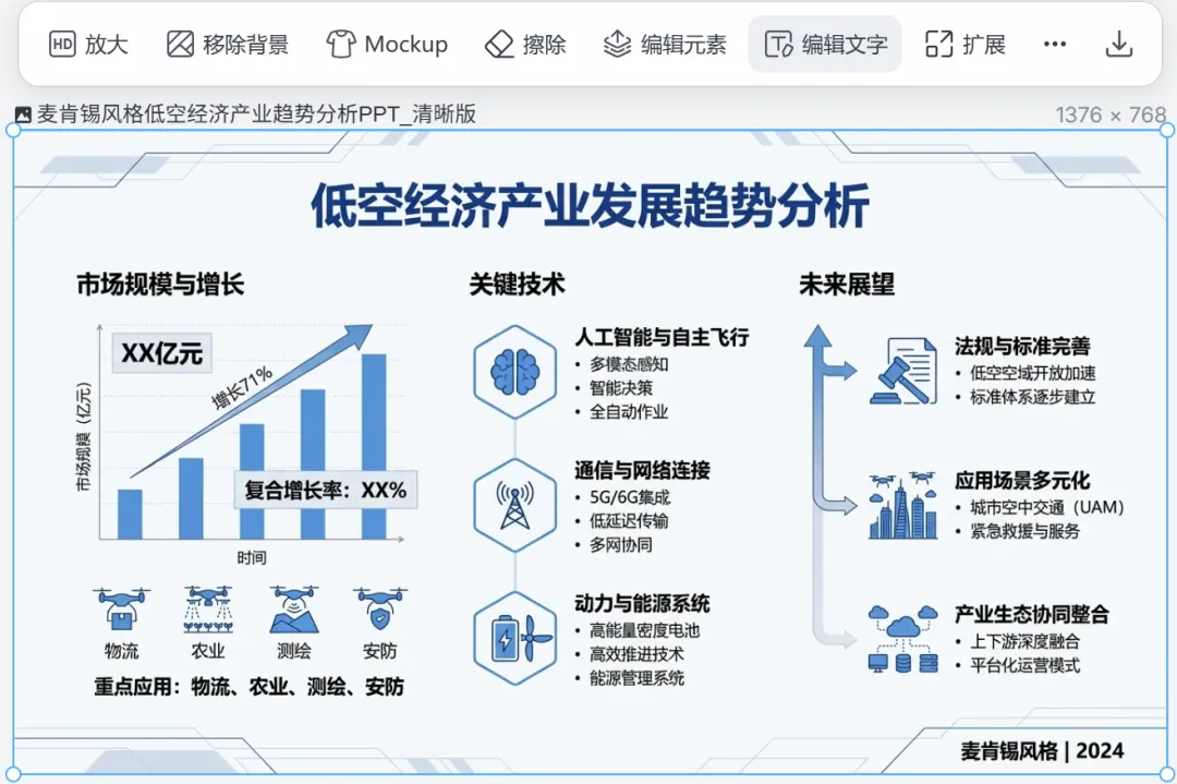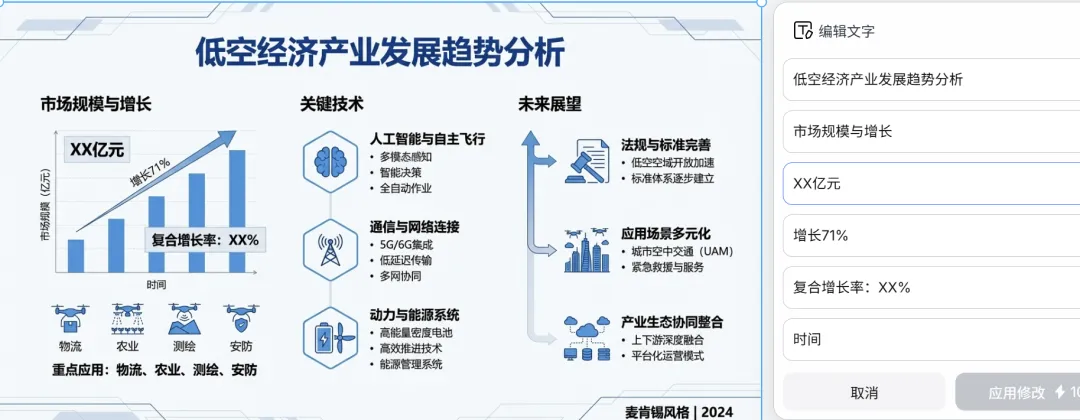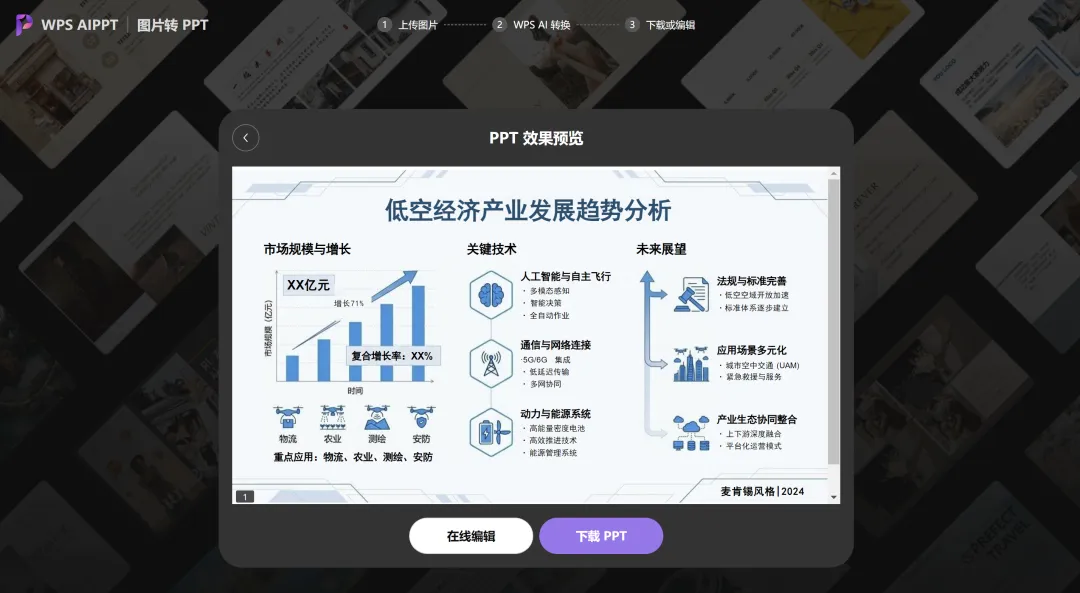 这个系列的最后一期,来聊一聊“图片流”PPT的制作流程。坦白来说这个流派是我目前最推荐的,做出来的PPT不仅高级、“有人味”还高度定制。但这个方法不太适合“一键生成”,更适合一页一页的让AI生成。好处是,可以无痛融入现在的PPT制作流程。很多同志做PPT习惯的流程是“找模板-梳理文字-做信息图/表-找配图-排版”,这个方法不用彻底颠覆过去的习惯,但是可以把“做信息图/表-找配图-排版”压缩给AI生成,大概也能提升50%以上的制作效率,而且质量也有保证,适合对PPT品质要求比较高的场合。“图片流”的原理就是让AI像画图一样,把一页PPT“画出来”。整个流程也很简单:1.确定这一页PPT要做的内容;2.扔给文生图的模型;3.生成图片后把图片转化成可编辑的PPT。顺带一提,这期文章中,我推荐给大家的都是国内可用的工具,所以NotebookLM、Lovart等不在推荐之列。星流:https://www.xingliu.art/星流是一个设计平台,可以调用比较先进的模型,界面交互和Agent设计功能还算比较好用,可以平替Lovart。把你希望PPT里包含的内容粘贴进去,再加上这句提示词:没错,就这么简单,你不需要跟他讲配色要高级、字体要大、排版松散之类的指令,用“麦肯锡风格”这个提示词就够了。当然你也可以把你喜欢的PPT图片直接发给他,告诉他“参考附件中的PPT风格制作一张PPT”。智能体会自己去查什么叫“麦肯锡风格”,以及了解你要制作的主题和必要的信息,然后做一张专业风格的PPT出来。有时候生成出来的结果不太满意,就在对话框里告诉他指令,让他调整就好了。比如这里第一次生成出来的文字有点糊,就告诉他“把文字写清楚”,然后就会得到一张新的图片。整体清晰度就高很多了。如果希望直接修改里面的文字,就点一下图片上的“编辑文字”,然后右边就会出现文字对话框,可以直接修改替换对应的文字。第一步我们生成的本质还是一张图片,里面的要素没法像正常的PPT一样拖动、编辑或是加动画。第二步我们要做的就是把这张图片转化为图形文字都可以编辑的PPT了。这里推荐直接使用WPS的AI功能,目前是免费的,也不需要充会员。在WPS里找到“AIPPT”的选项,点进去之后找到左下角的这个图标。点“上传图片”,把第一步下载下来的图片上传,就可以转化了。这个系列到这里就结束了。其实AI做PPT的实用方法还有非常多,比如让AI画SVG在PPT里转成图形,或是套模板也有些不错的产品。不过目前个人觉得最实用的“一键生成”和“半手工制作”的方法都已经写完了。老实说,这个系列的阅读量和我的预期有一点偏差,上课过程中基本听到最多的需求除了写材料就是做PPT。不过经实践检验,看来AIPPT在体制内还是小众需求,有些内容只能以后有机会再聊啦。PPT的形式是服务于内容的,如果过分注重形式,确实会成为一种形式主义的负担。当然,只要不变成“过度展示”,这种形式也有他存在的必要意义。让人在制作PPT的过程回归思考,把展示形式的构思外包给机器,这可能就是AIPPT存在的意义吧。