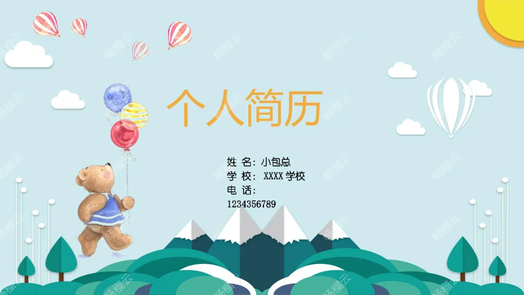 这是一份PPT演示文稿,内容围绕个人简历展开,包含姓名、就读学校、联系电话等个人基础信息,还设置了自我介绍板块,以及父母的姓名、工作单位和联系方式等家庭相关信息,适合用于求职或个人情况展示。