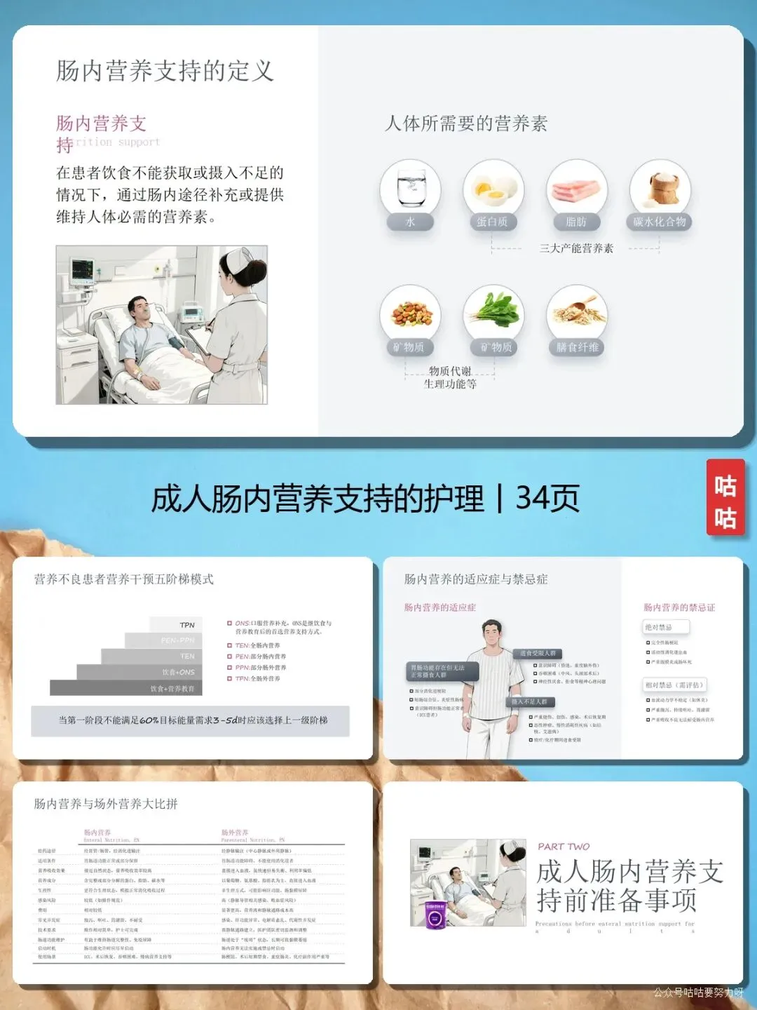 清晰展示肠内营养定义、营养素分类、适应症与禁忌症,附营养干预五阶梯模式对比。