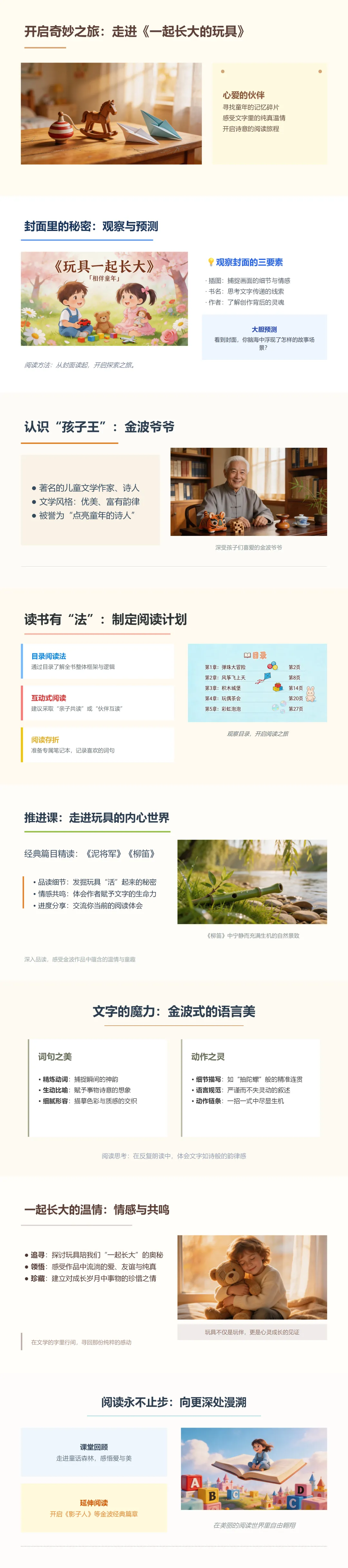 刚才我们走进了玩具的内心世界,感受到了那份细腻的情感。其实啊,这些情感之所以能打动我们,全是因为金波爷爷文字里蕴含的魔力。这一页,我们要一起去领略金波式的语言美。