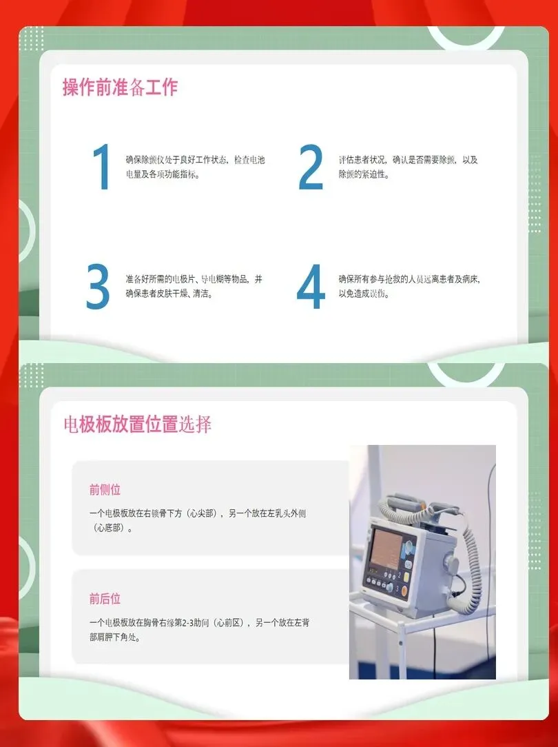 使用除颤仪前必须完成三项关键确认。首先是设备状态检查,确认除颤仪电量充足、备用心律、导电糊或电极片完好无损。其次是环境安全确认,确保现场无易燃易爆物质、操作者与患者均未接触金属导体。最后是患者状态评估,确认患者为无意识、无自主呼吸或呼吸异常,心电图显示可除颤心律。
