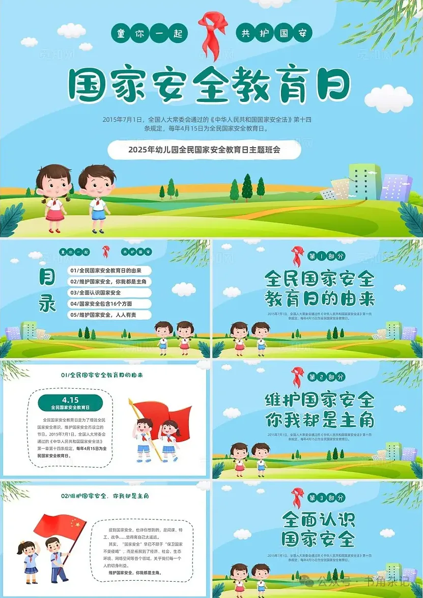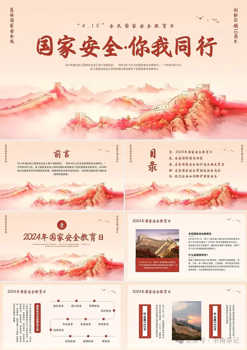 今天为大家整理了10套可直接使用的全民国家安全教育日主题PPT模板,适用于多种宣传教育场景,提供网盘打包下载,以下为部分预览图展示,完整可编辑电子版可免费保存