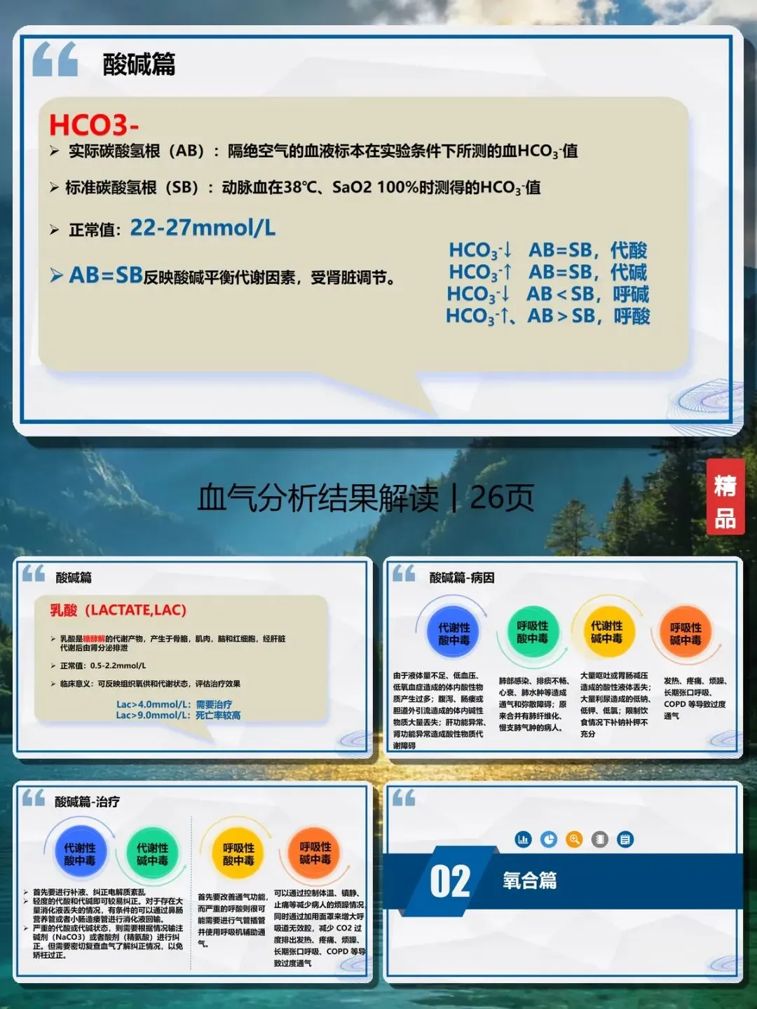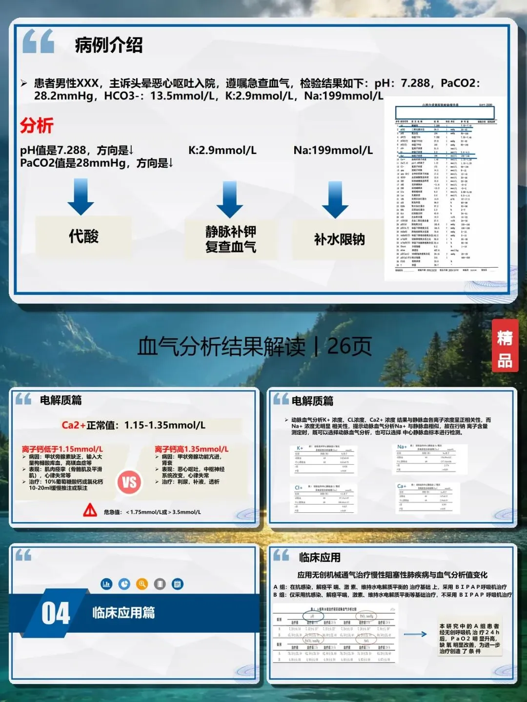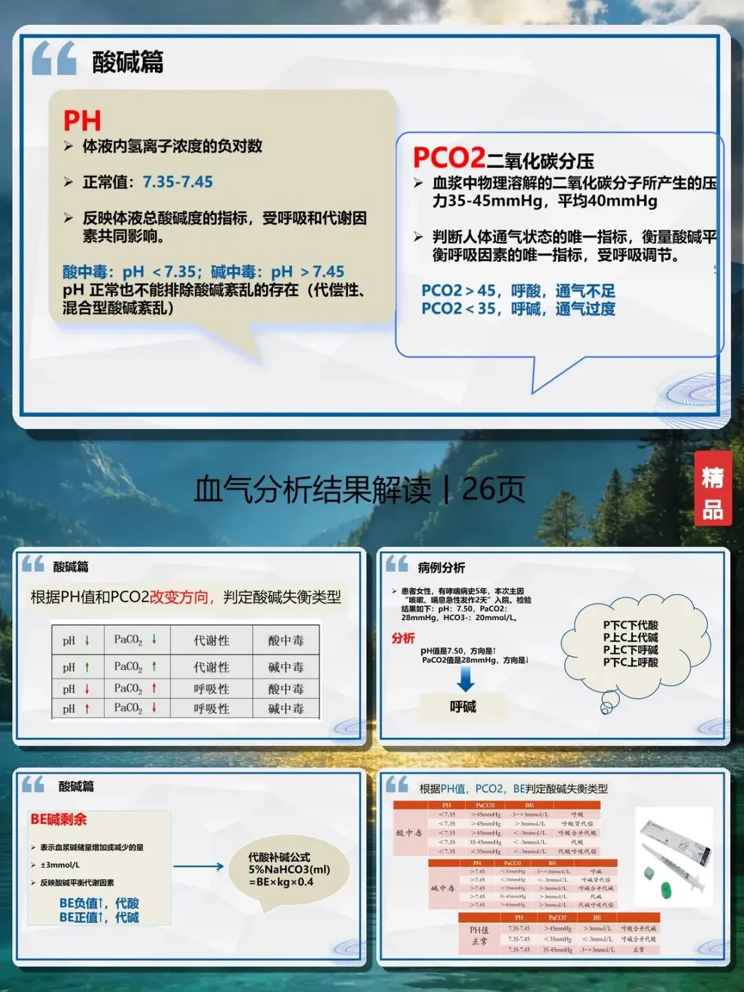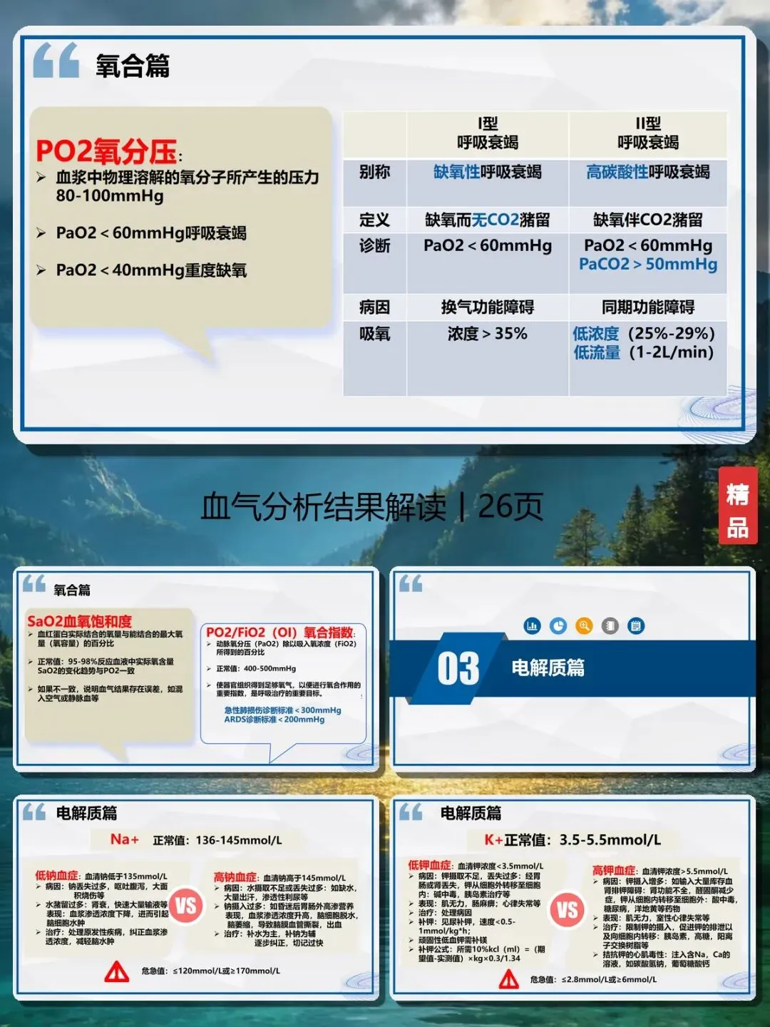 首先我们要知道,血气分析最核心的作用是评估身体的呼吸和循环状态,帮医生判断有没有缺氧、呼吸衰竭,以及体内的酸碱和电解质有没有失衡。报告里的指标主要分三大类:第一类是酸碱相关的,比如pH值正常范围在7.35到7.45之间,太高可能是碱中毒,太低则是酸中毒;还有二氧化碳分压这个指标,能直接反映我们的肺部通气情况。第二类是氧合相关的,氧分压低于60mmHg就说明存在呼吸衰竭,血氧饱和度则代表了血液里实际携带的氧气量。第三类是大家比较熟悉的电解质,包括钠、钾、钙离子,这些指标异常轻则会引起乏力、恶心,重则可能导致心律失常甚至危及生命。