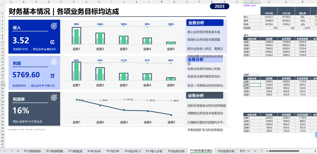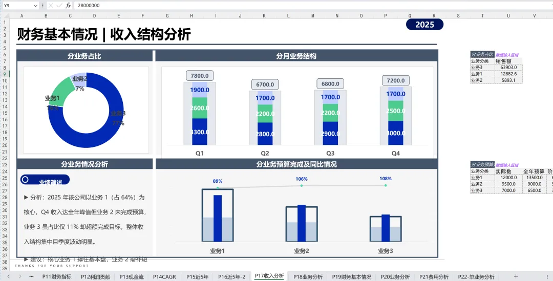 - 蓝绿色是《2025财务工作总结报告》里的数据部分,里面的每一页都包含在EXCEL版套表中,方便整理核对数据。 同时也是一套可复用的模板 可以关联Excel和PPT同步更新