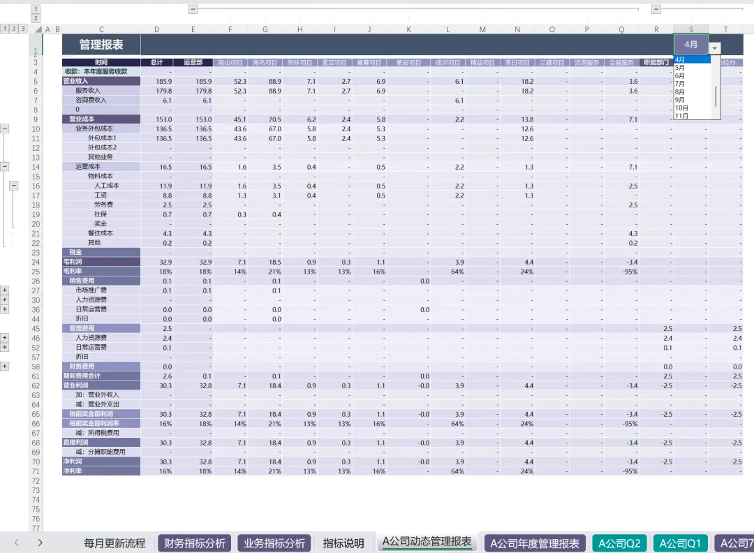 这是模型的核心。在此区域建立标准的报表结构(如管理用利润表结构)。