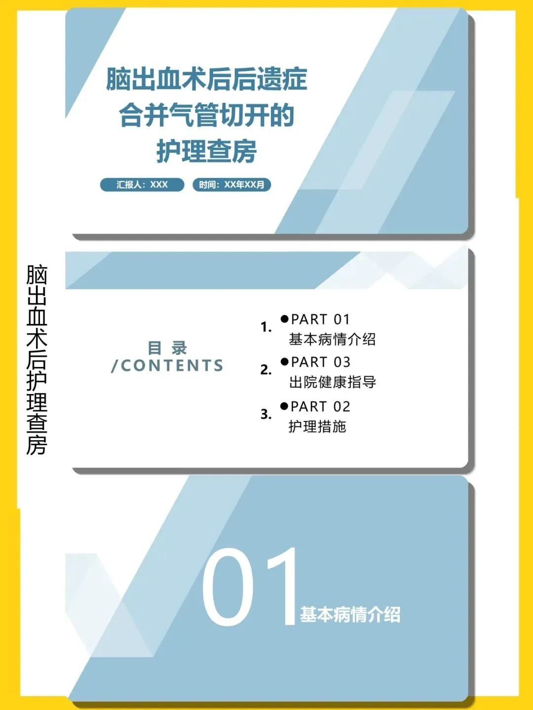 脑出血术后合并气管切开护理查房ppt模板,共16页(附演讲稿)