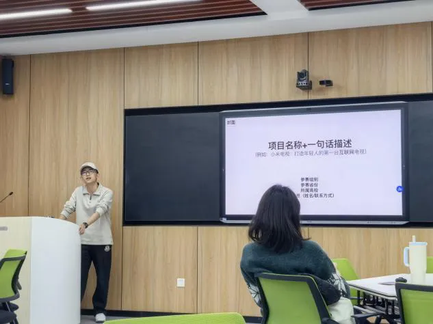 讲座伊始,高宇歌同学以路演PPT的封面设计为切入点,强调了“项目名称+一句话描述”的核心重要性。他以“小米电视:打造年轻人的第一台互联网电视”为例,直观展示了如何用一句话精准提炼项目核心价值,让评委在3秒内抓住项目亮点,同时明确了参赛组别、所属高校、联系方式等基础信息的规范呈现方式,为同学们搭建了路演PPT的开篇框架。