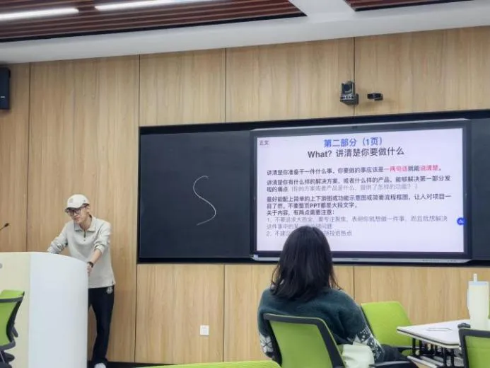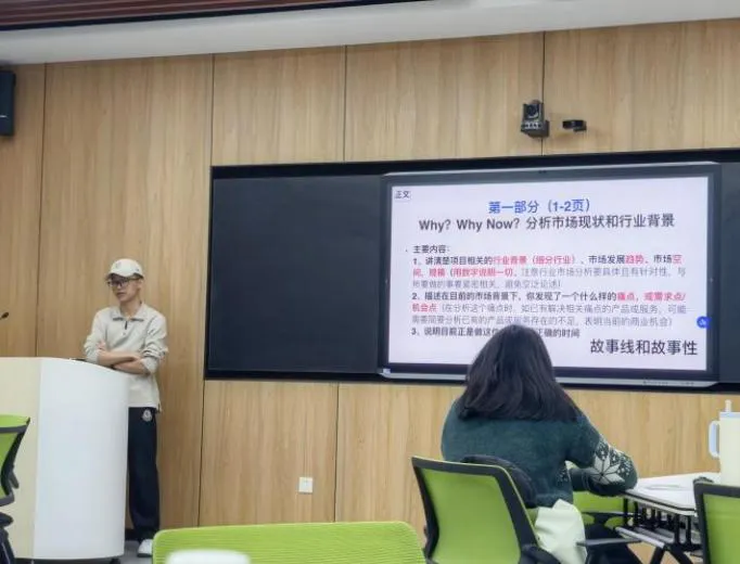 随后,高宇歌同学围绕路演PPT核心结构,逐一拆解商业路演底层逻辑与呈现技巧,从市场分析、项目核心、核心优势、项目团队四大模块展开讲解,细致说明各模块的撰写重点、呈现方式与核心注意事项,为同学们理清了路演PPT完整的制作思路。