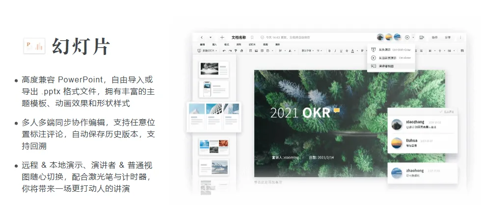 优点:支持多人实时在线编辑,修改内容即时同步,无需反复传输文件,团队成员可随时查看修改进度,还能通过评论、批注功能沟通修改意见,大幅提升协作效率;云端自动保存,无需担心文件丢失,支持链接分享,方便课件审核和传阅;界面简洁,操作无难度,零基础用户也能快速上手;内置简洁版消防模板,满足基础课件制作需求,支持多格式导出,适配线下宣讲、线上培训等不同场景。