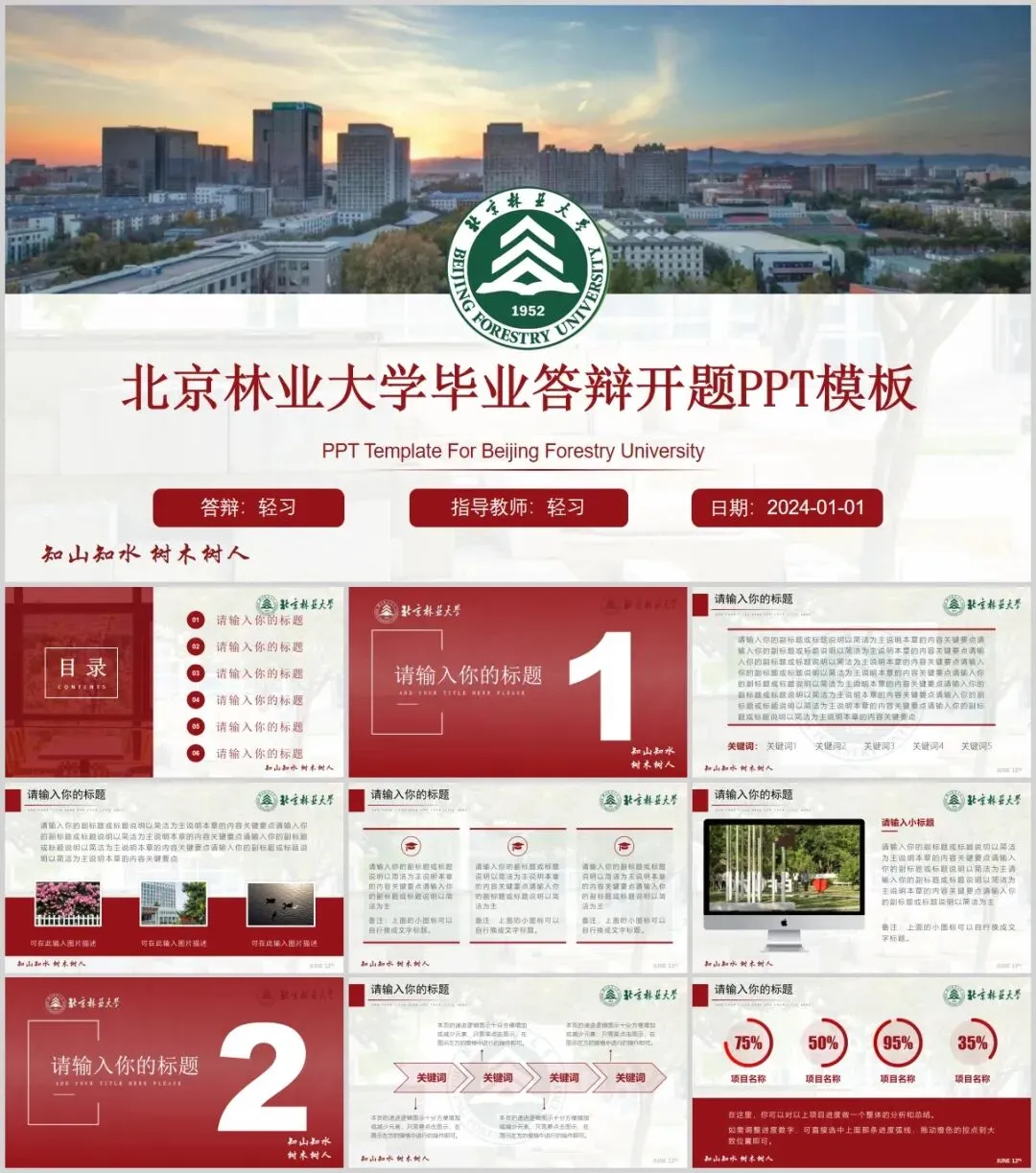 包含了高校专属校徽,100+套精选PPT,正式大气中又不失高级活泼,很能展现个性与品位,适用于各种毕业答辩、总结汇报、活动策划、个人简历、宣传推广等场合。快快收好! 知山知水 树木树人